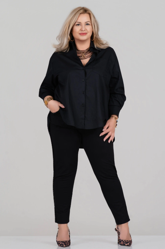 При избора на дрехи големи размери заложете на сатенени или памучни ризи с V-образно деколте – то издължава силуета и придава лекота на визията. Завършете с елегантни обеци или колие.