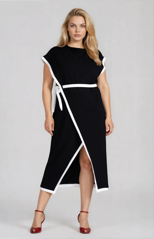 Прав силует с вертикални елементи: Вертикални шевове, цепки или контрастни панели визуално издължават фигурата.