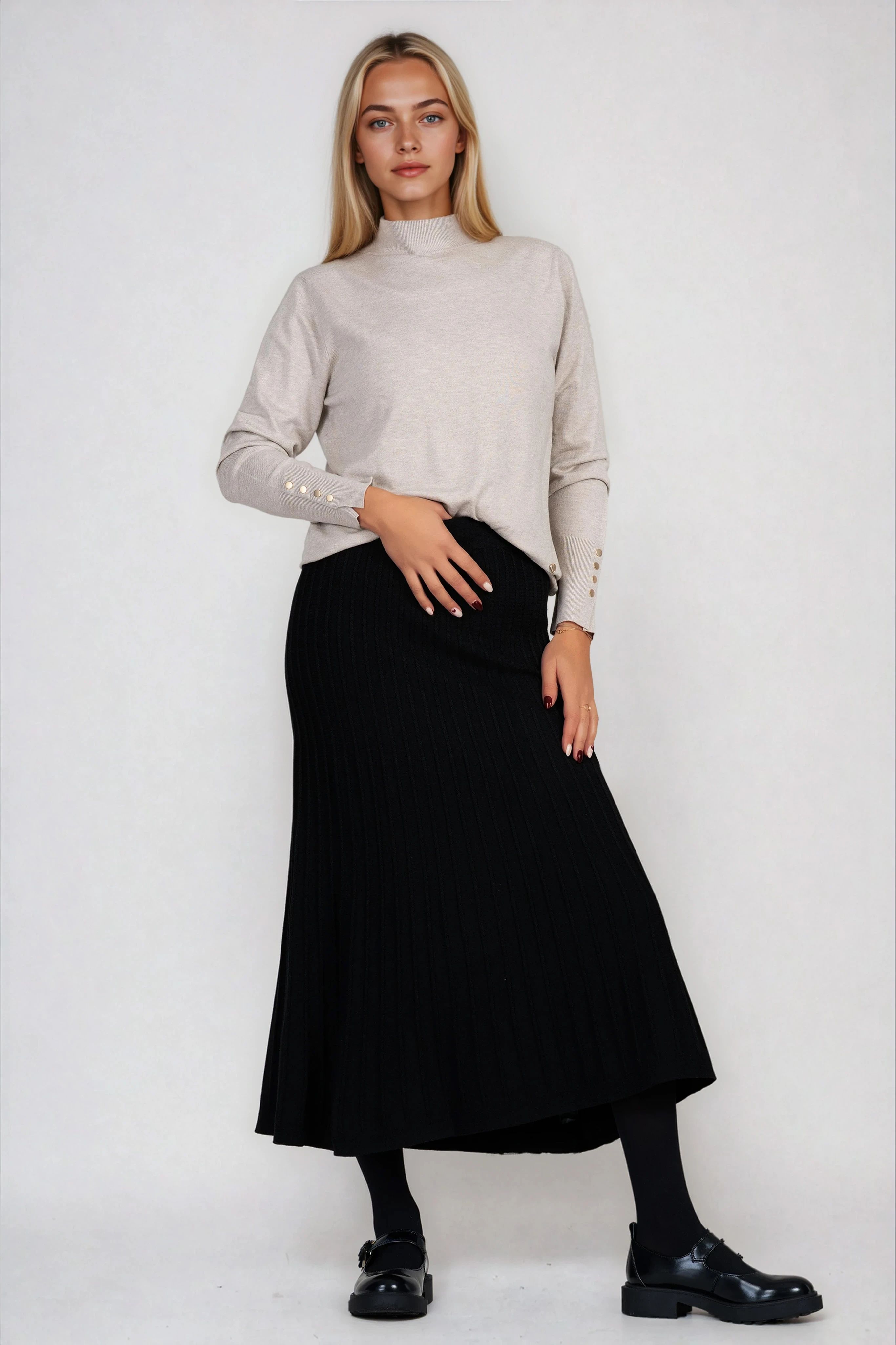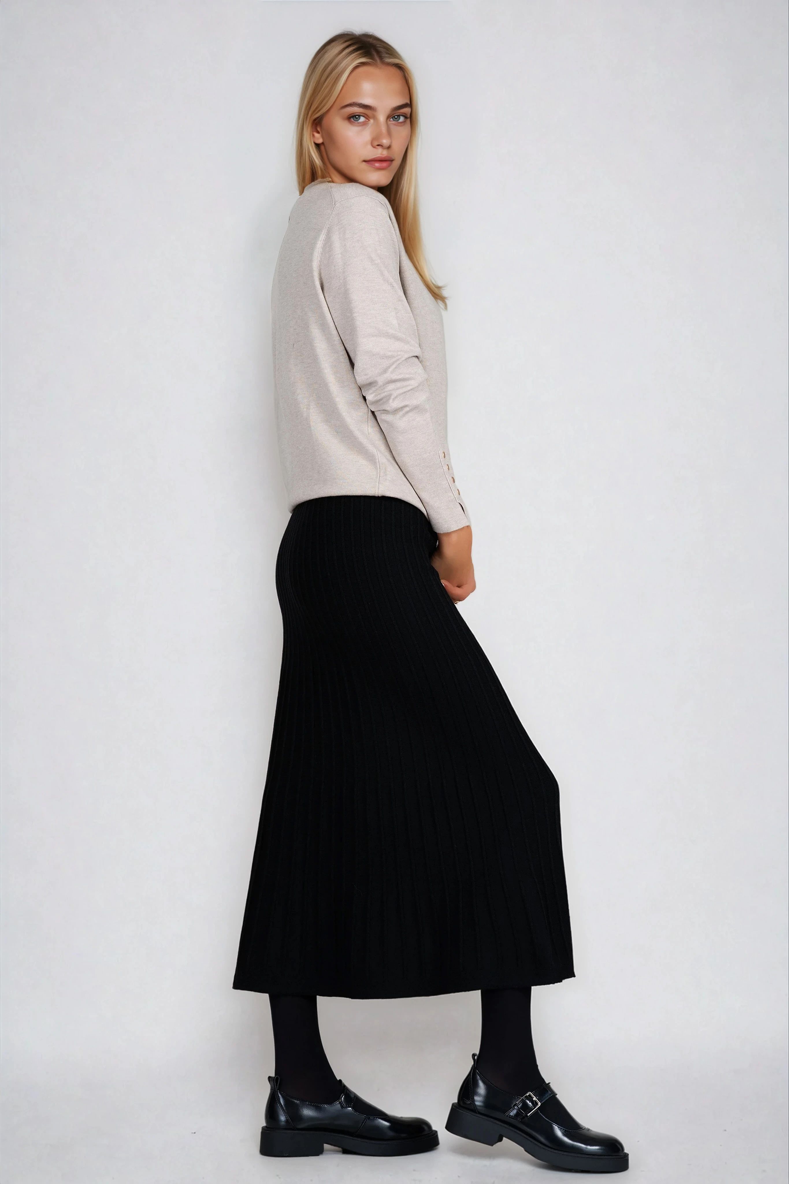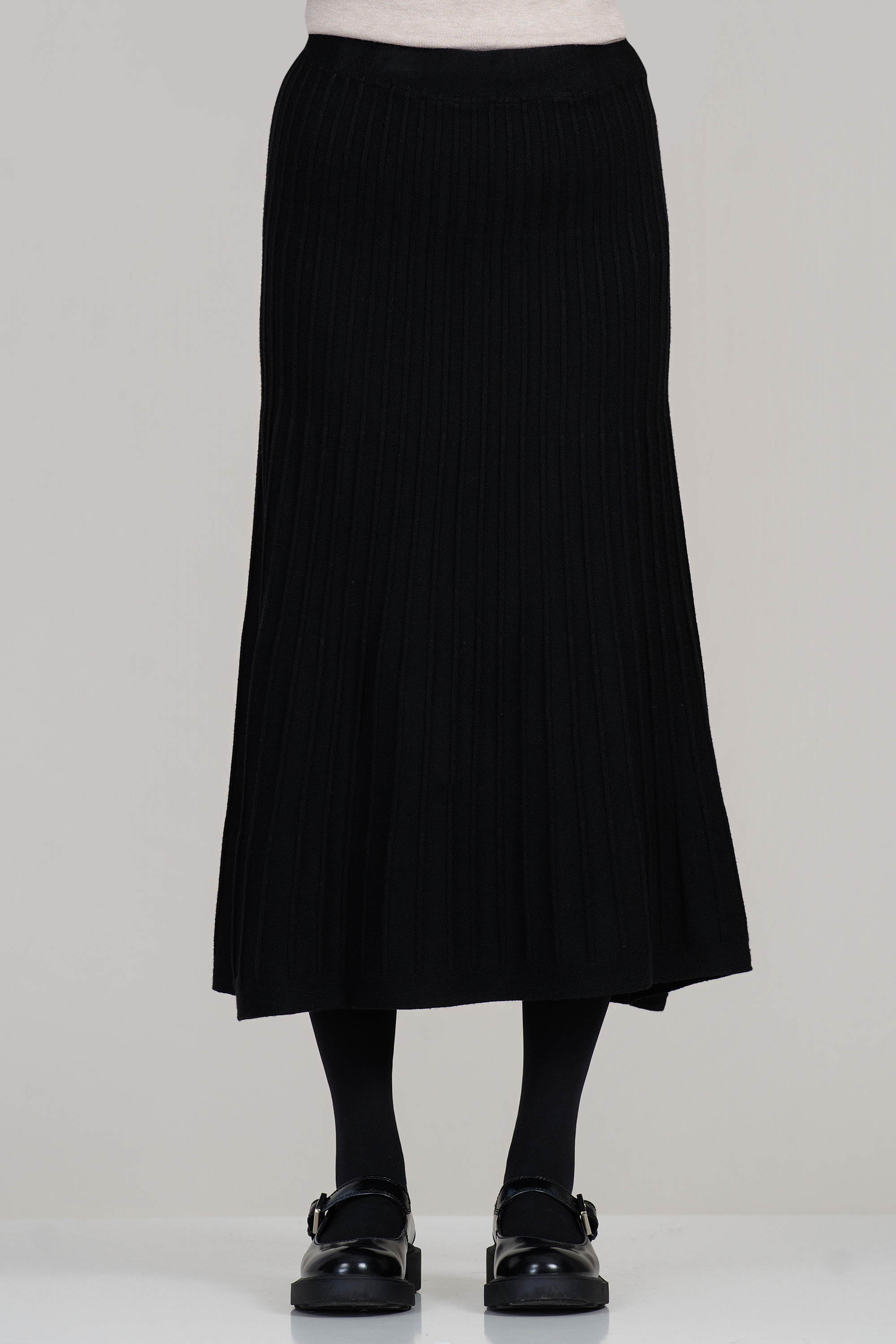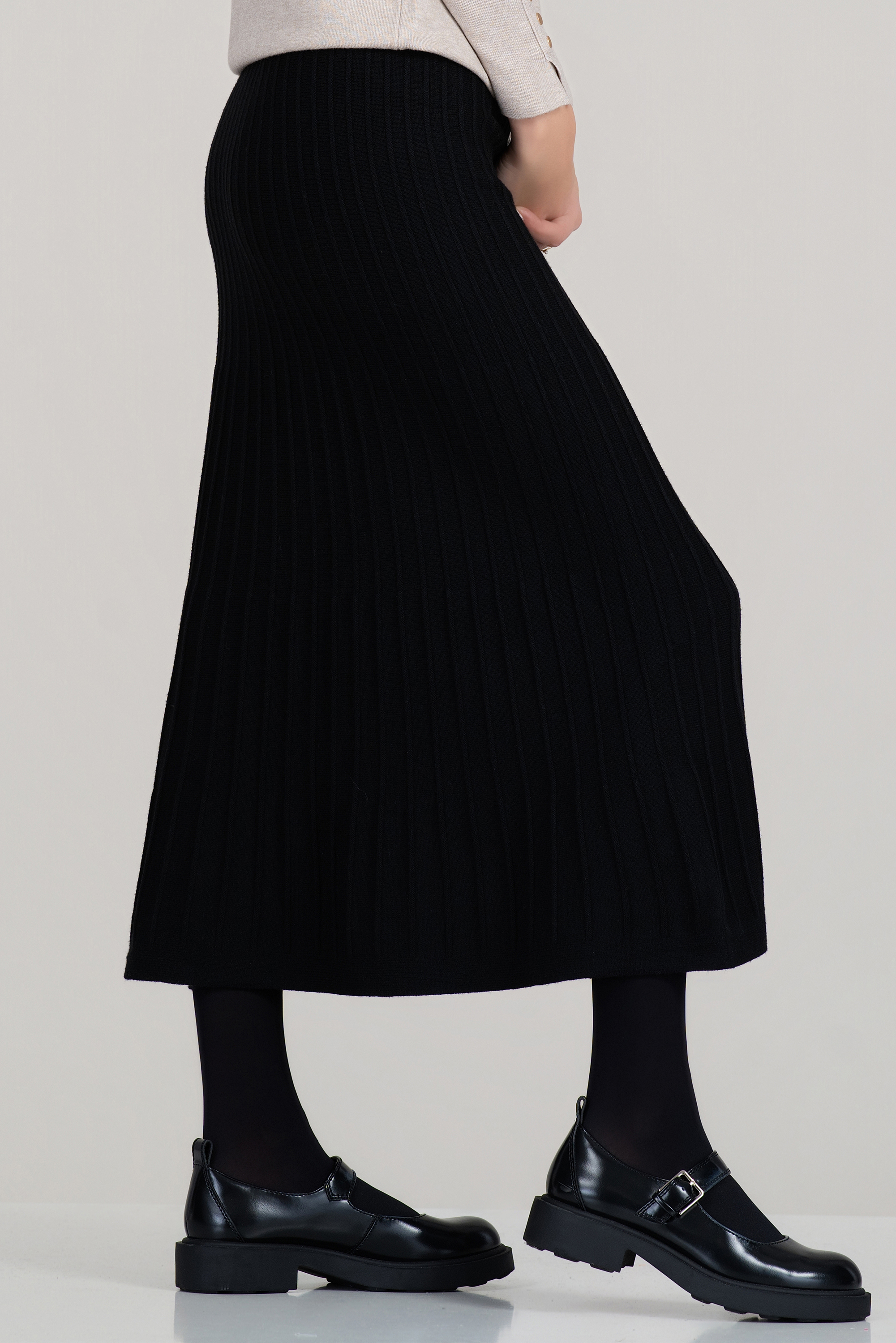 Семпла, но изключително елегантна, тази черна пола от плетена текстура е подходяща за хладните сезони. Еластичният рипс осигурява комфорт и адаптивност, докато вертикалните плисета придават модерна и издължена визия. Моделът е лесен за съчетаване с различни топове и връхни дрехи.