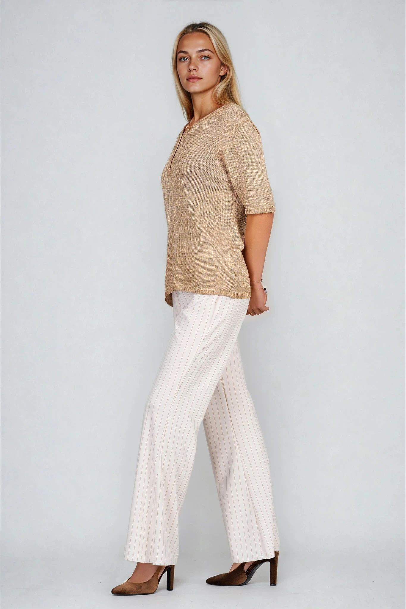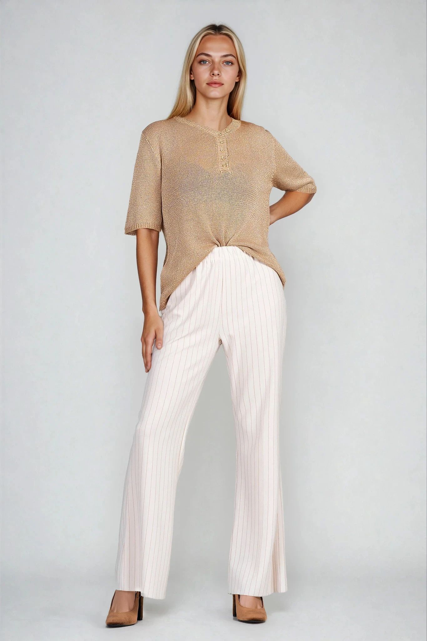Изискана и удобна блуза с нежен блясък от ламе нишки, придаващ леко сияние на визията. Деколтето е оформено с декоративна платка и копчета, които подчертават елегантната линия. Фината плетка и неутралният бежов цвят я правят подходяща за офис, ежедневие и пътуване.