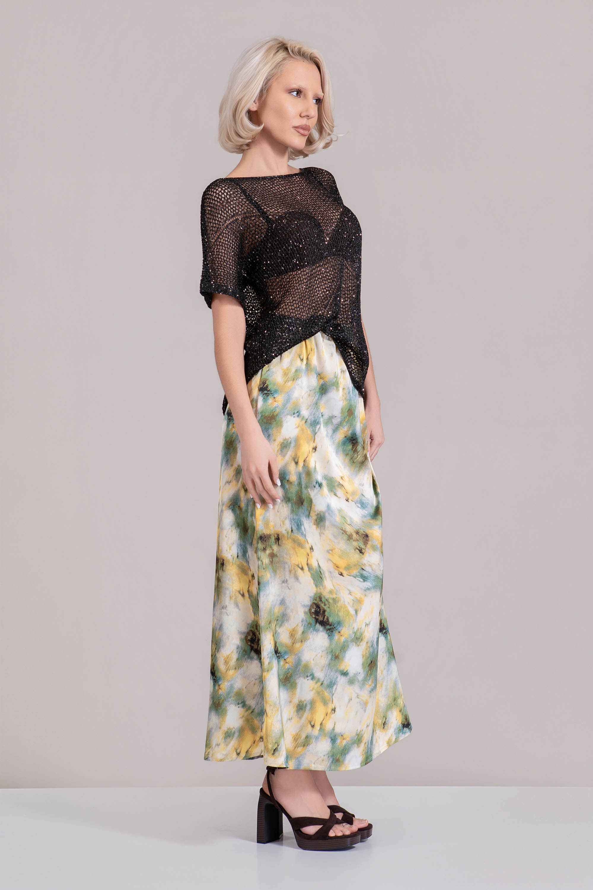 Тази елегантна блуза от черно плетиво е съчетание от комфорт и стил. Лекото ламе придава изтънчен акцент, подходящ за делнични и вечерни визии. Плетката на дупки и класическото деколте я правят универсален избор запреходните сезони.