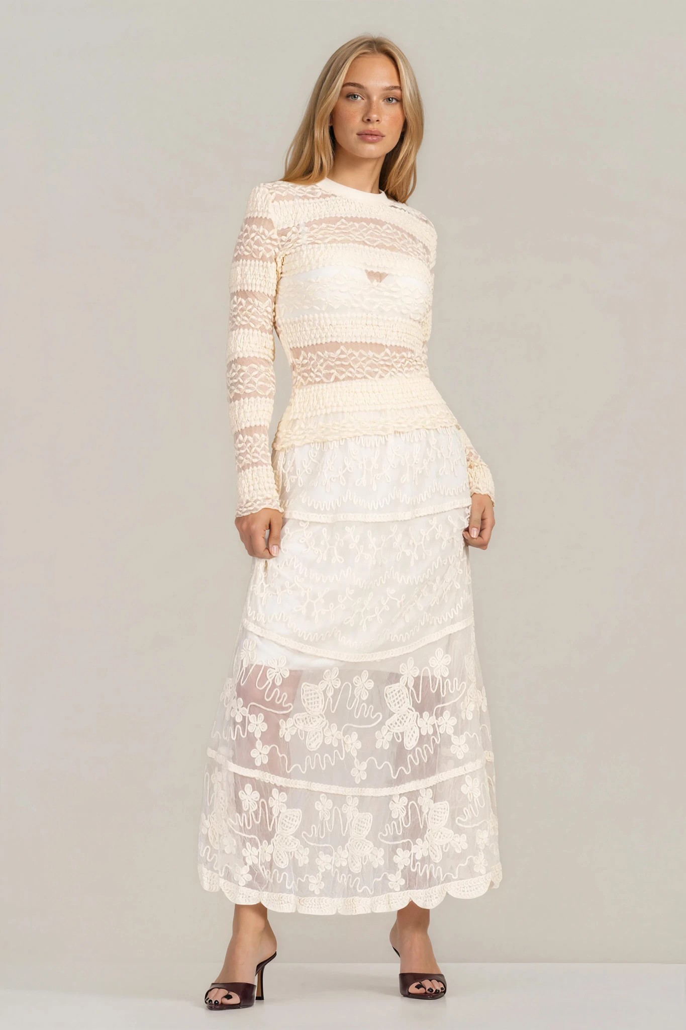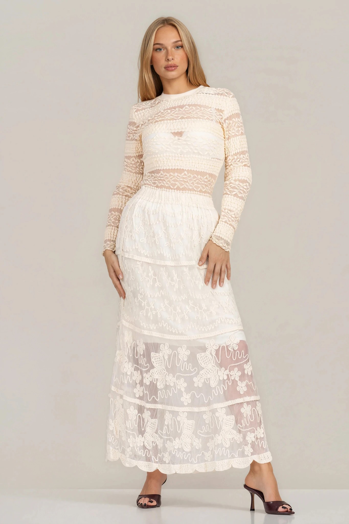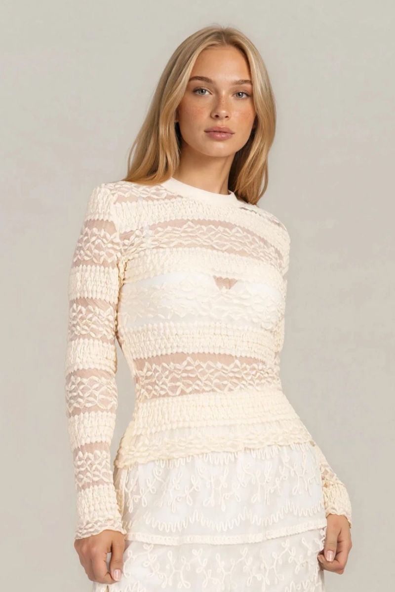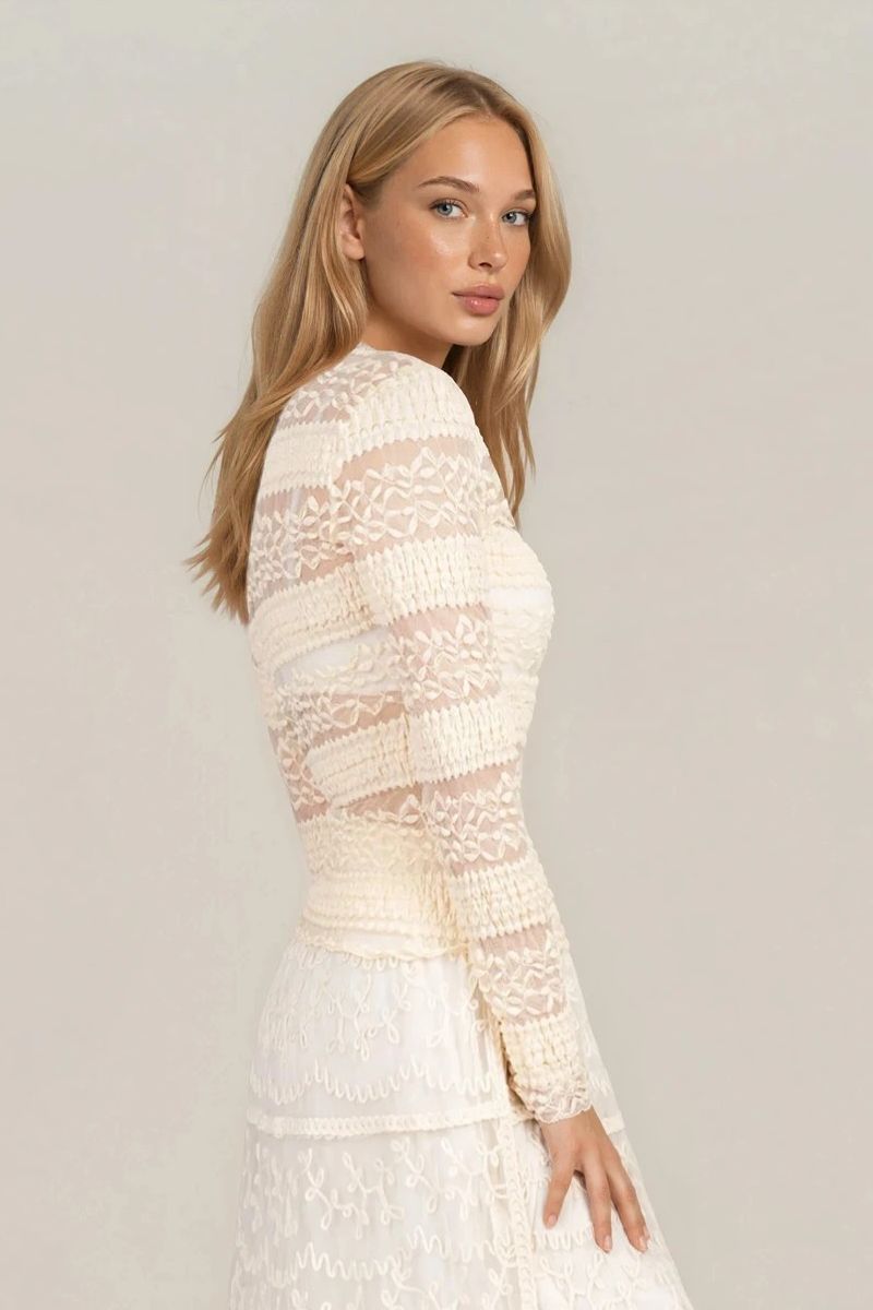 Дамска блуза от еластична материя в цвят екрю с бродирана дантела