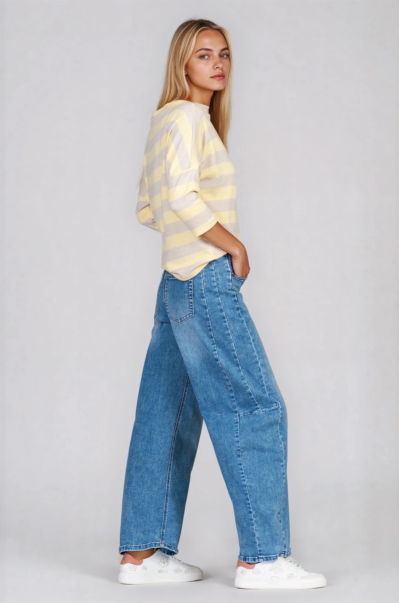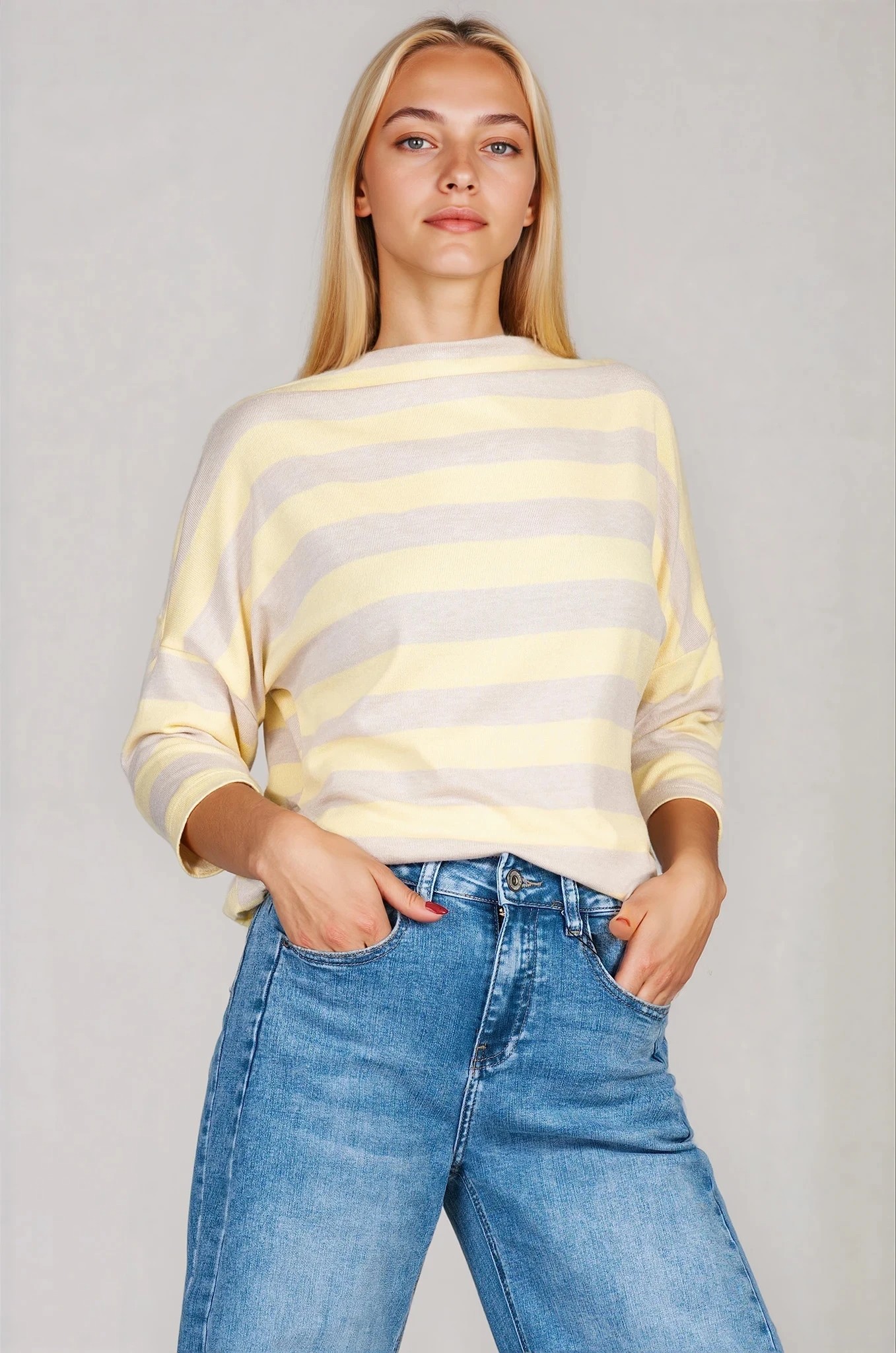 Елегантна туника с фино райе в жълто и бежово, която съчетава комфорт и стил в ежедневието. Материята с вискоза е мека и приятна на допир, с лека еластичност за по-добро прилягане и свобода на движение. Свободната кройка и 7/8 ръкавите оформят балансиран силует, а лодка деколтето подчертава линията на раменете. Подходящ модел за пролетно-летния сезон, който лесно се комбинира с деним или изчистен панталон.