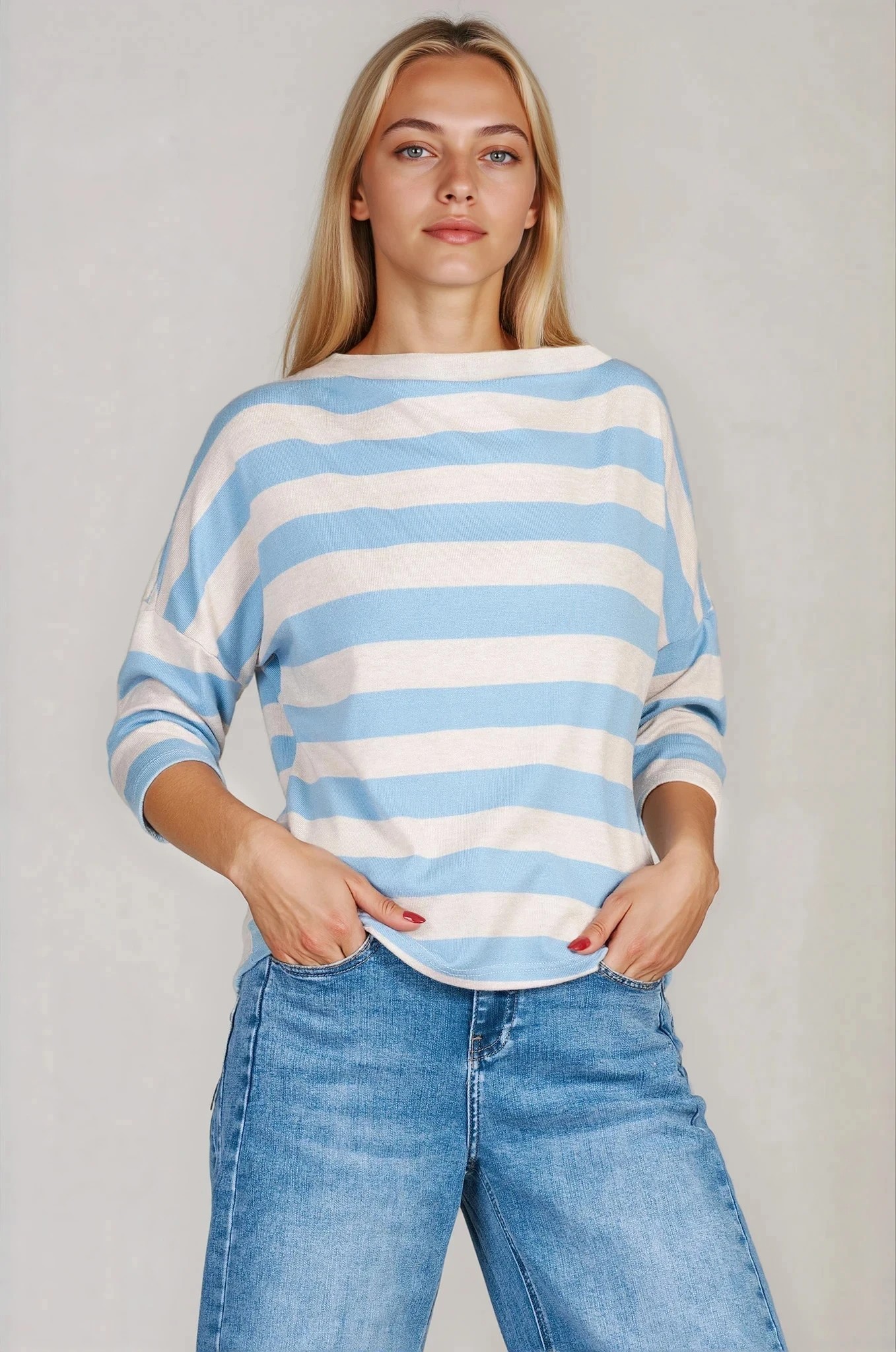 Елегантна туника с фино райе в синьо и бежово, която съчетава комфорт и стил в ежедневието. Материята с вискоза е мека и приятна на допир, с лека еластичност за по-добро прилягане и свобода на движение. Свободната кройка и 7/8 ръкавите оформят балансиран силует, а лодка деколтето подчертава линията на раменете. Подходящ модел за пролетно-летния сезон, който лесно се комбинира с деним или изчистен панталон.