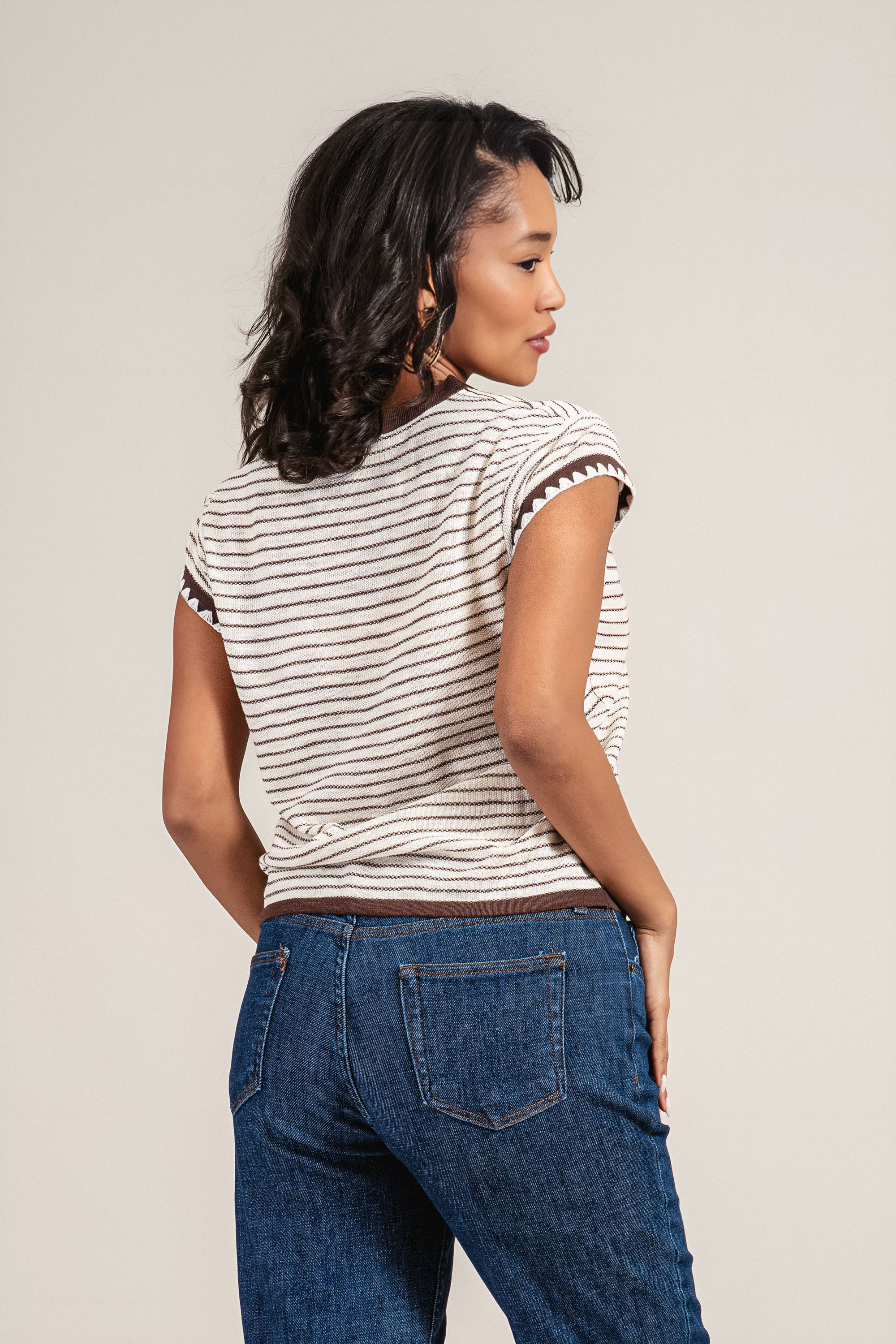 Елегантна блуза от фино плетиво с високо съдържание на вискоза, което осигурява мекота, естествено усещане и отлична проветривост. Добавеният еластан придава комфортна еластичност и добро прилягане към силуета. Моделът е с обло деколте и контрастни кафяви кантове, които подчертават линията на раменете и придават завършен вид. Черно-бялото хоризонтално райе създава класическа визия, подходяща както за офис среда, така и за ежедневни градски комбинации през пролетно-летния сезон.