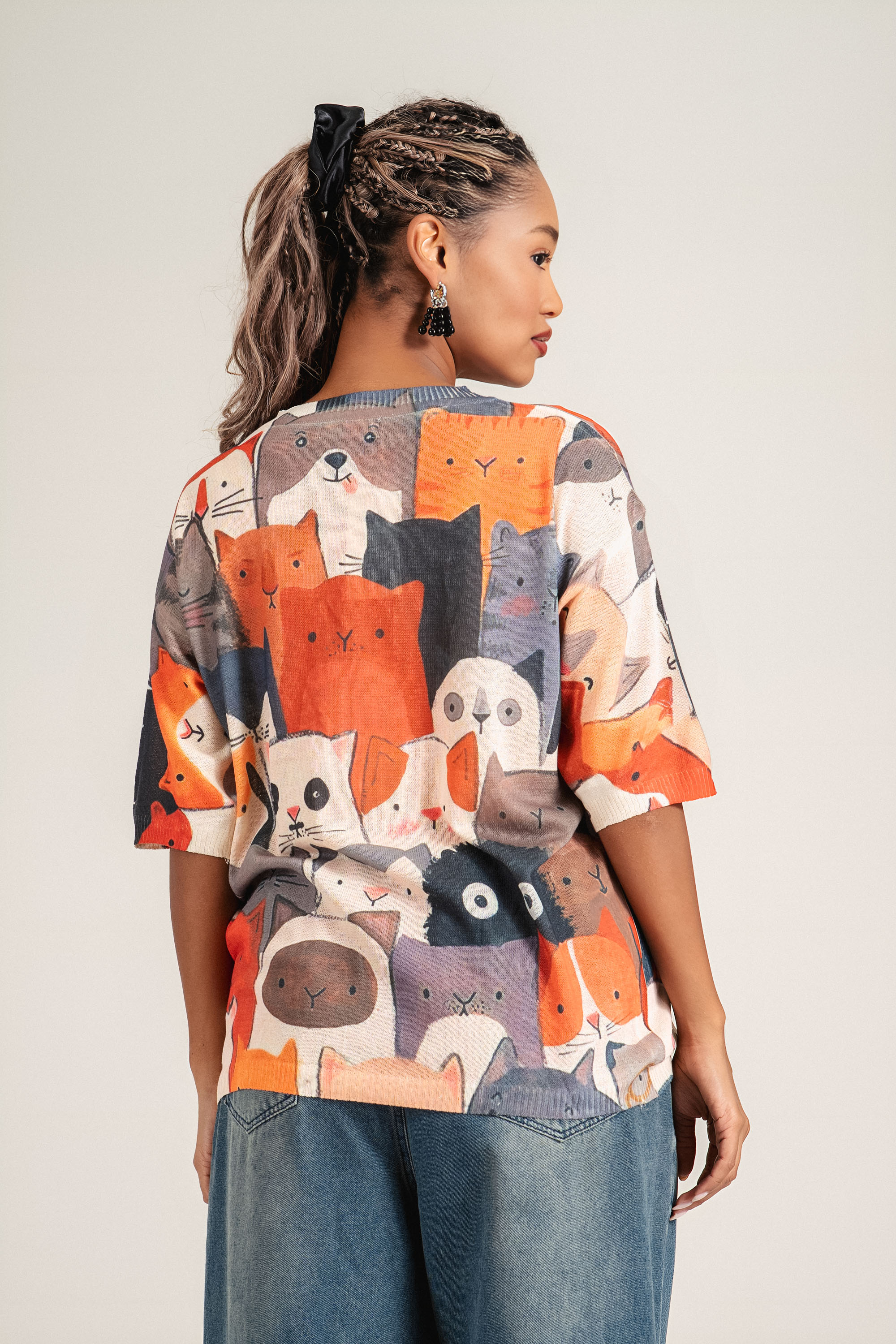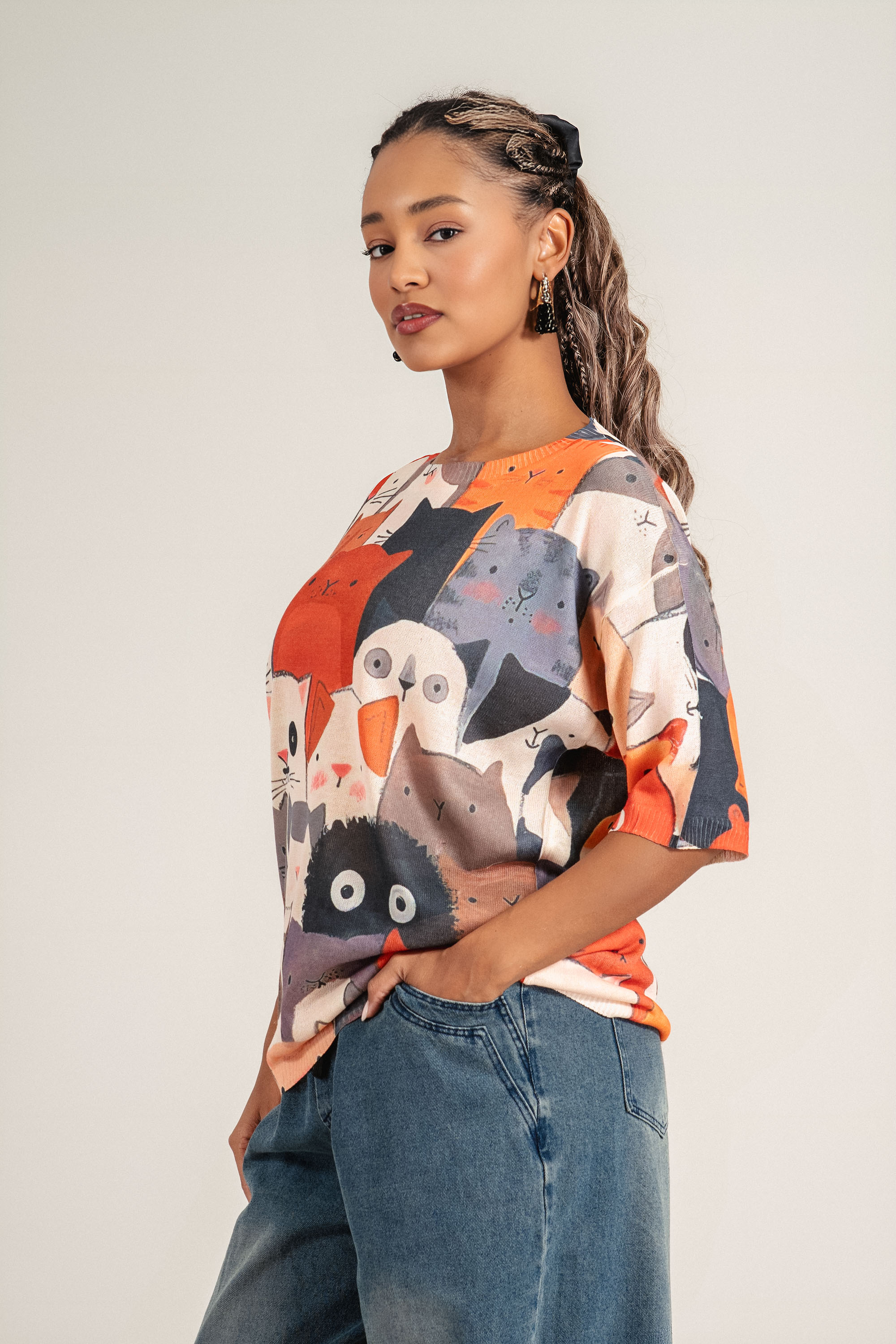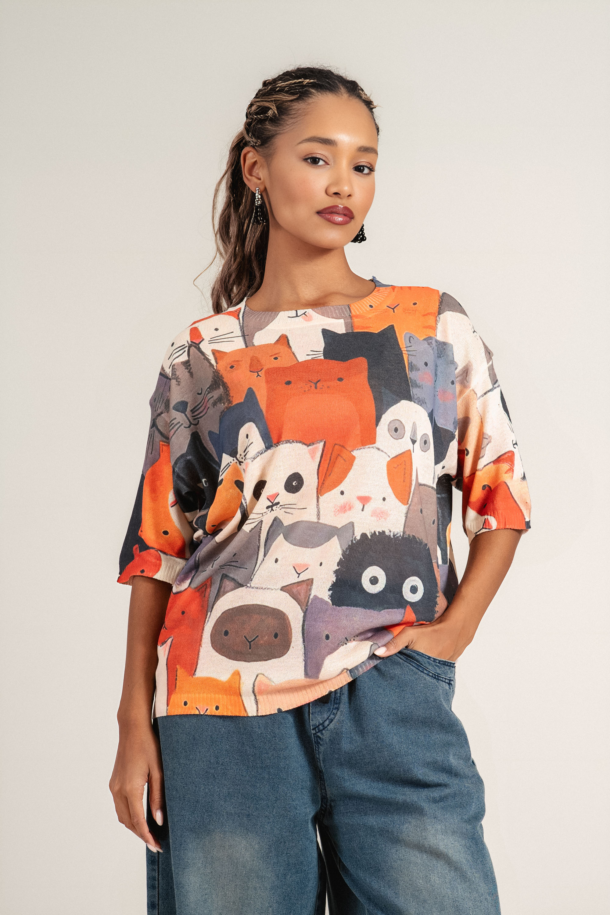 Мека и практична блуза от фино плетиво, отличаваща се с артистичен принт с цветни котки. Топлият оранжев фон и цветните мотиви в бежово и сиво добавят стил и настроение към визията. Идеален избор за динамично ежедневие или уютен уикенд стил.