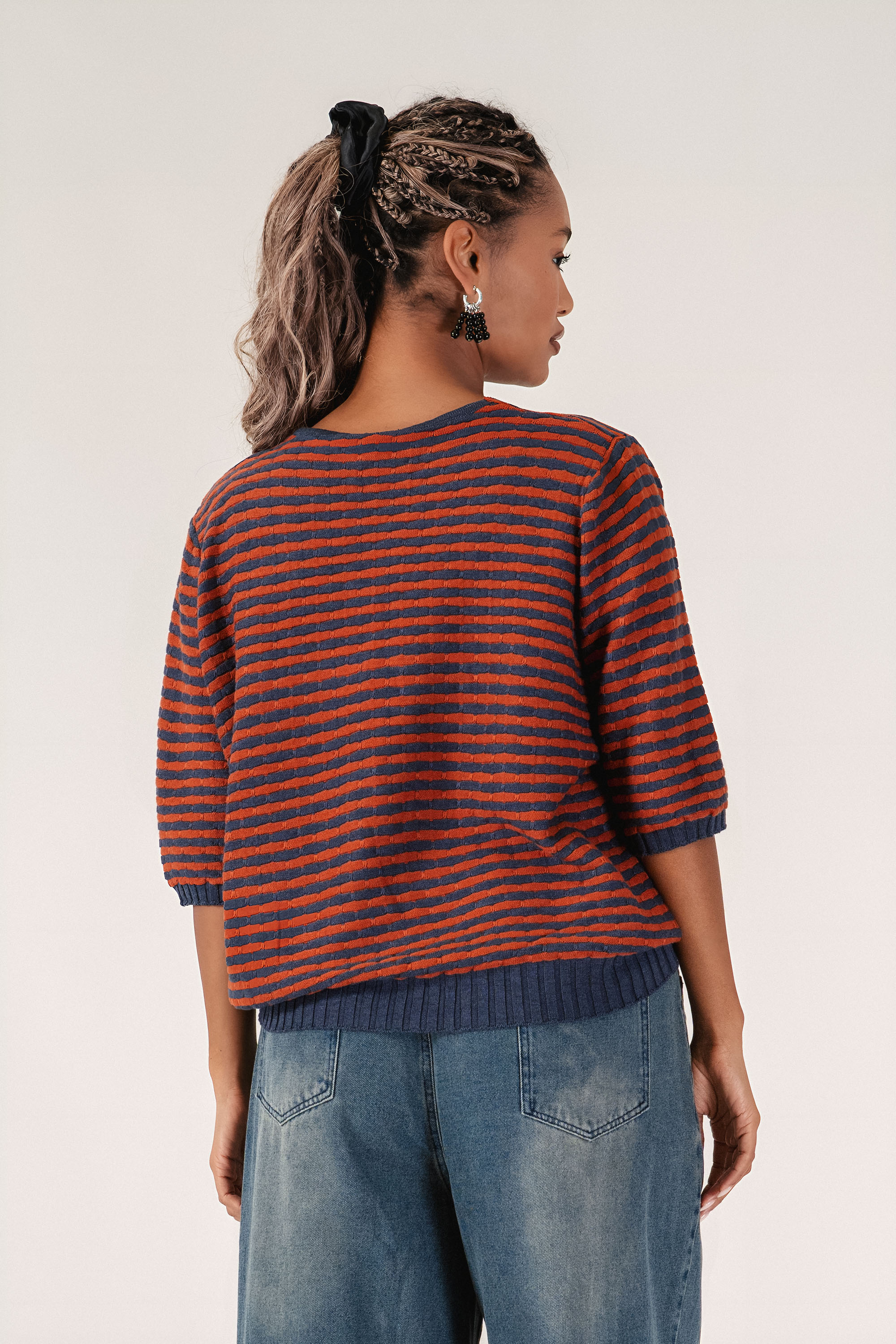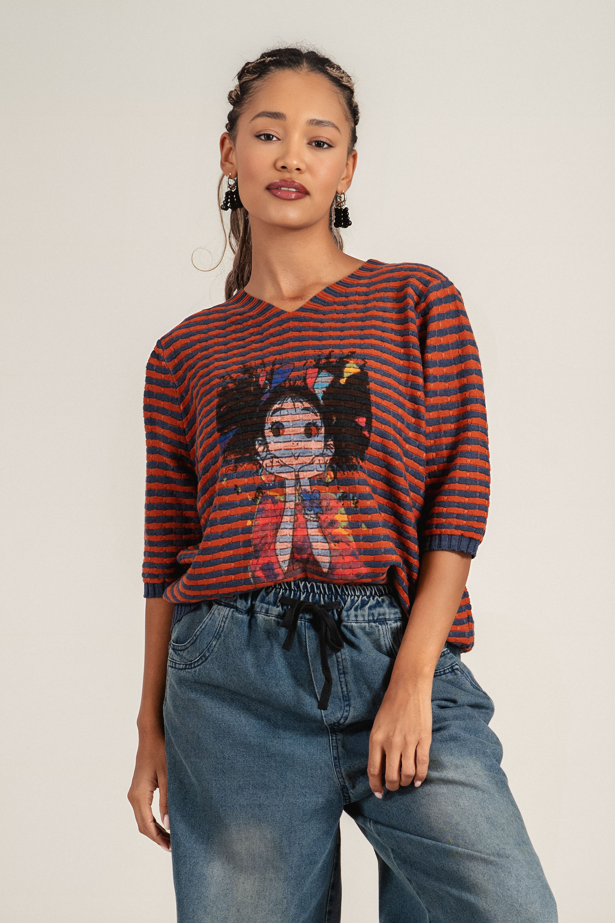 Дамска блуза от фино плетиво с раиран принт в червено и синьо и щампа момиче