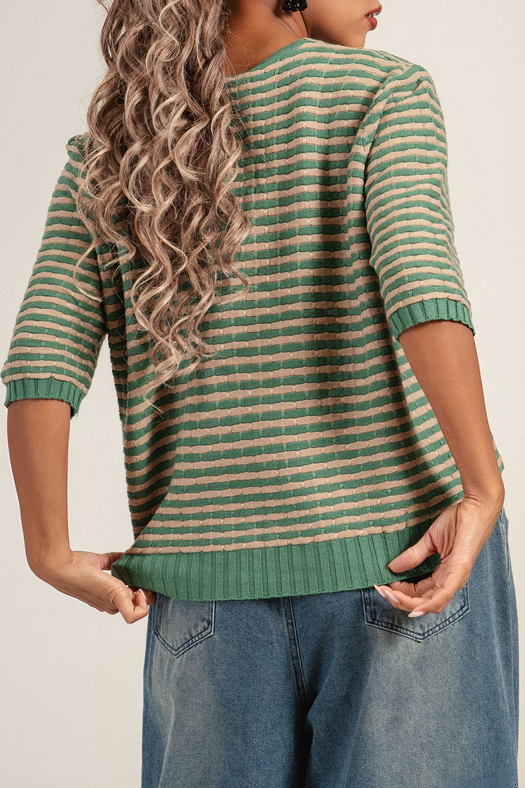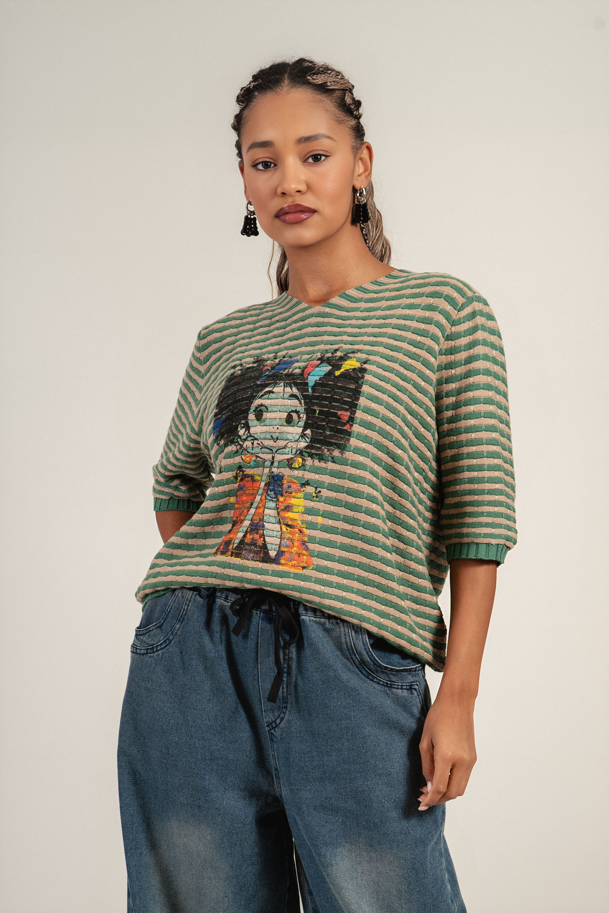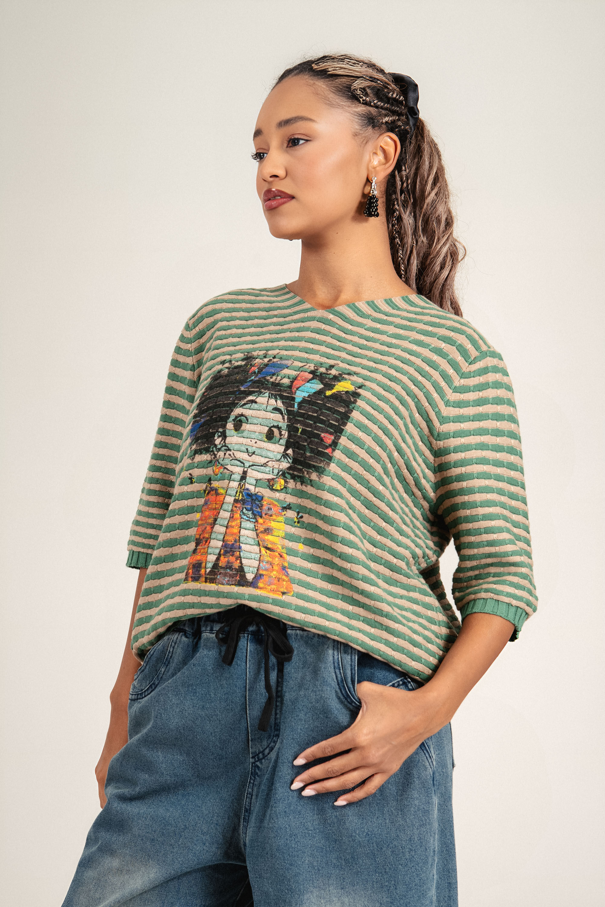 Дамска блуза от фино плетиво с раиран принт в зелено и бежово и щампа момиче