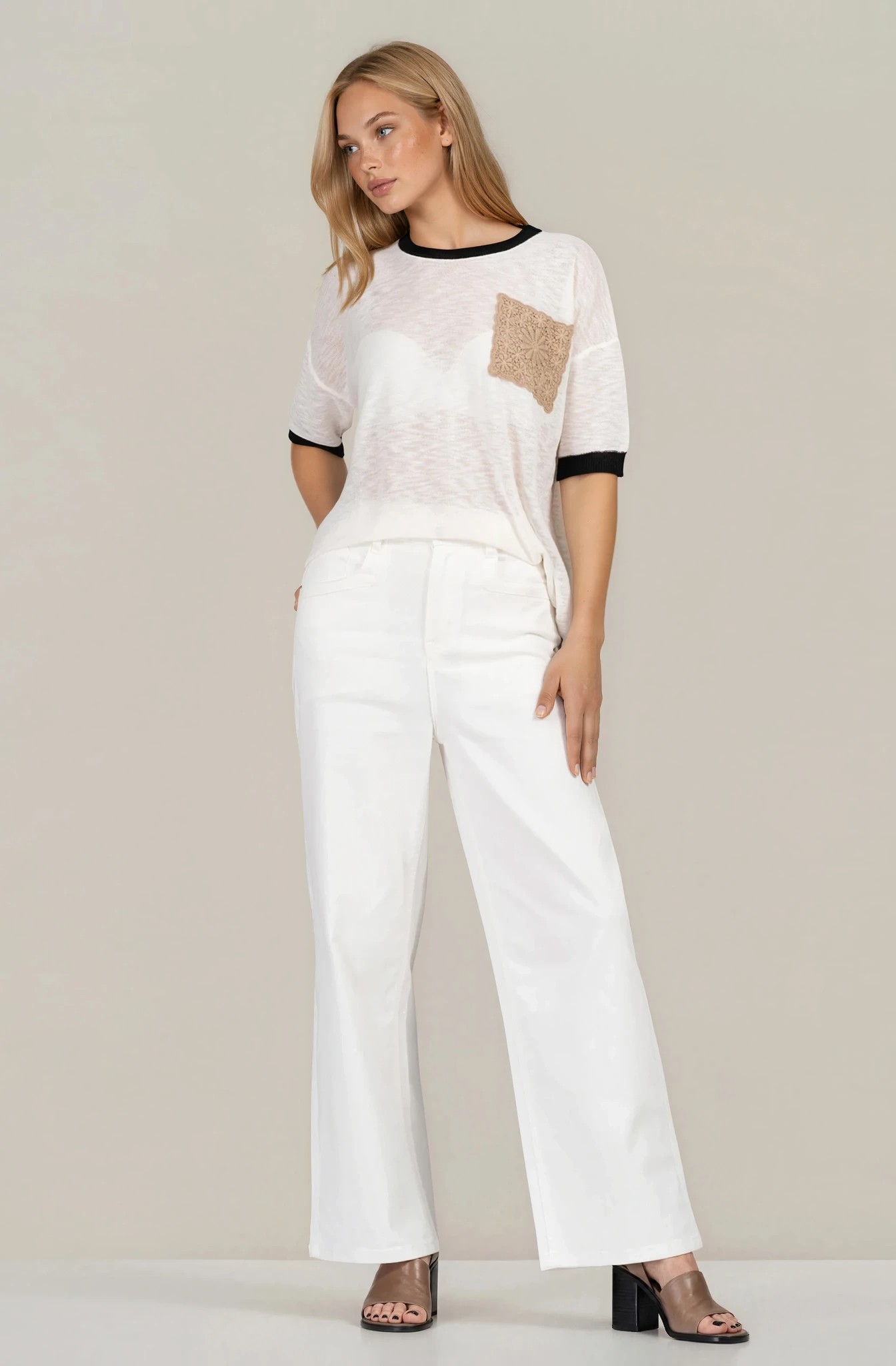 Особености: Обло деколте, къс ръкав, черен кант, джоб с рязана дантела