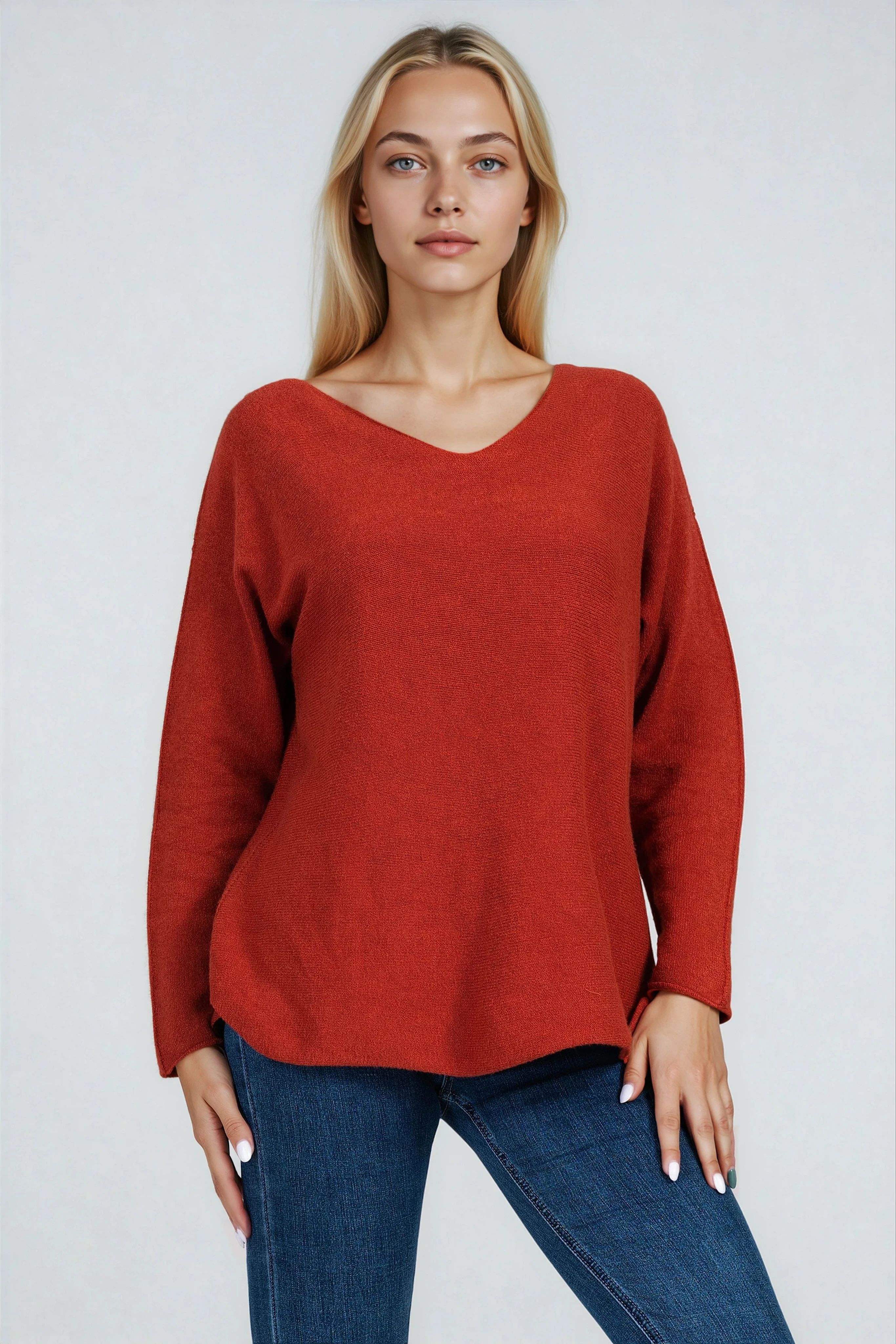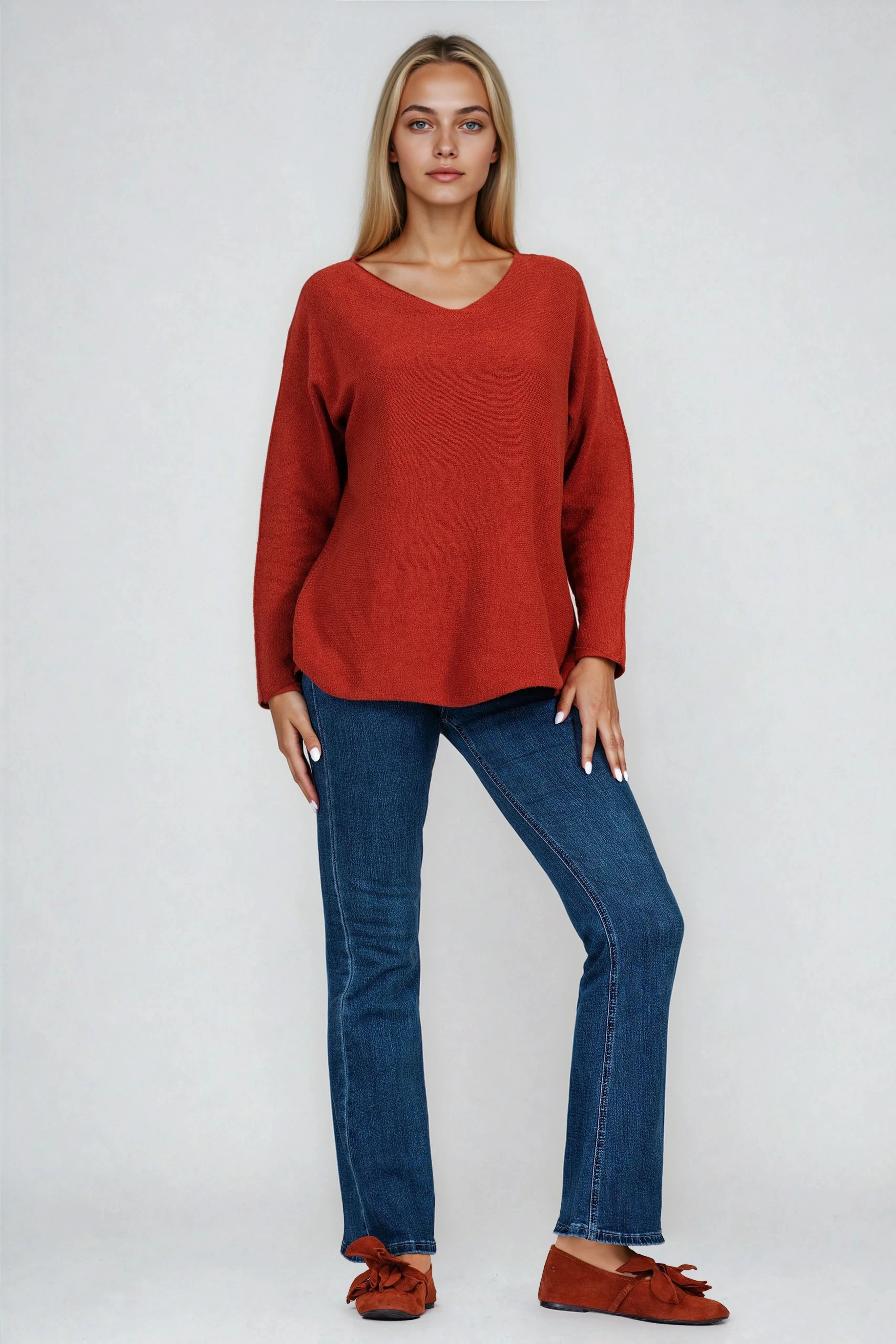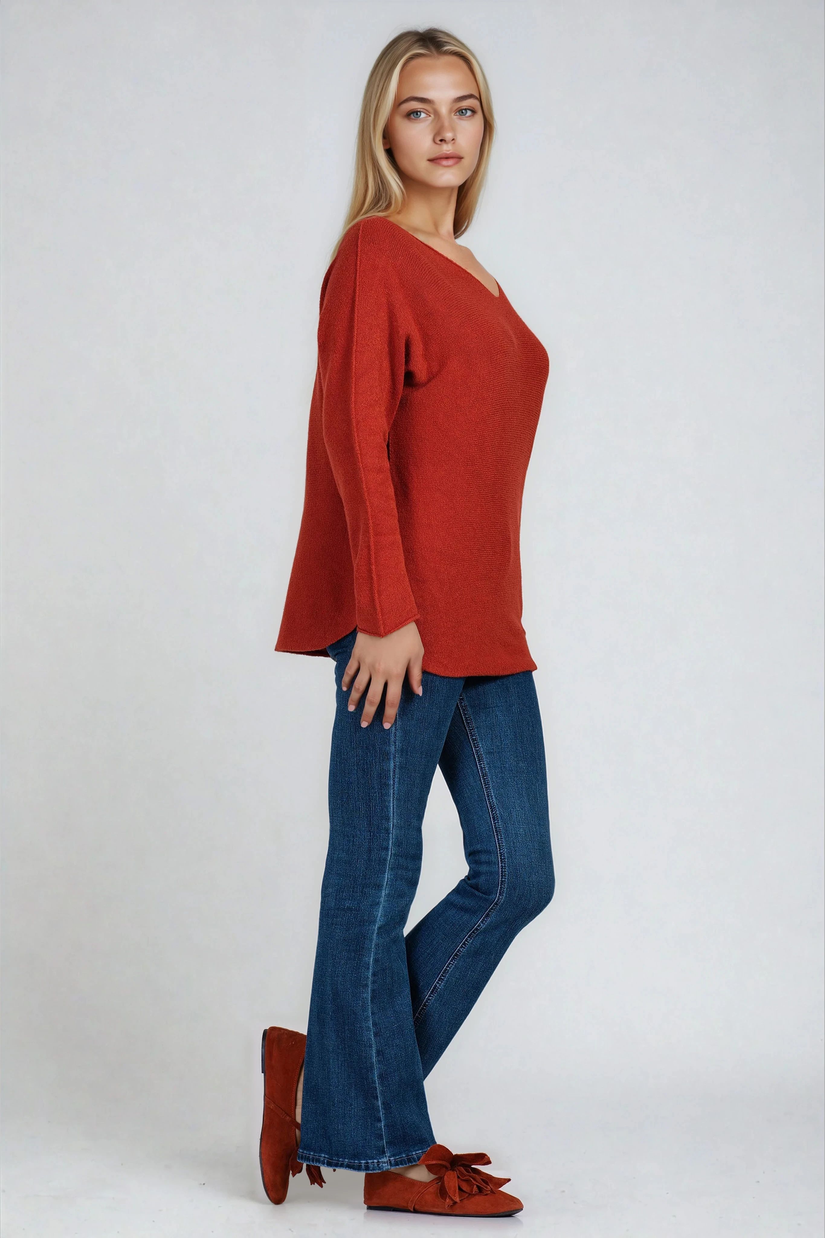 Тази приятна на допир блуза е отличен избор за комфортно и стилно ежедневие. Изработена от фино италианско плетиво, моделът е с паднало рамо, свободна кройка и овално деколте. Керемиденият цвят и изчистената линия я правят лесна за съчетаване с дънки или панталон.