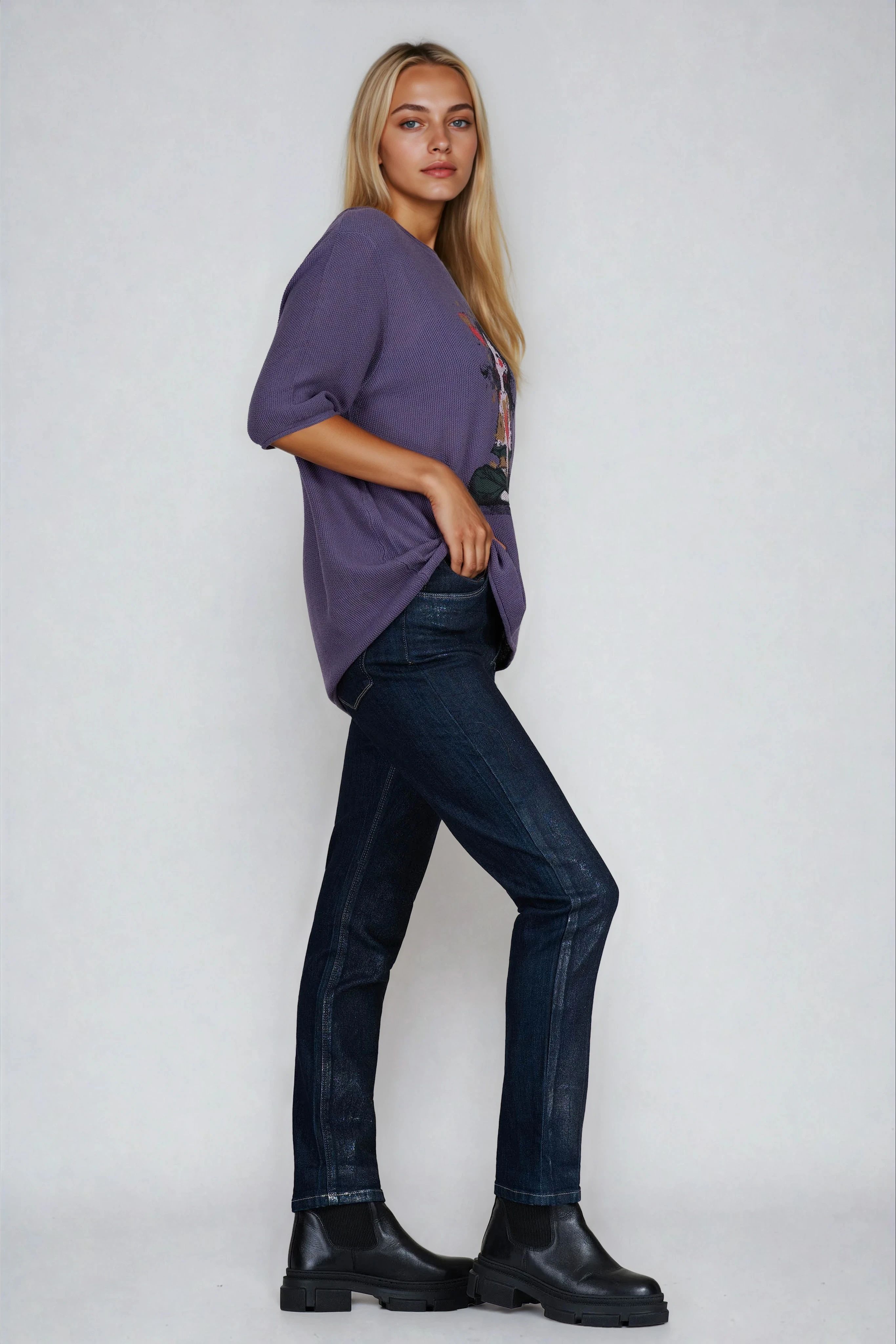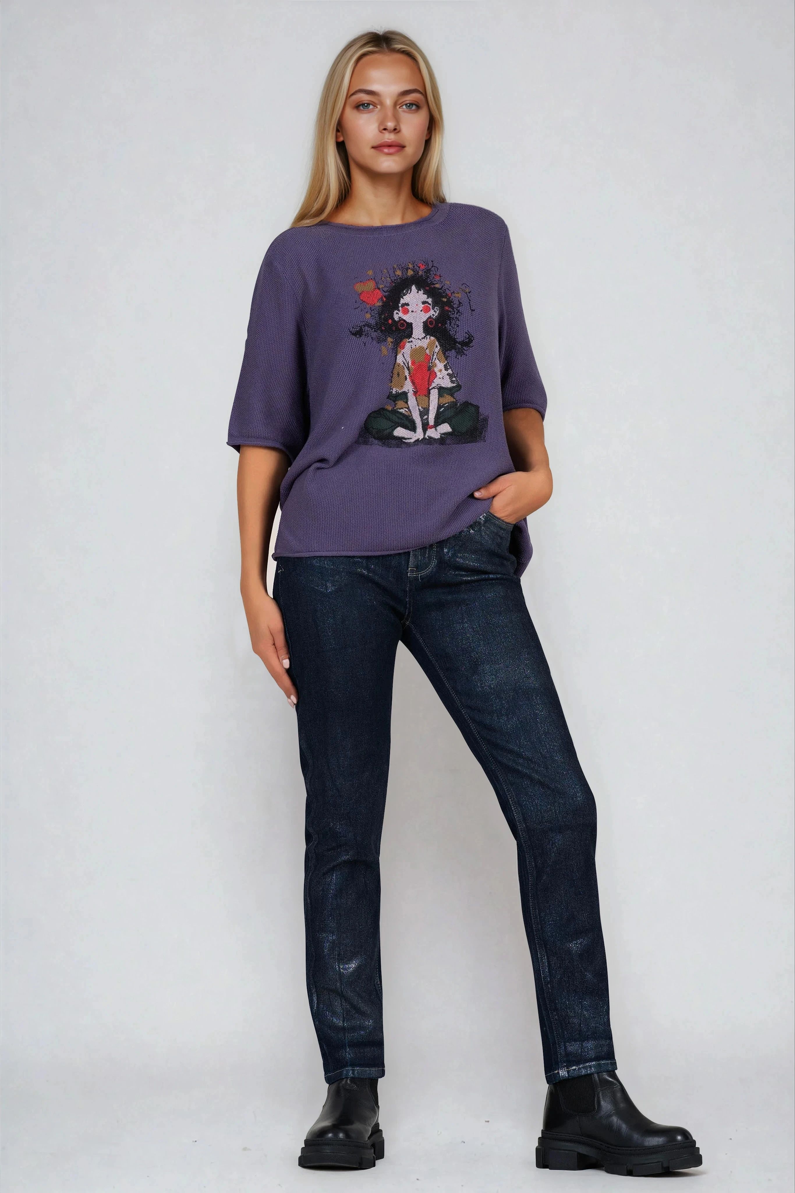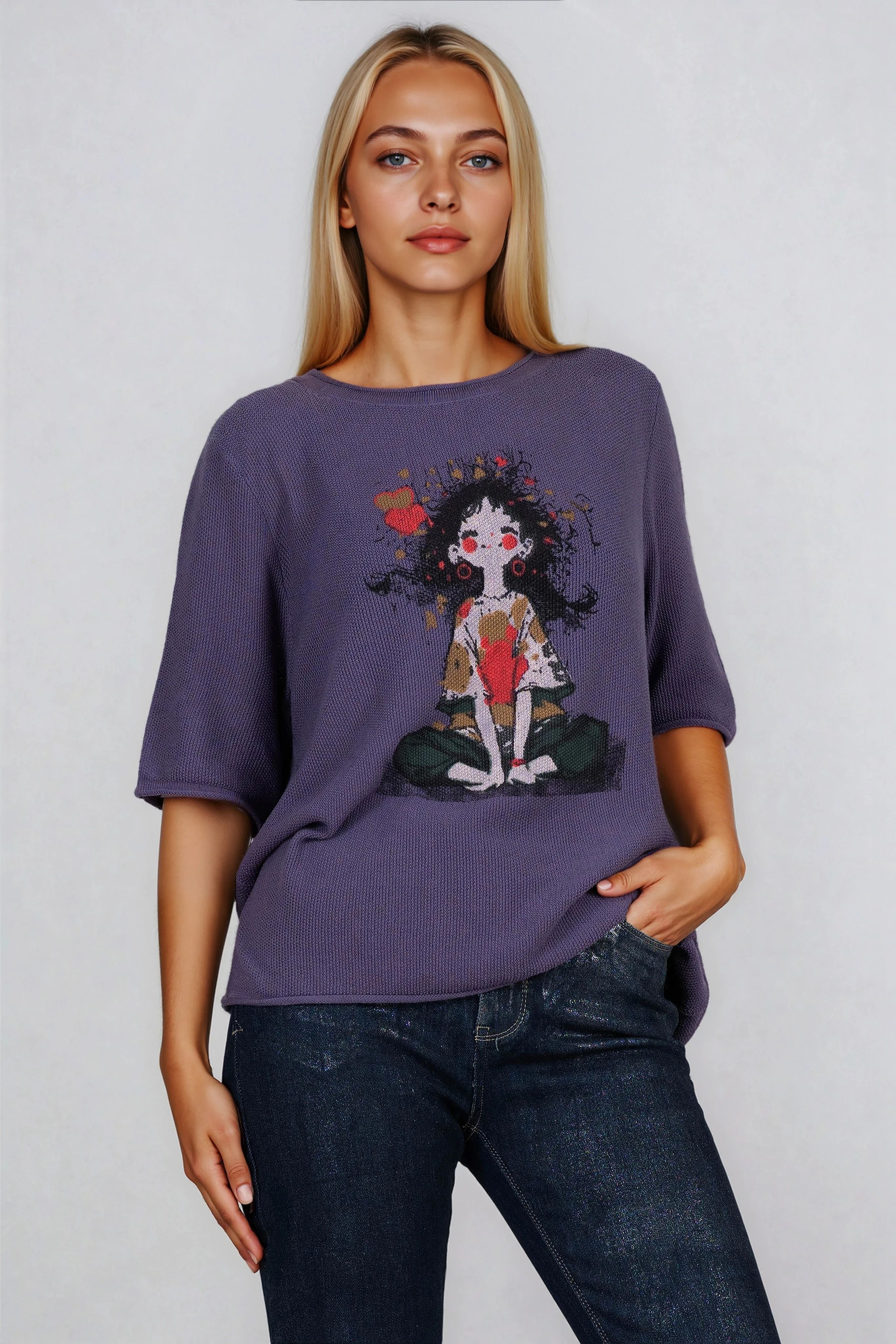 Дамска блуза от фино плетиво в лилаво с щампа момиче с къдрава коса