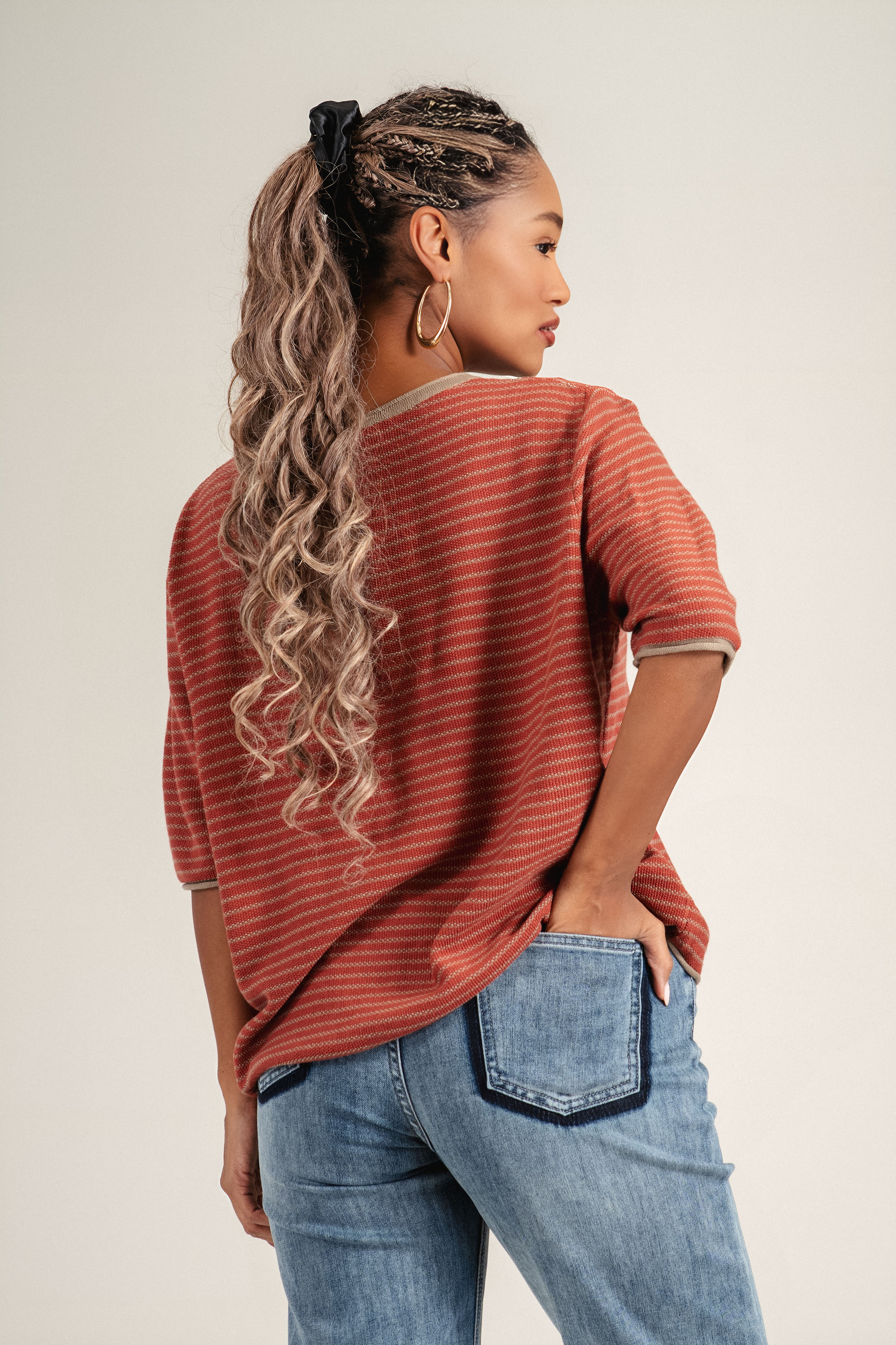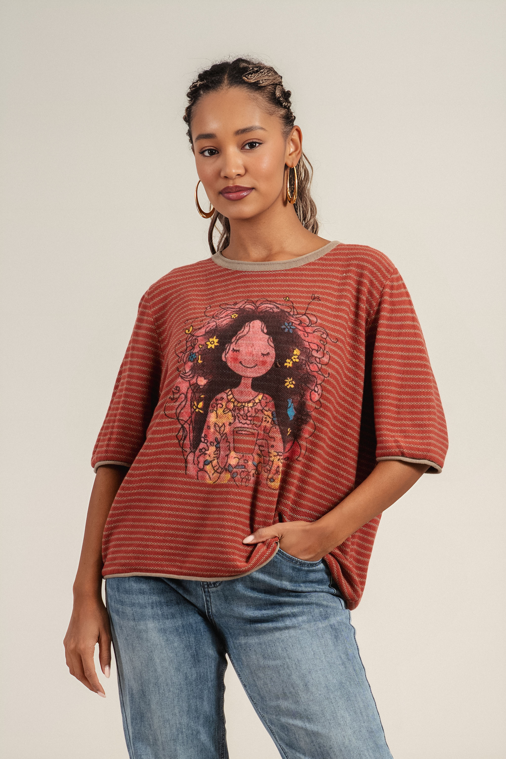 Дамска блуза от фино плетиво в оранжево с бежово райе и щампа