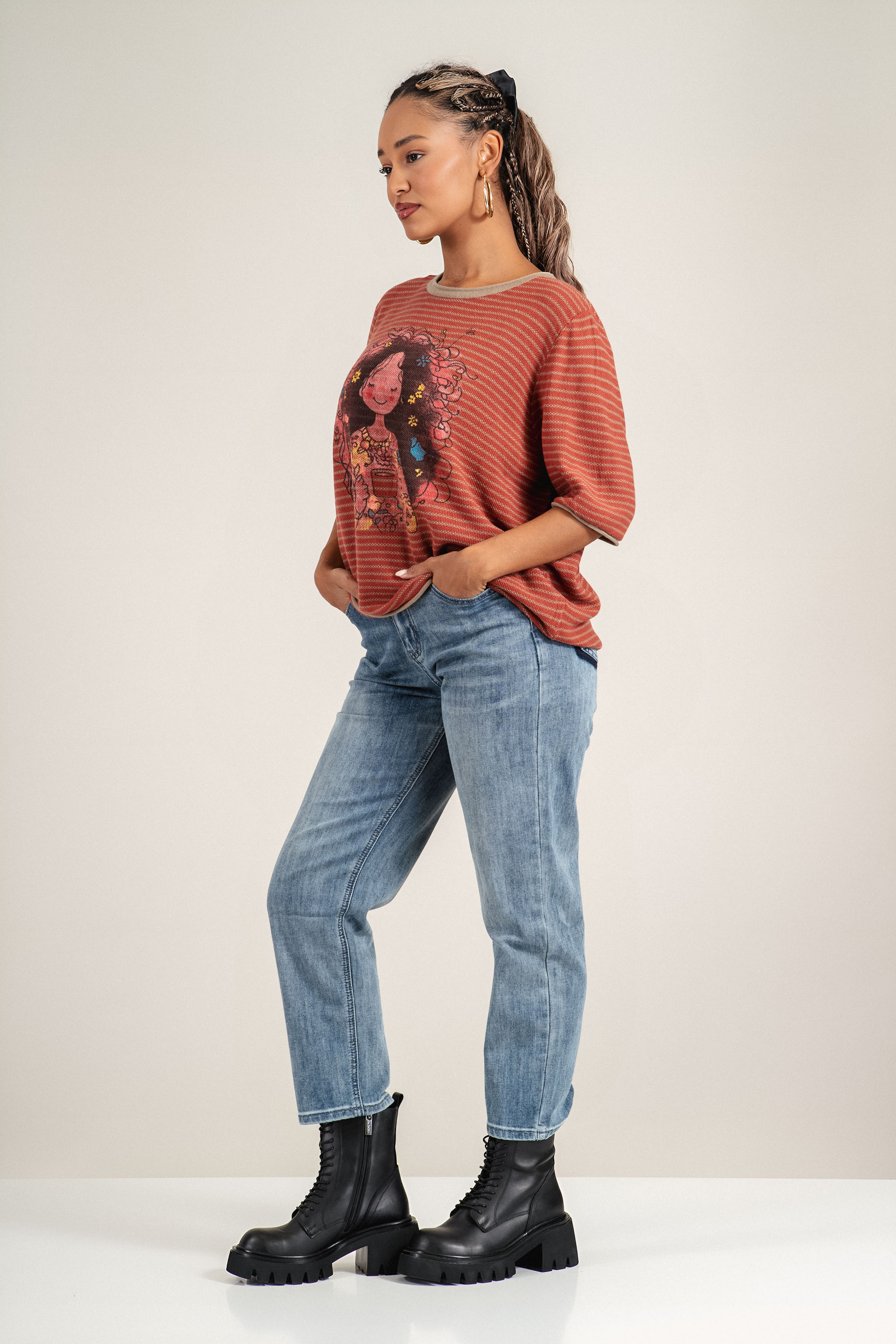 Тази блуза е изработена от меко плетиво, което осигурява комфорт и лекота през целия ден. Артистичният принт и обло деколте придават женствена визия, а свободната кройка позволява лесно комбиниране с различни долнища. Подходяща е за есенния сезон и за ежедневието.