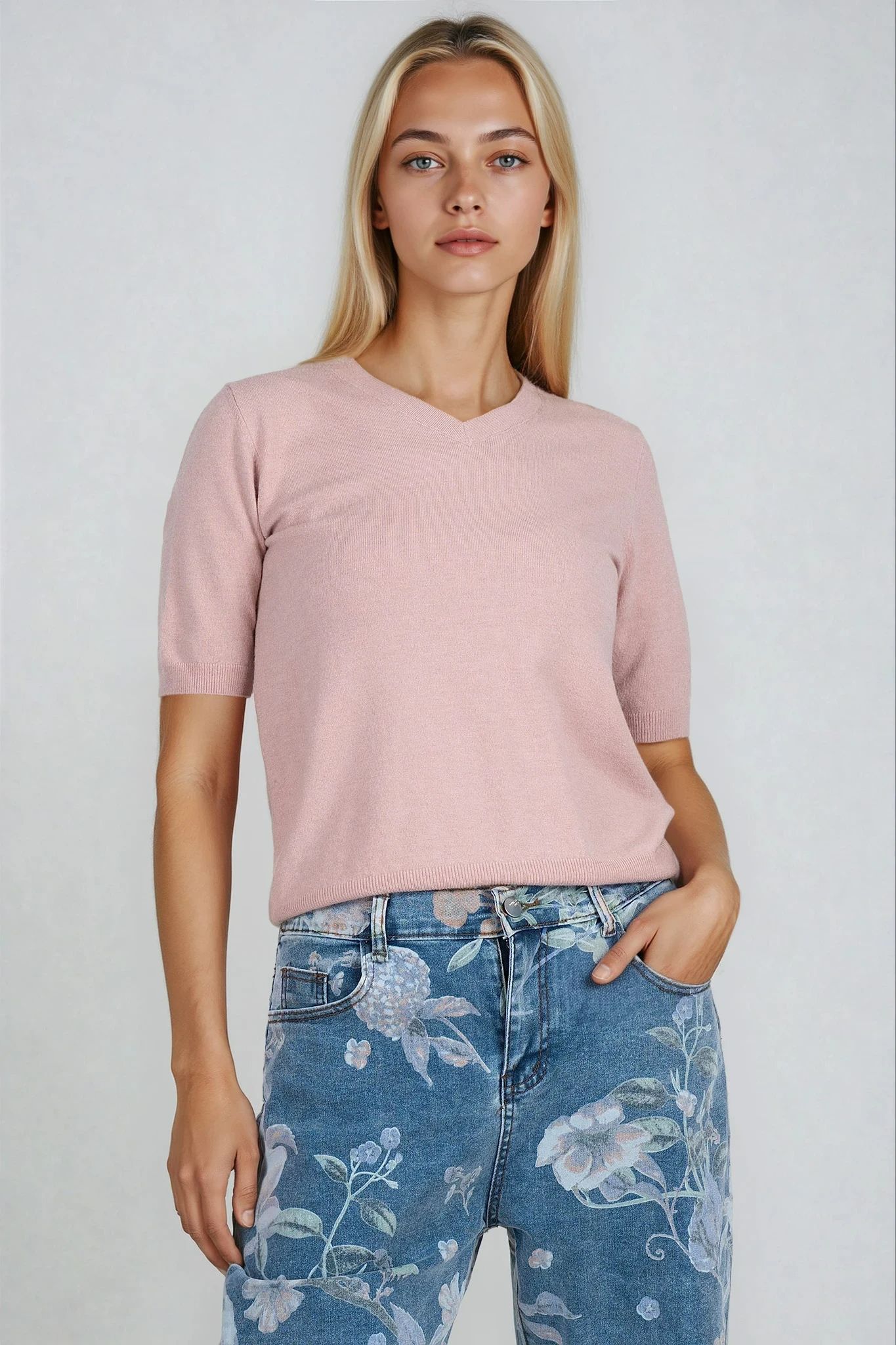 Изработена от меко фино плетиво, тази розова блуза се отличава с елегантно остро деколте и комфортна кройка. Материята е лека и приятна на допир, подходяща за преходните сезони. Моделът е идеален за ежедневието и може лесно да се комбинира с дънки или панталони за изчистена визия.