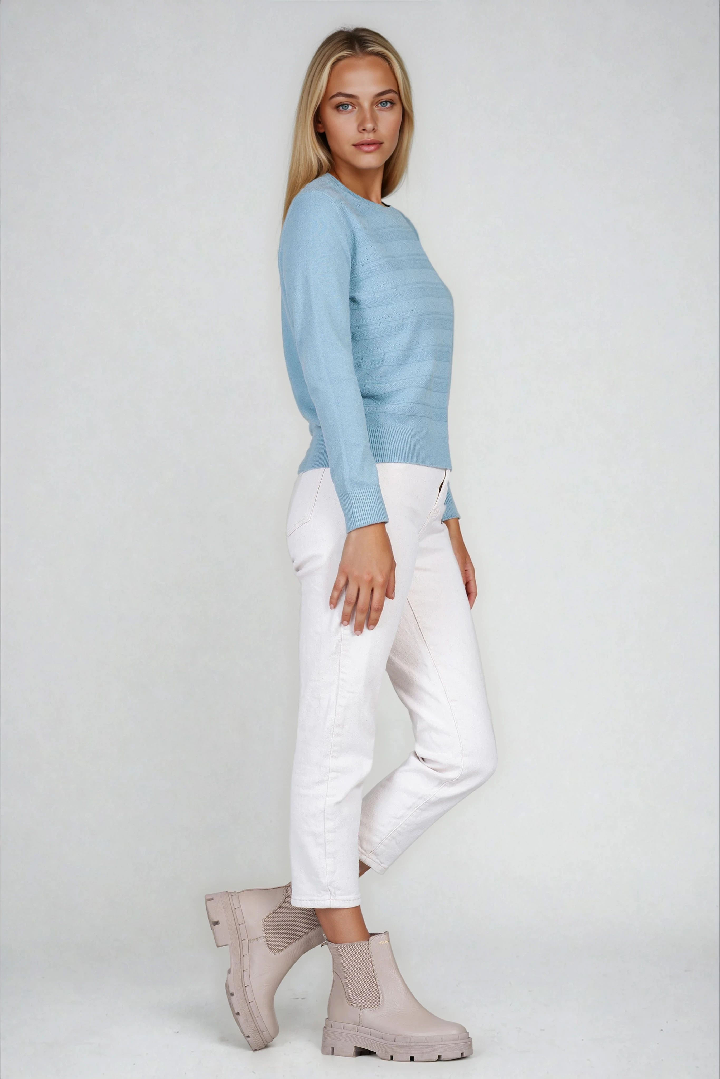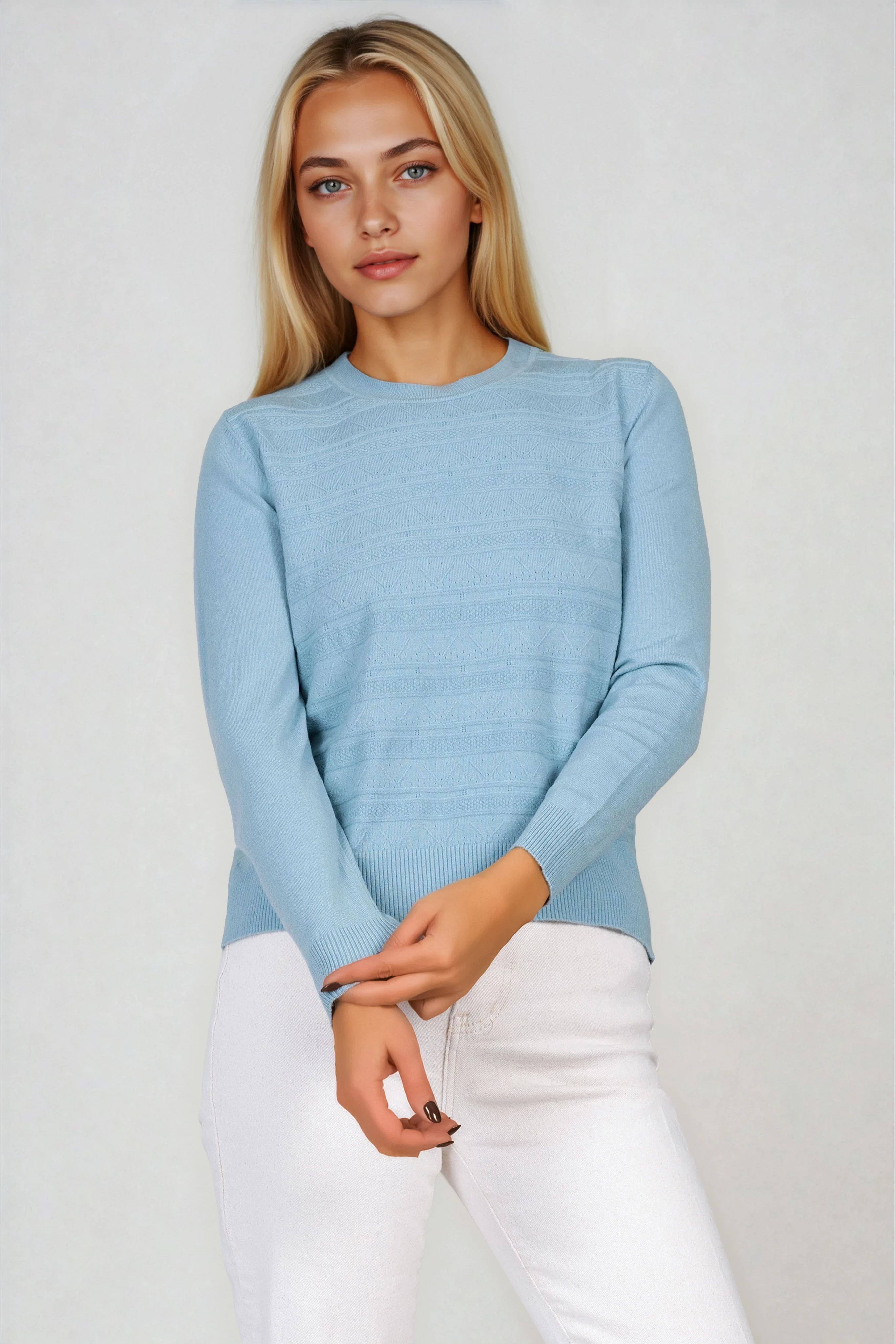 Тази блуза от фино плетиво съчетава мекота и стил. С изчистен светлосин цвят и релефна шарка, моделът придава деликатна текстура и женственост. Облото деколте и едноцветният дизайн го правят универсален избор за есенно-зимния сезон. Подходящ за комбинация с дънки, панталони или поли.