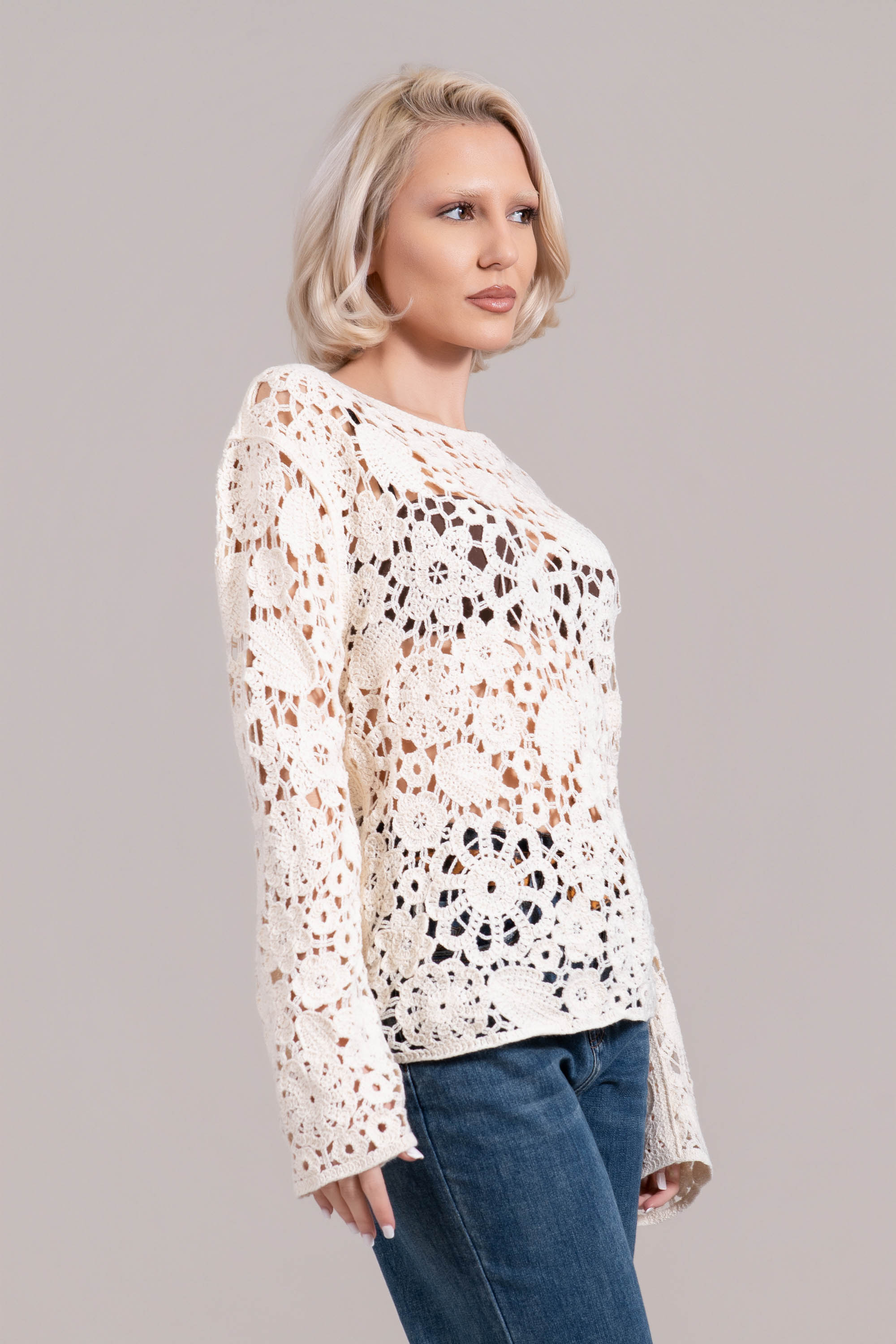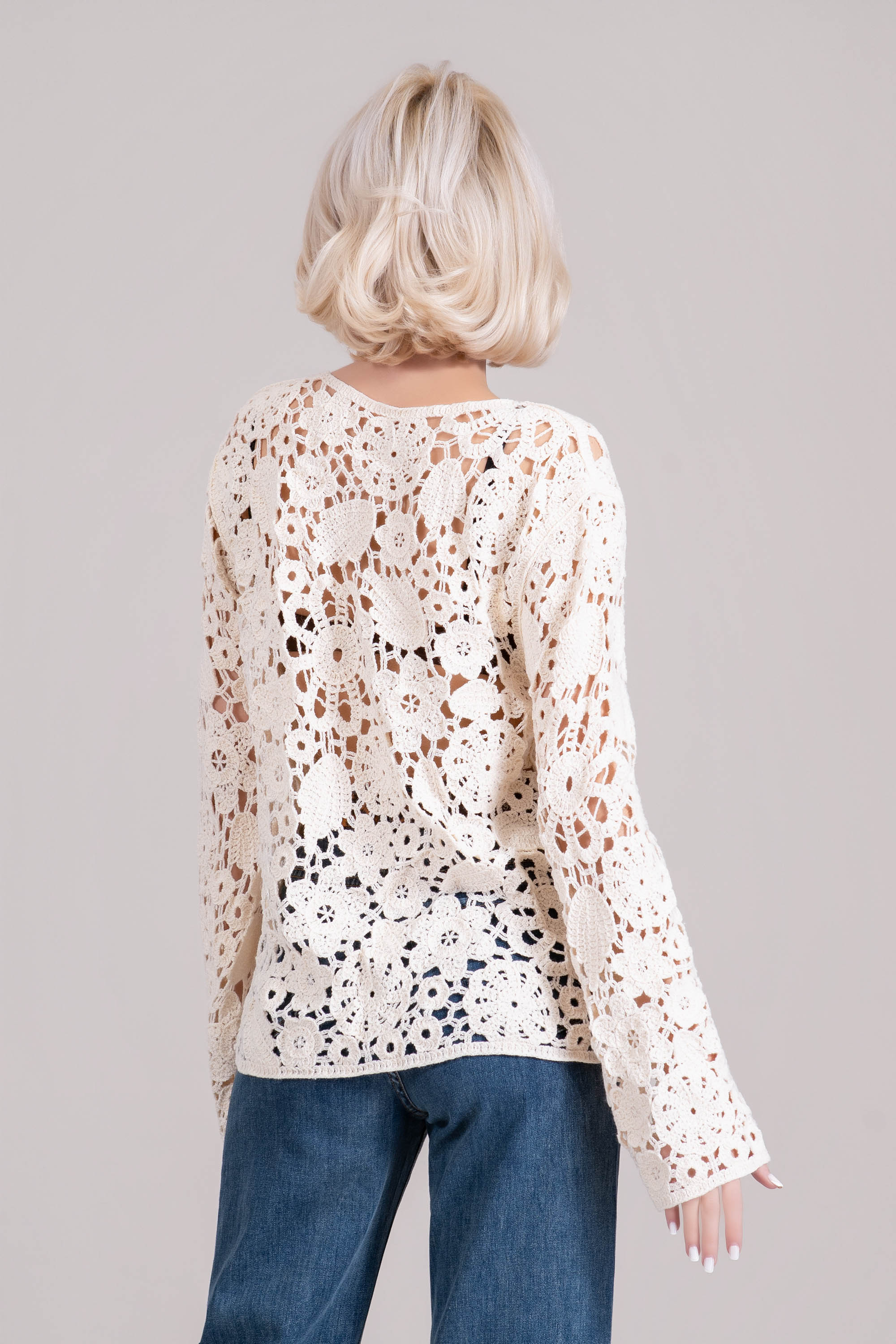 Дамска блуза от памучно плетиво в бежово с бродирани цветя и свободен силует
