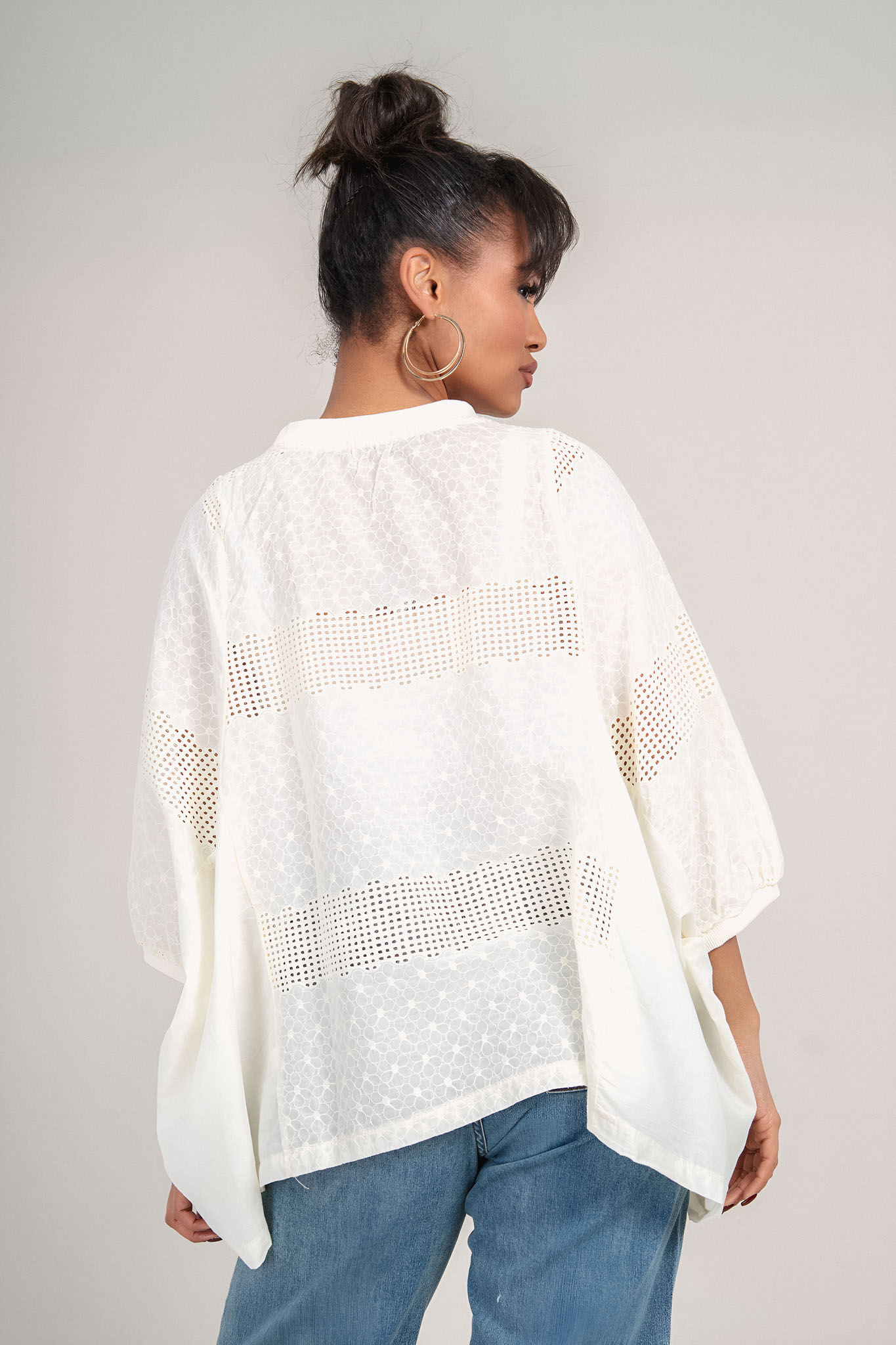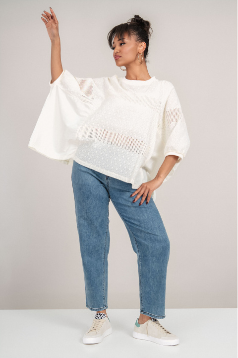 Особености: Обло деколте, къс ръкав, широк модел с рязана бродерия