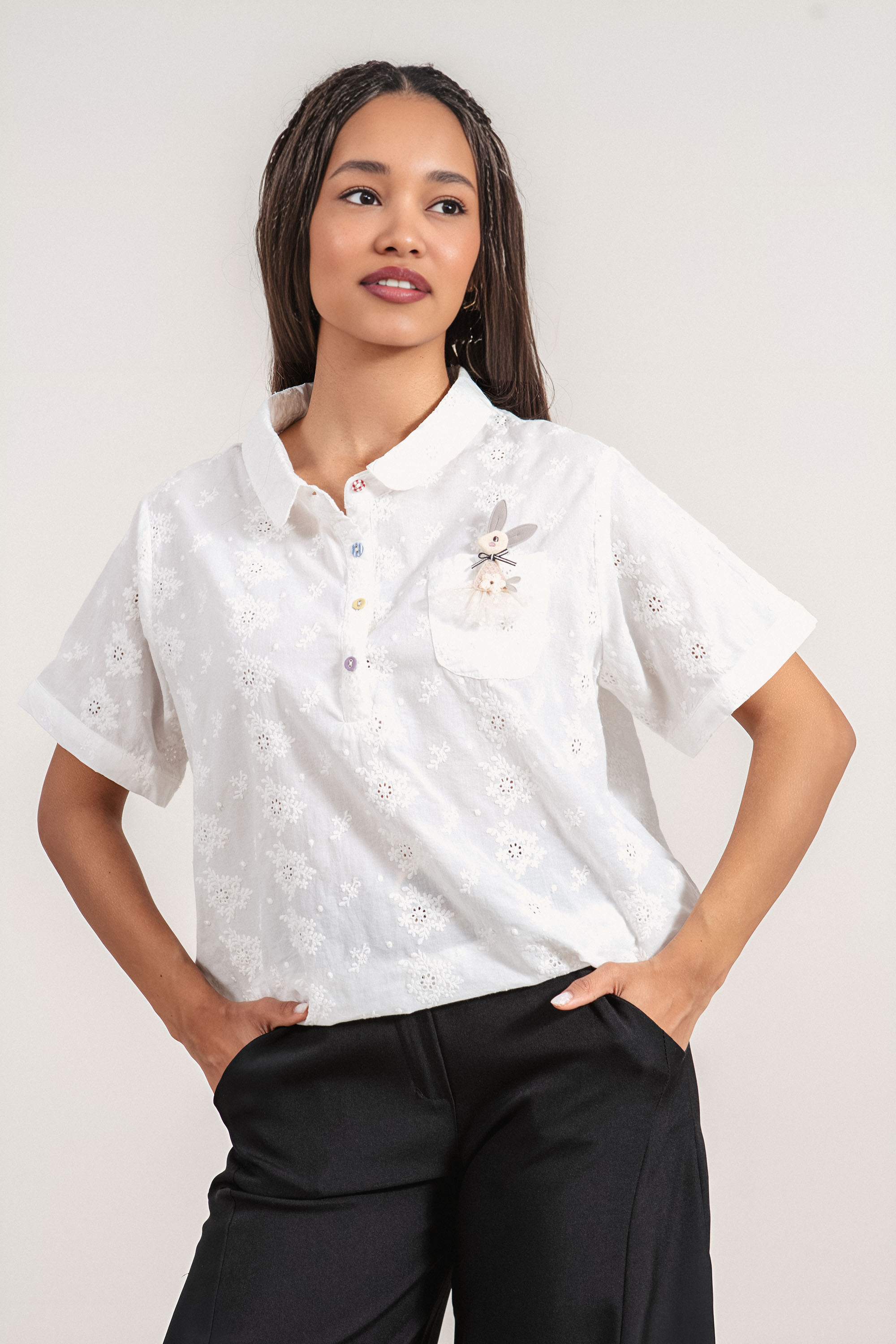 Свежа блуза от естественa памучна материя, създадена за максимален комфорт през топлите дни. Материята е мека и дишаща, което я прави отличен избор за ежедневието. Моделът се отличава с яка и цветни копчета, които внасят игрив и отличителен акцент. Деликатната бяла бродерия и декоративната брошка със зайче придават индивидуалност и фин завършек. Еластичният подгъв оформя силуета и осигурява удобно прилягане.