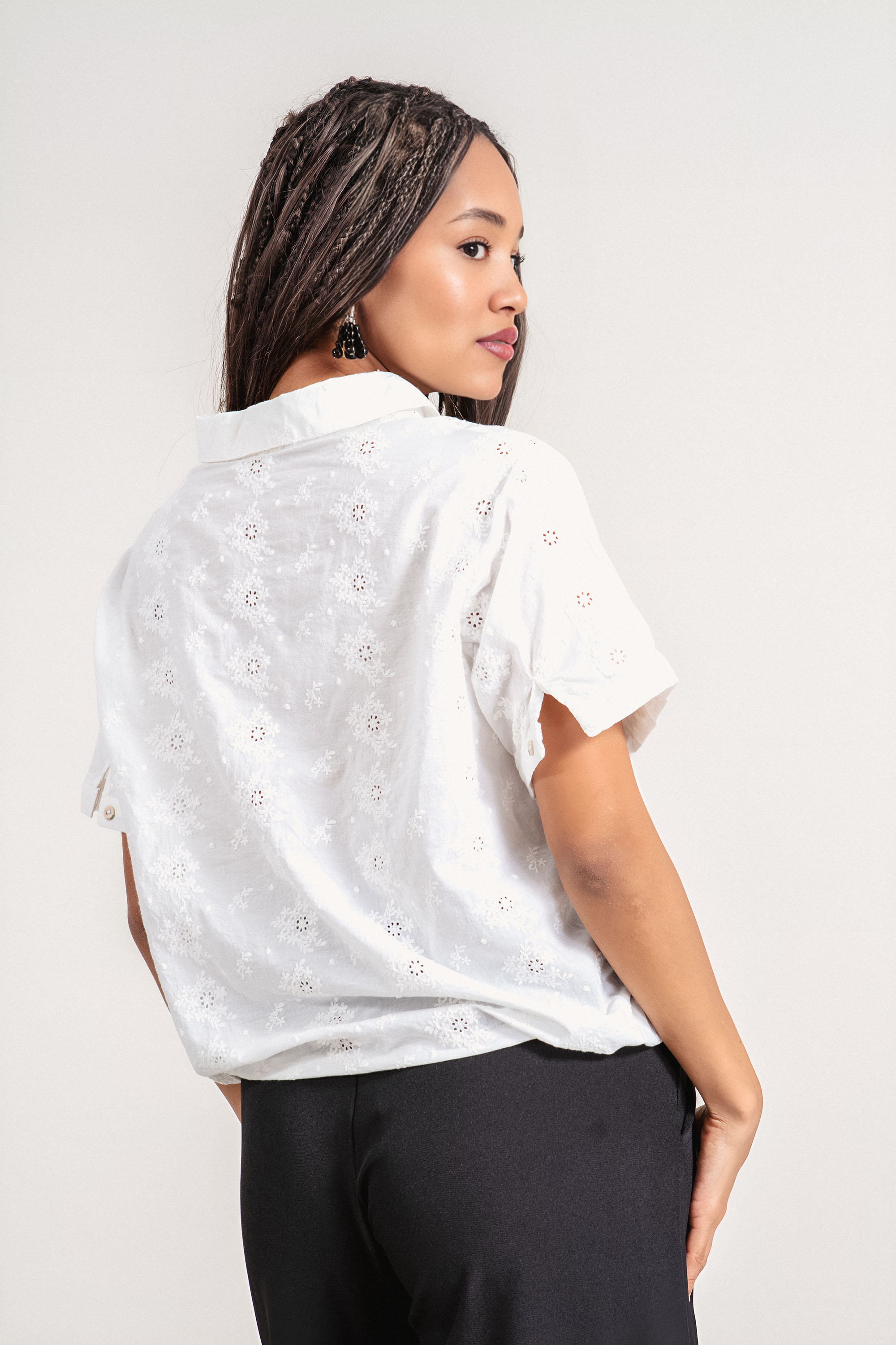 Дамска блуза от памук в бяло с нежна бродерия, цветни копчета, къс ръкав и интересна брошка