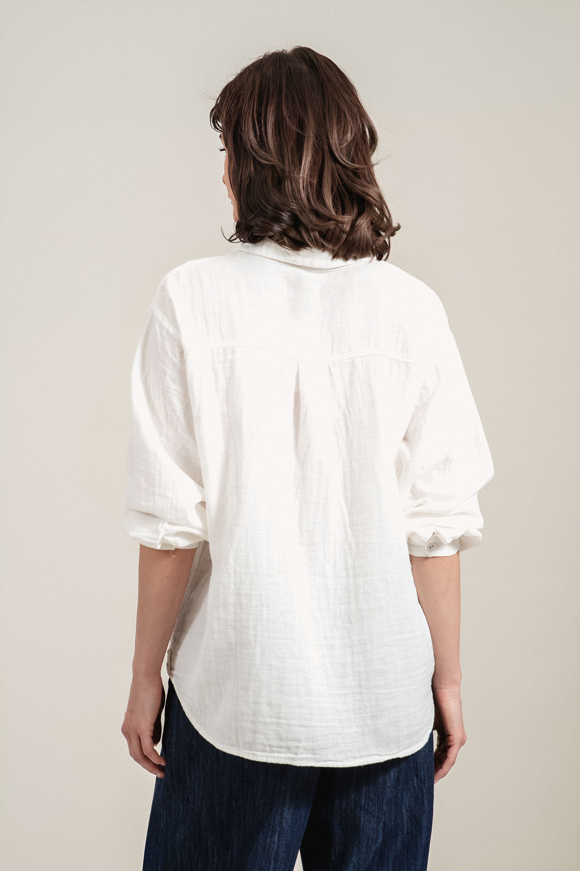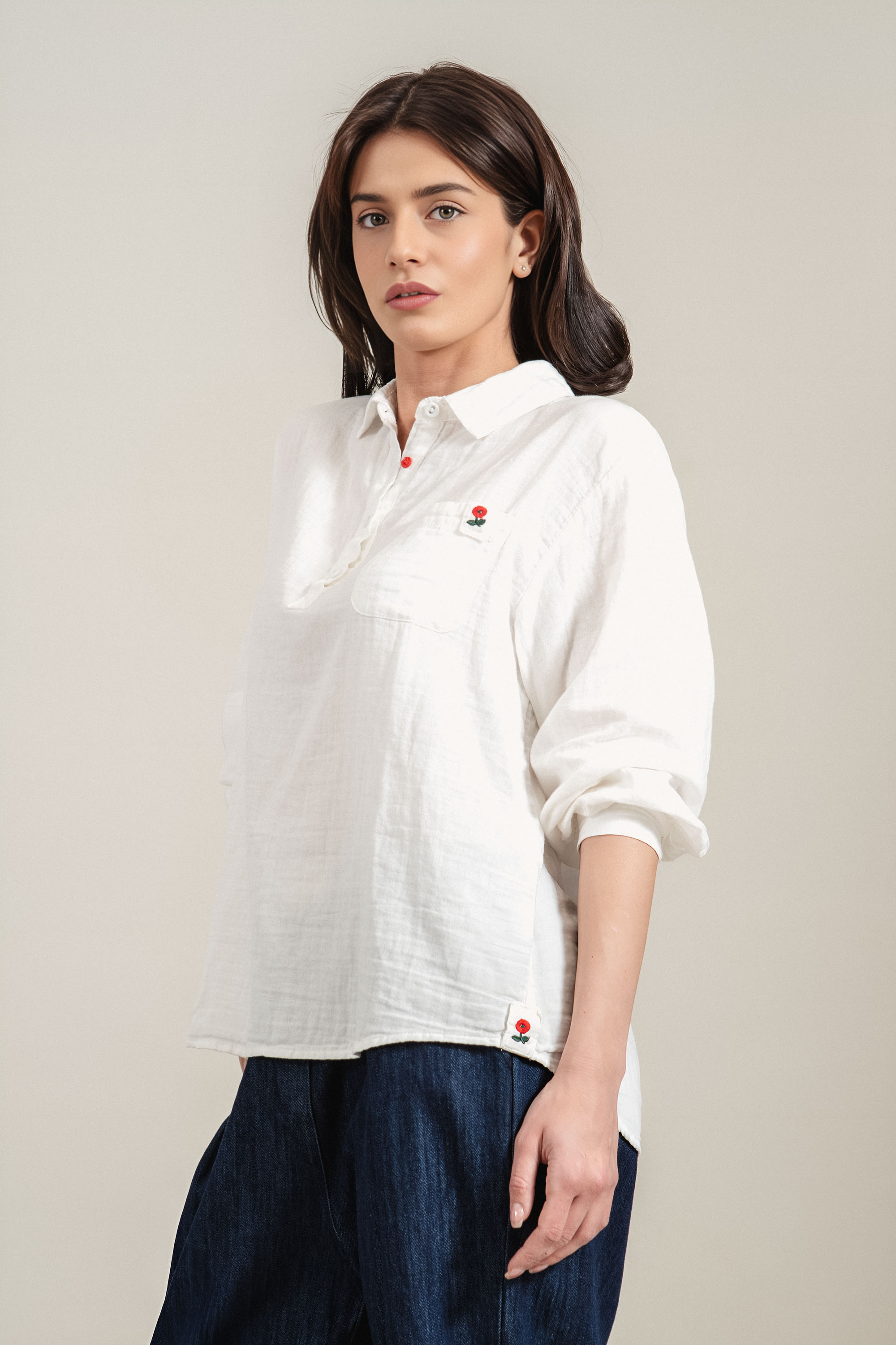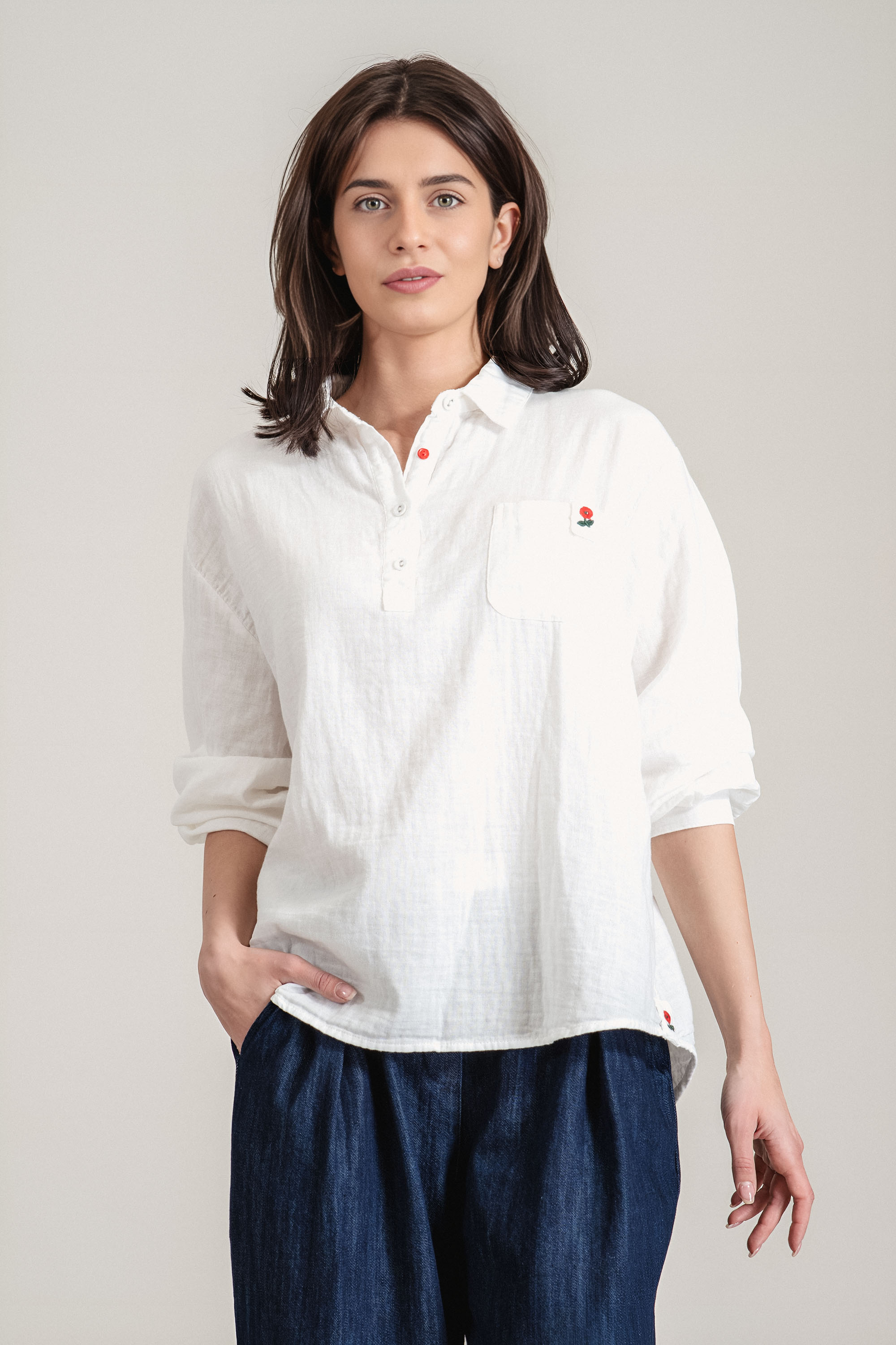 Класическа блуза от памук с изчистен силует и деликатни акценти. Моделът разполага с яка и копчета, които придават елегантно излъчване, а джобът на гърдите е допълнен с фино бродирано цвете. Леката и дишаща материя осигурява комфорт през целия ден. Подходящ избор както за ежедневие, така и за по-елегантни визии.