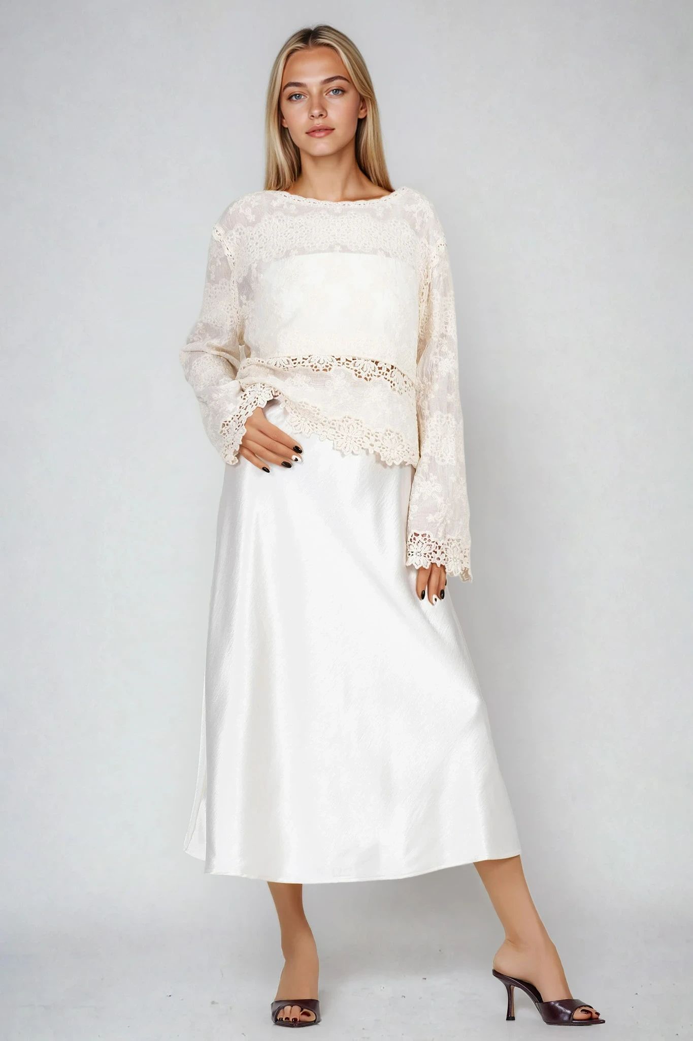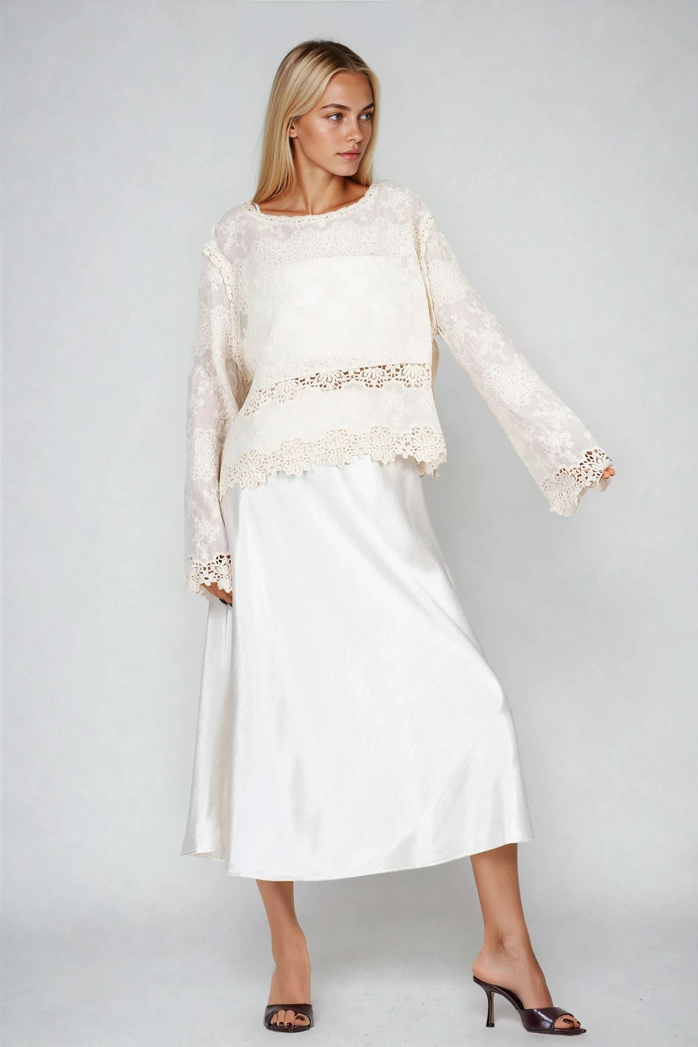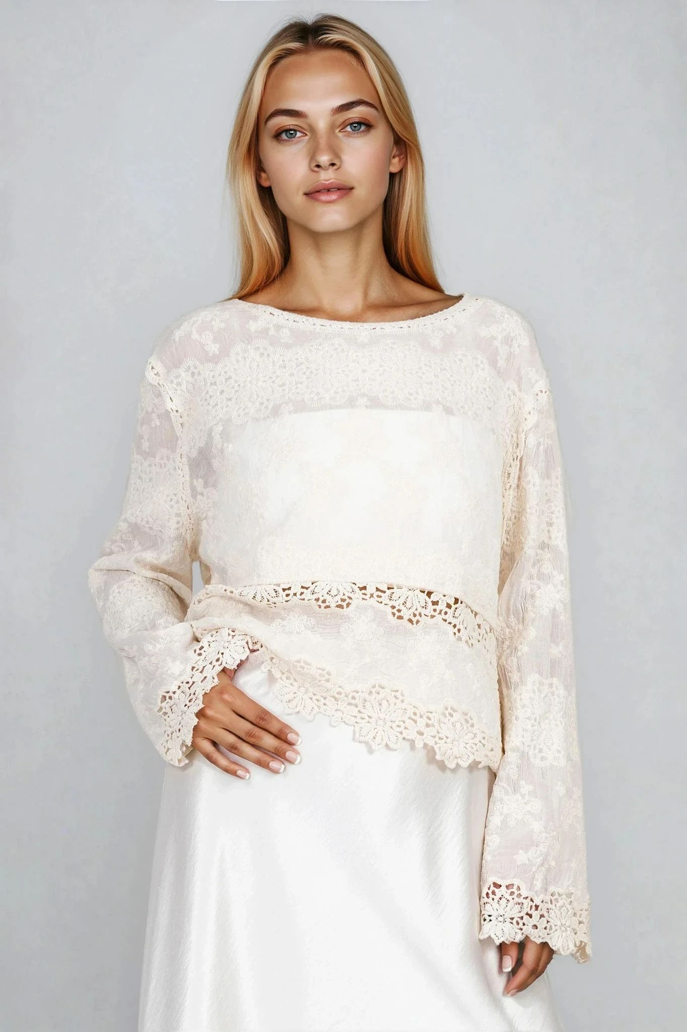 Тази елегантна блуза в нежно екрю е изработена от фина памучна материя с декоративна рязана бродерия. Свободната кройка и леко разкроените ръкави осигуряват комфорт и лекота през целия ден. Съчетава се отлично с поли и панталони за стилна визия както в офиса, така и при специални поводи.
