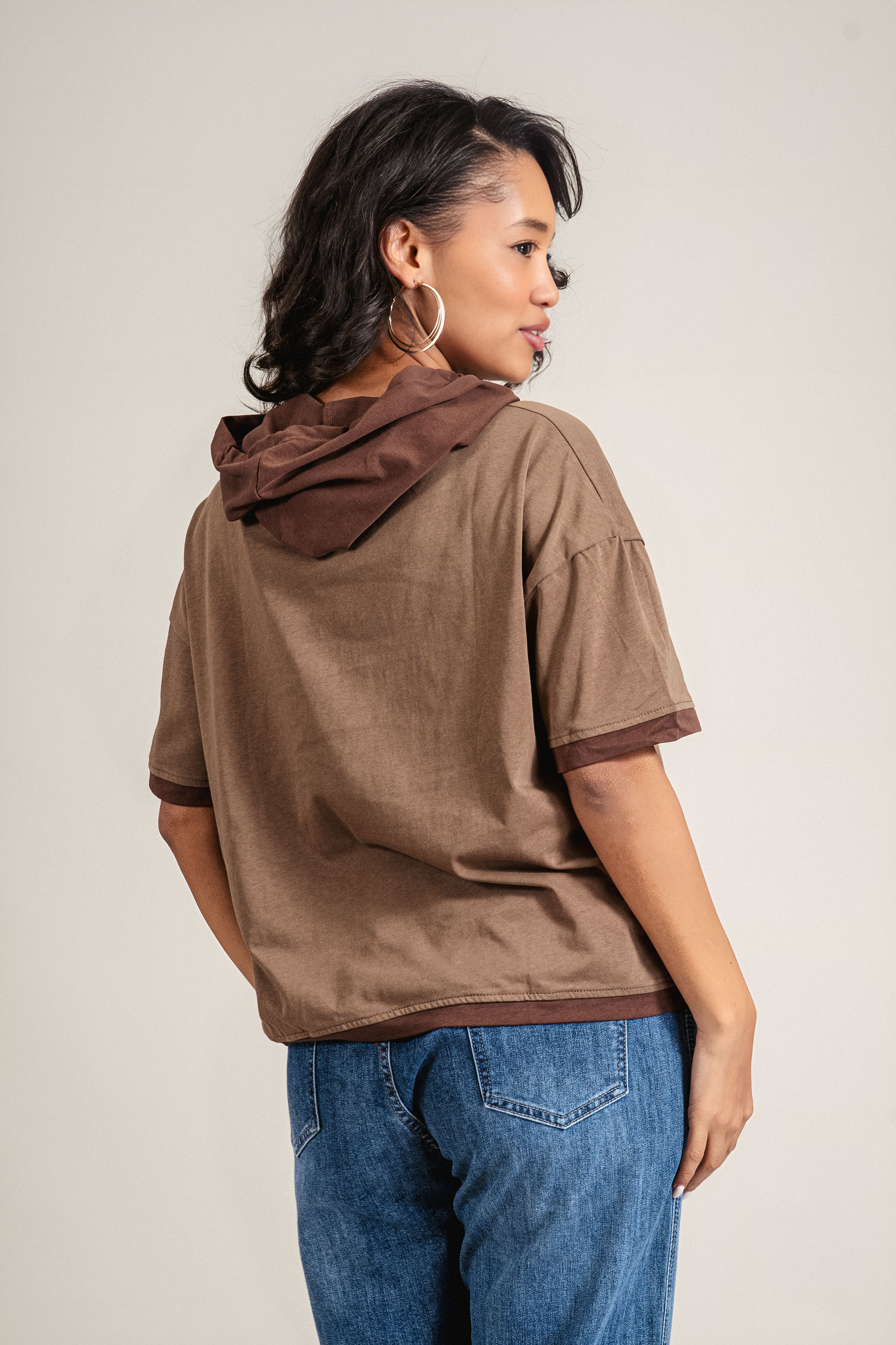 Блуза със свободна кройка, изработена от чист памук, която впечатлява с винтидж вдъхновение. Щампата с цветя и контрастен надпис „SEVENTIES“ се комбинира ефектно с кафявата качулка. Тази удобна и лека дреха е перфектен избор за свободното време, като се съчетава лесно с дънки или спортни панталони.