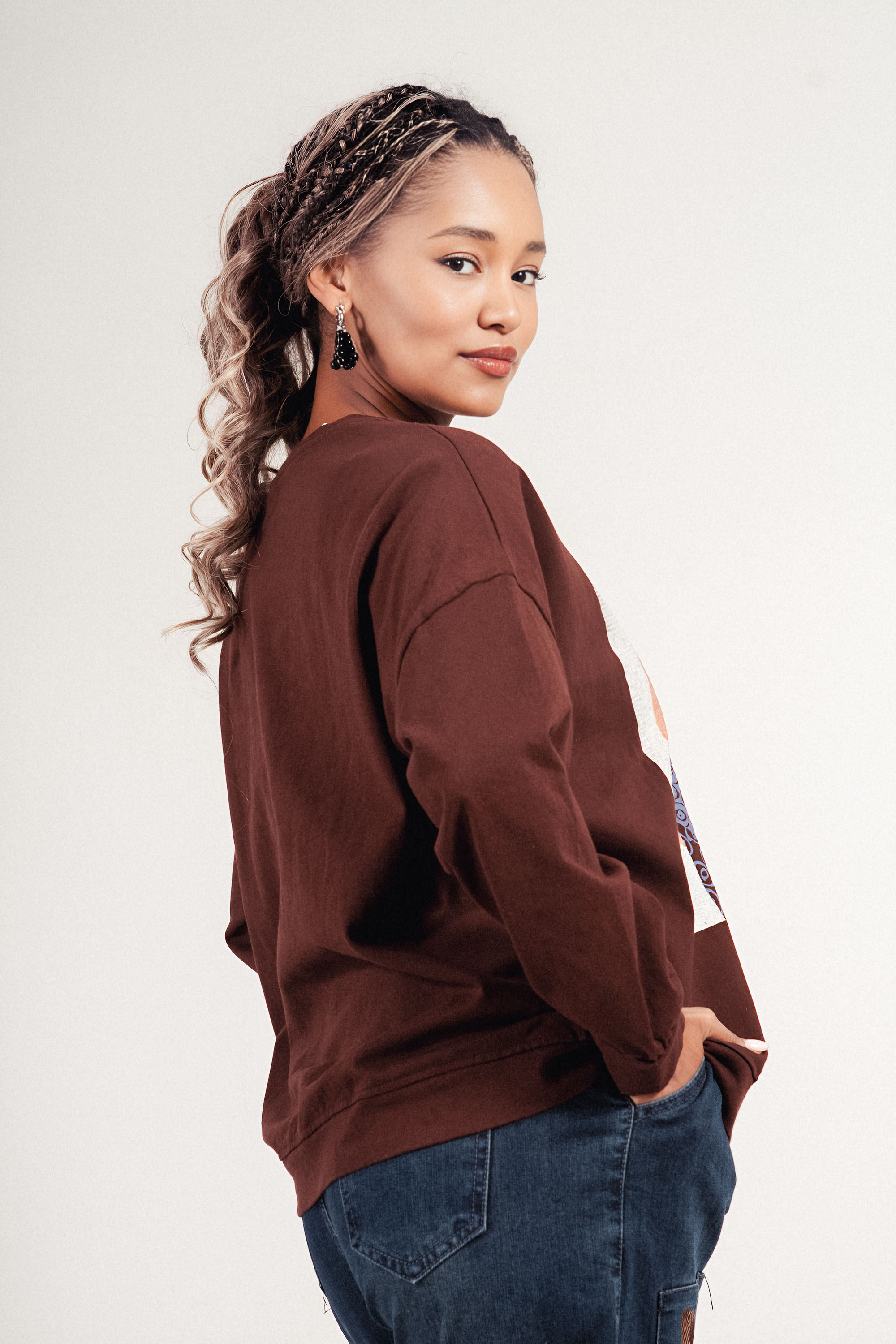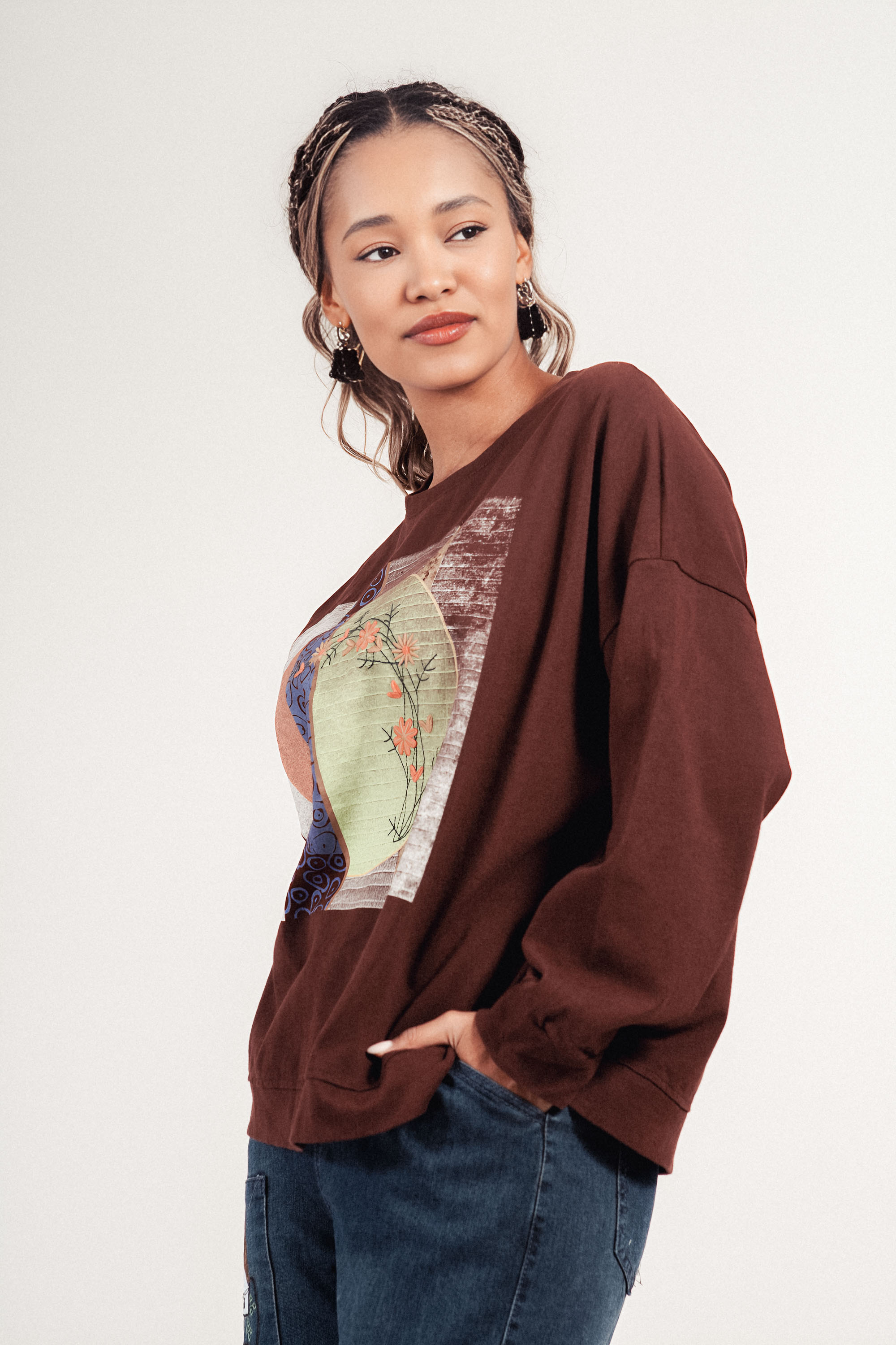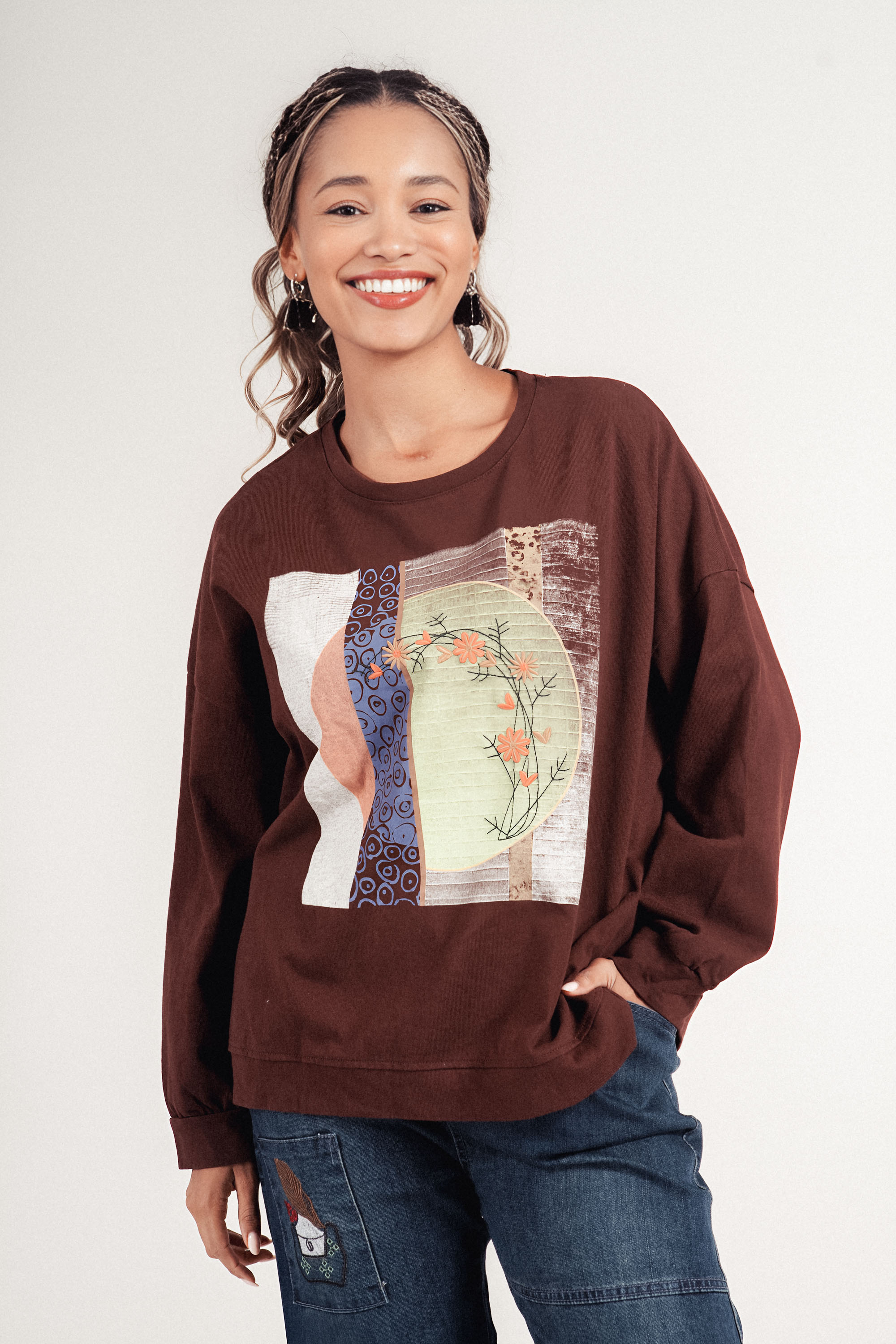 Блуза от мека памучна материя в топъл кафяв нюанс, декорирана с артистична флорална щампа в зелено и оранжево. Дизайнът включва обло деколте, свободна линия и дълъг ръкав – за максимален комфорт през есента. Щампата с 3D ефект добавя модерен акцент към визията.