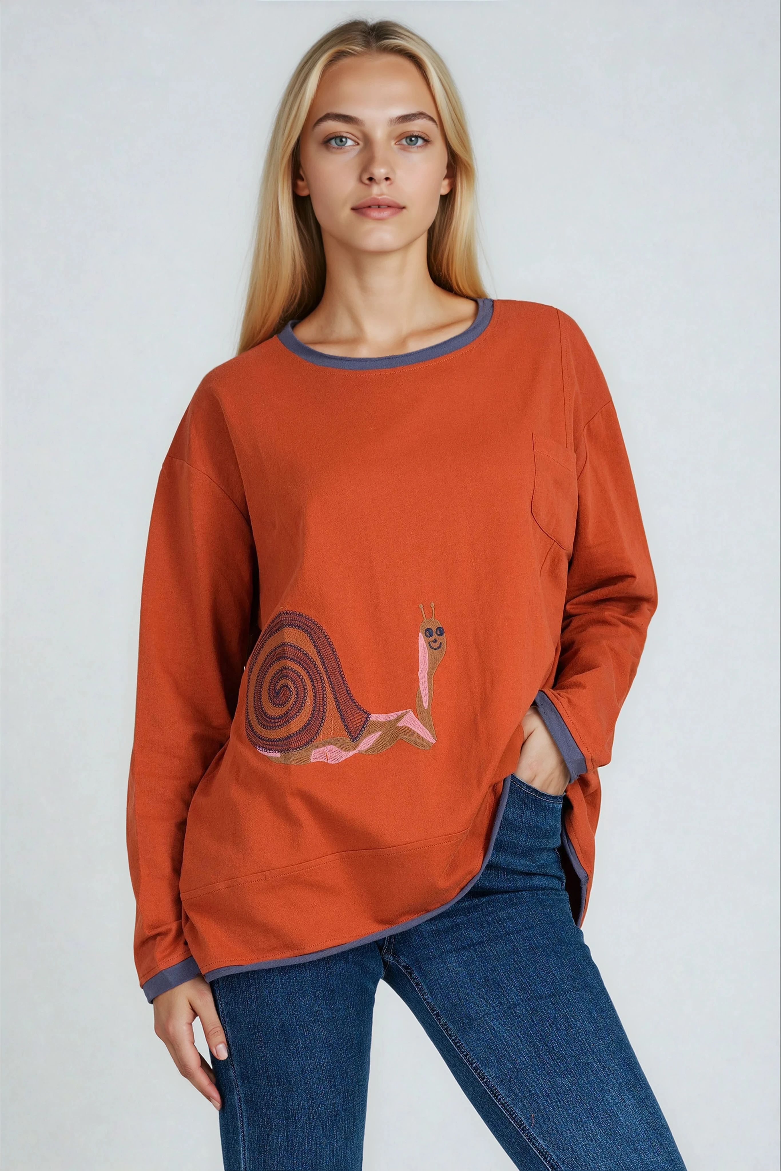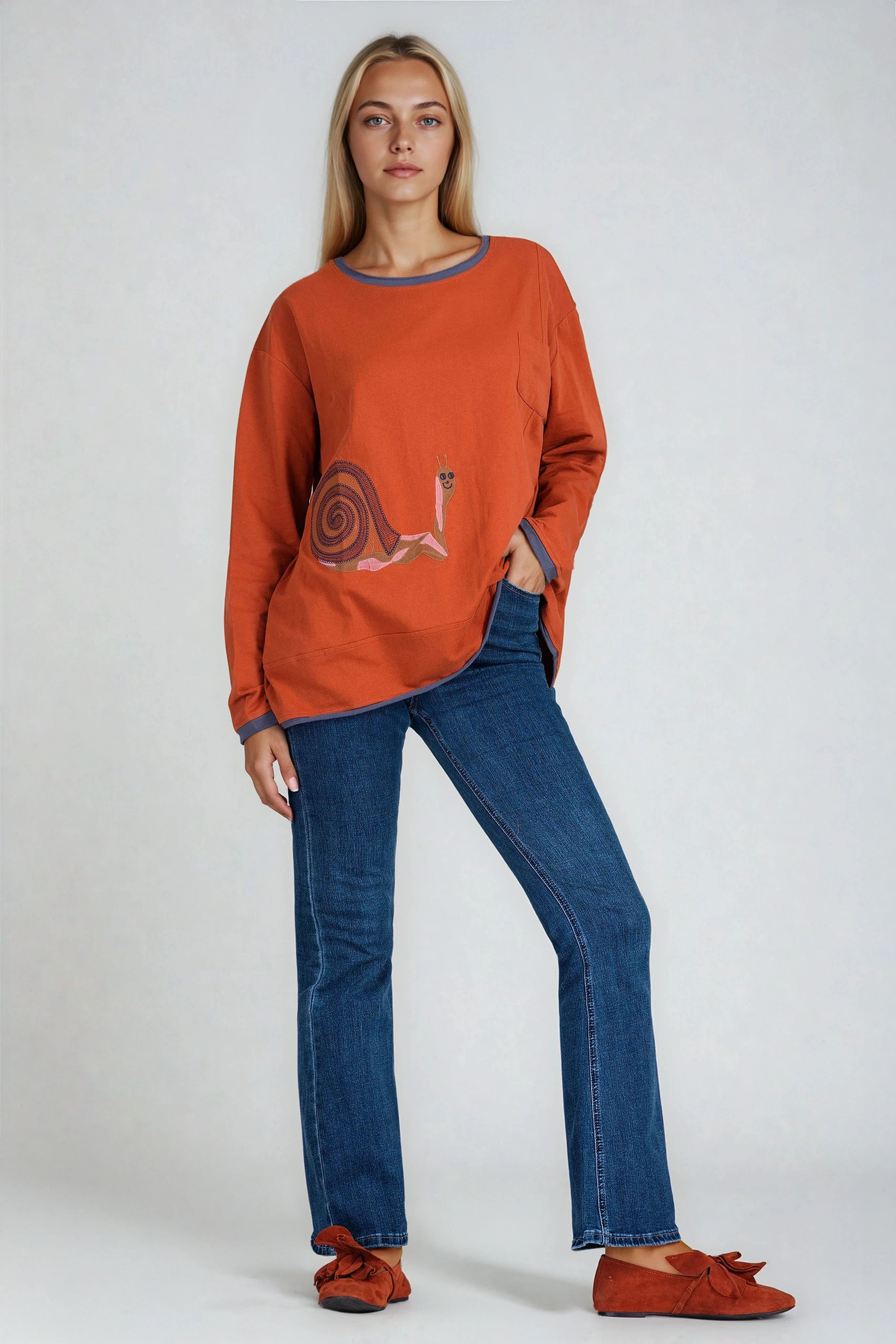 Оранжева памучна блуза с обло деколте и елегантни кафяви кантове по ръкавите и подгъва. Моделът е украсен с бродиран охлюв, които добавят стилен акцент към класическата визия. Изработена от мек трикотаж, осигурява комфорт и свобода на движение. Подходяща за ежедневието през преходния сезон.