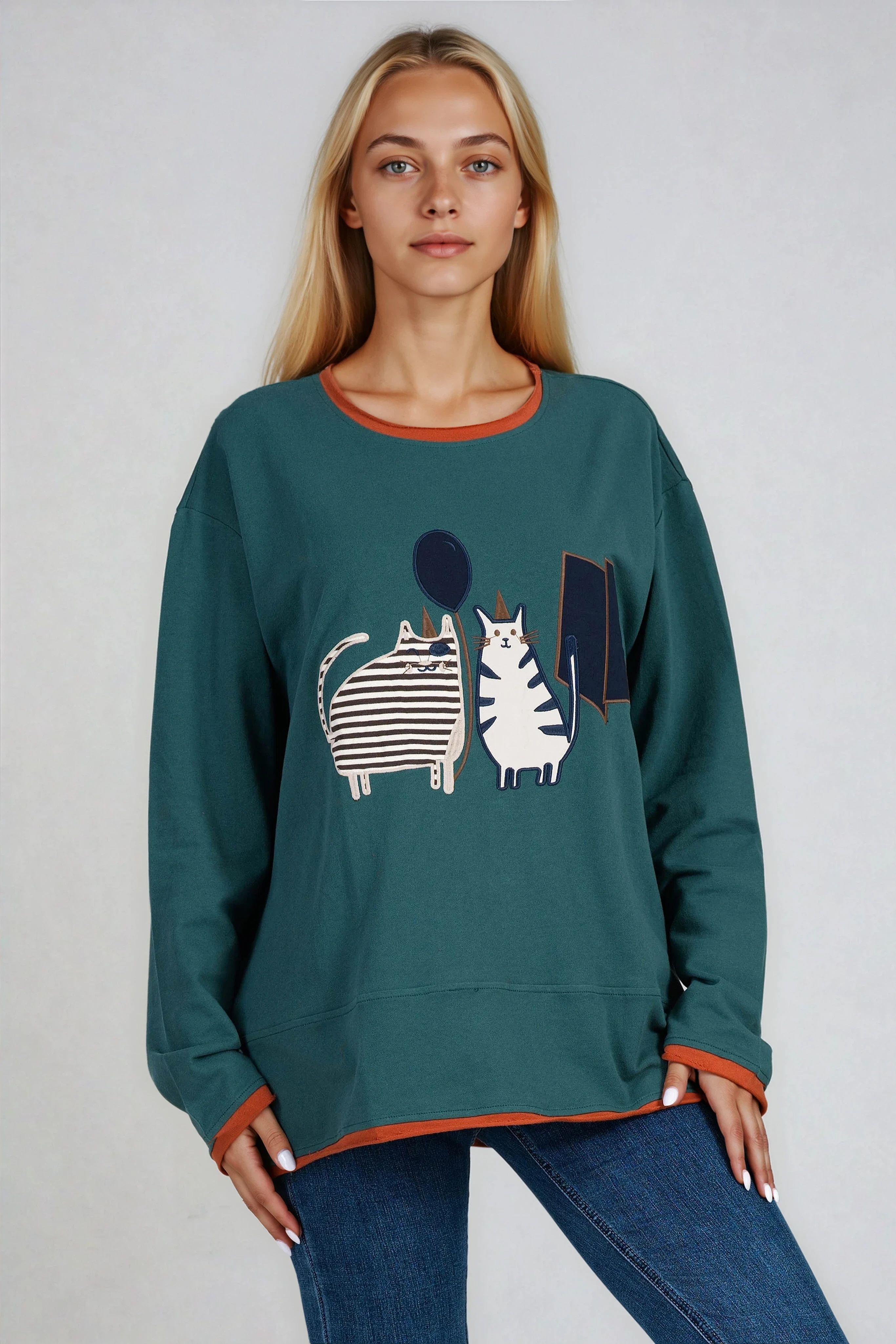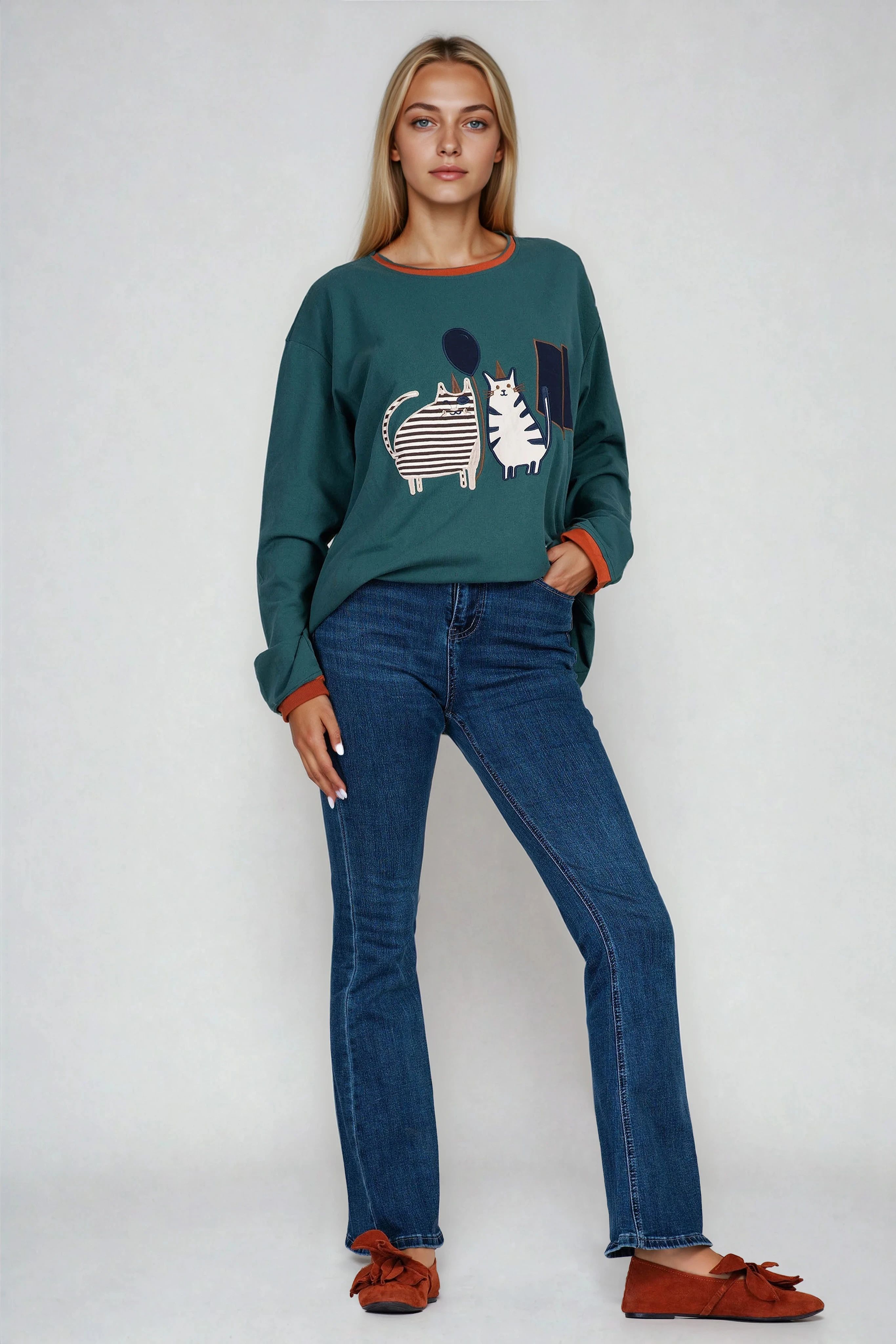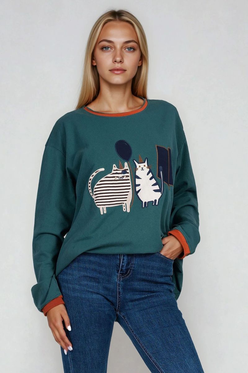 Дамска блуза от памук в зелено с цветен кант и две апликирани котки