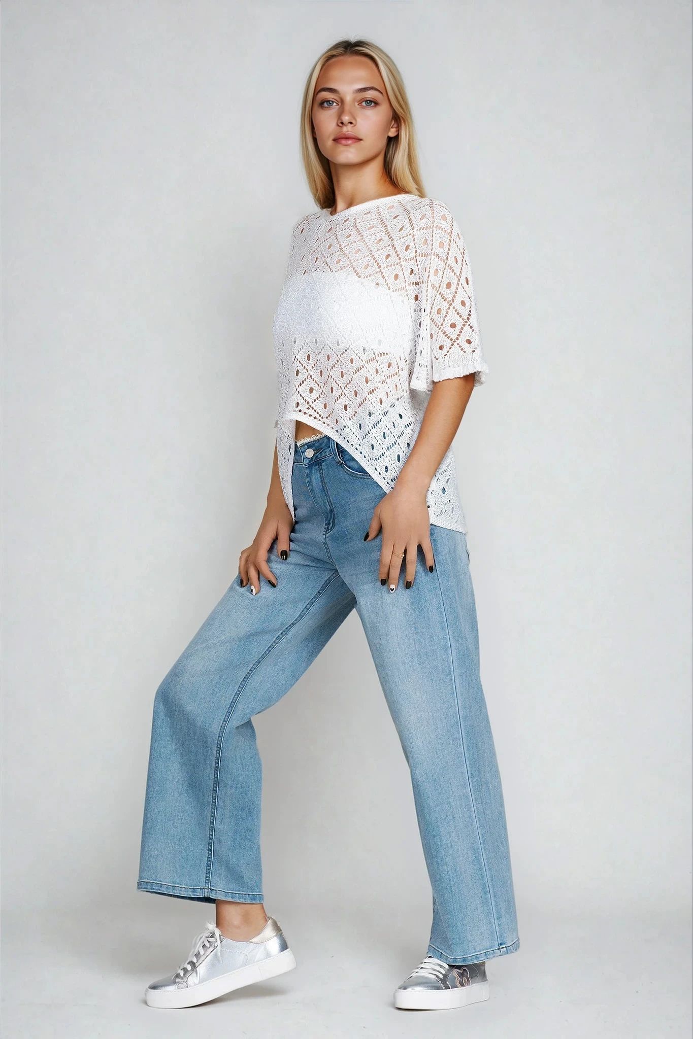 Елегантна блуза с ефектна едра плетка и изискано остро деколте. Изработена от фино плетиво, украсено със ситни пайети тип ламе, моделът съчетава комфорт с изразена женственост. Свободната кройка с издължен заден подгъв я прави подходяща за всекидневие и вечерни излизания. Белият и нюанс лесно се комбинира с всички цветове.