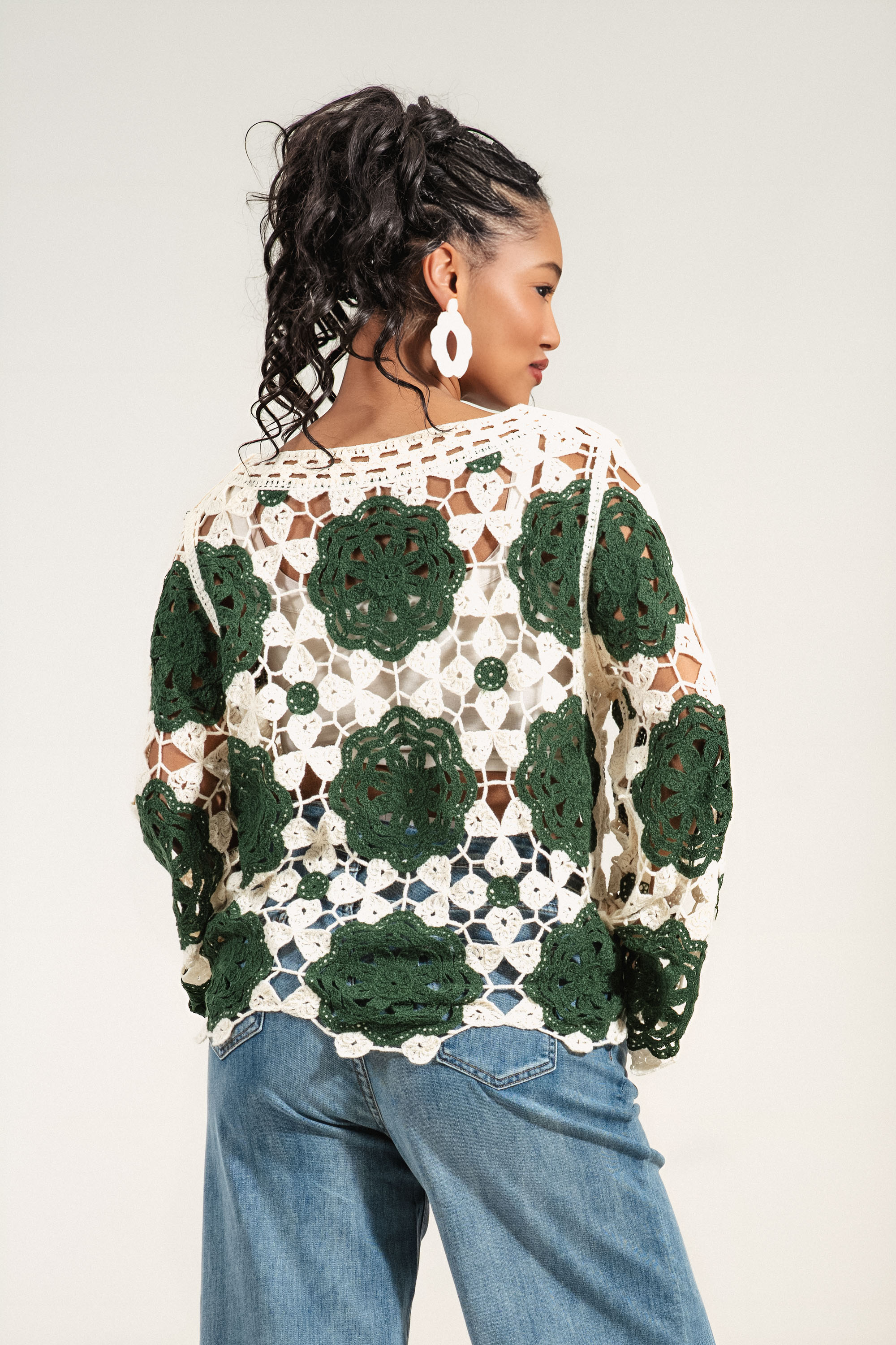 Блуза от чист памук с подчертана женственост и комфортна свободна кройка. Акцентът е върху декоративната флорална бродерия в зелено, която придава артистичен характер. Облото деколте и ръкавите тип "плетиво на една кука" подчертават деликатен силует. Моделът е подходящ за пролетния сезон и се комбинира лесно с панталони или поли в неутрални тонове.