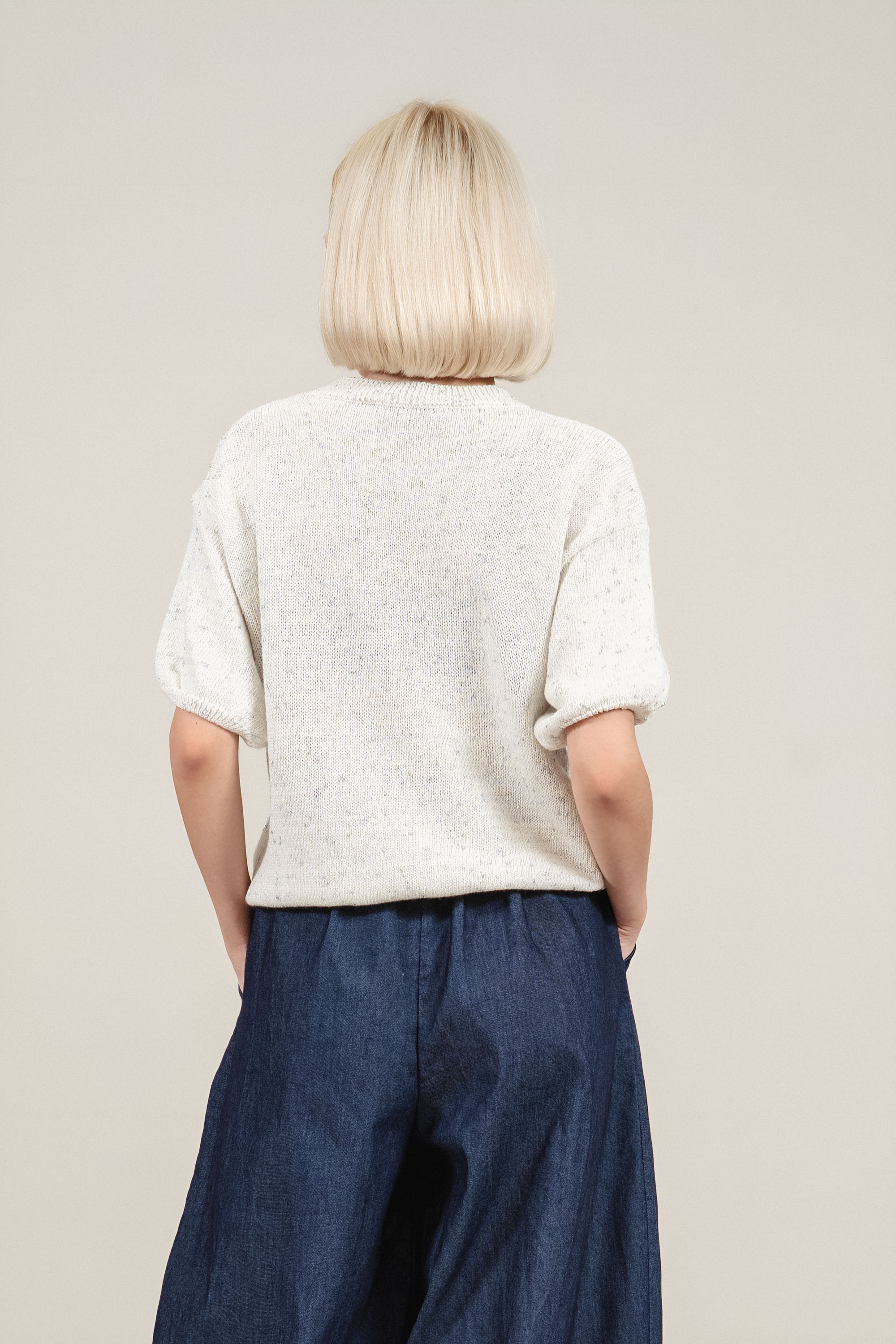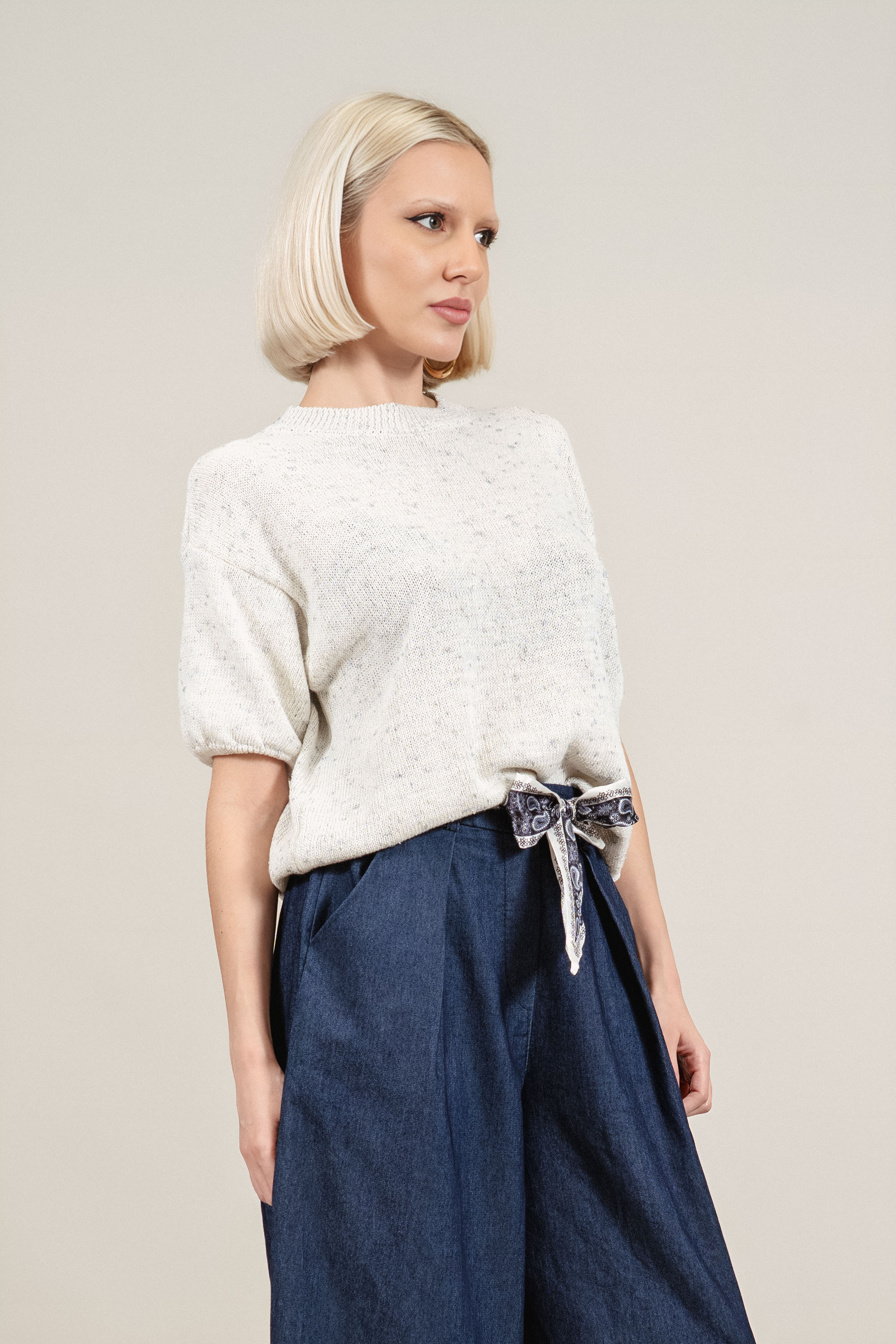Елегантен модел от фино плетиво с деликатен сренрист отблясък, който придава изискан акцент на визията. Облото деколте и късите ръкави оформят балансиран силует, подходящ както за ежедневието, така и за по-елегантни поводи. Памучното съдържание осигурява комфорт и мекота, а вплетените нишки със сребрист ефект добавят модерно излъчване. Лесно се комбинира с панталон, пола или деним за завършена градска визия.