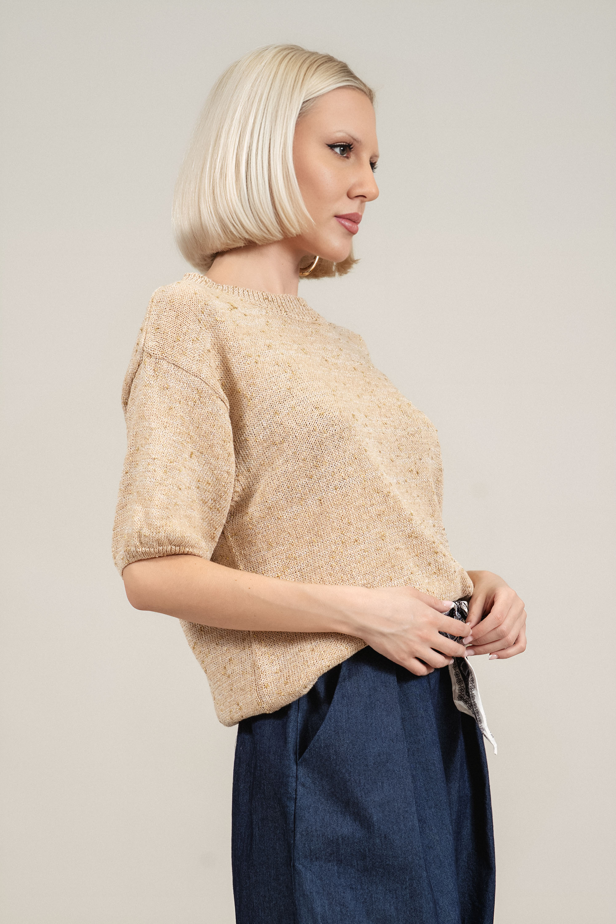 Елегантен модел от фино плетиво с деликатен златист отблясък, който придава изискан акцент на визията. Облото деколте и късите ръкави оформят балансиран силует, подходящ както за ежедневието, така и за по-елегантни поводи. Памучното съдържание осигурява комфорт и мекота, а вплетените нишки със златист ефект добавят модерно излъчване. Лесно се комбинира с панталон, пола или деним за завършена градска визия.