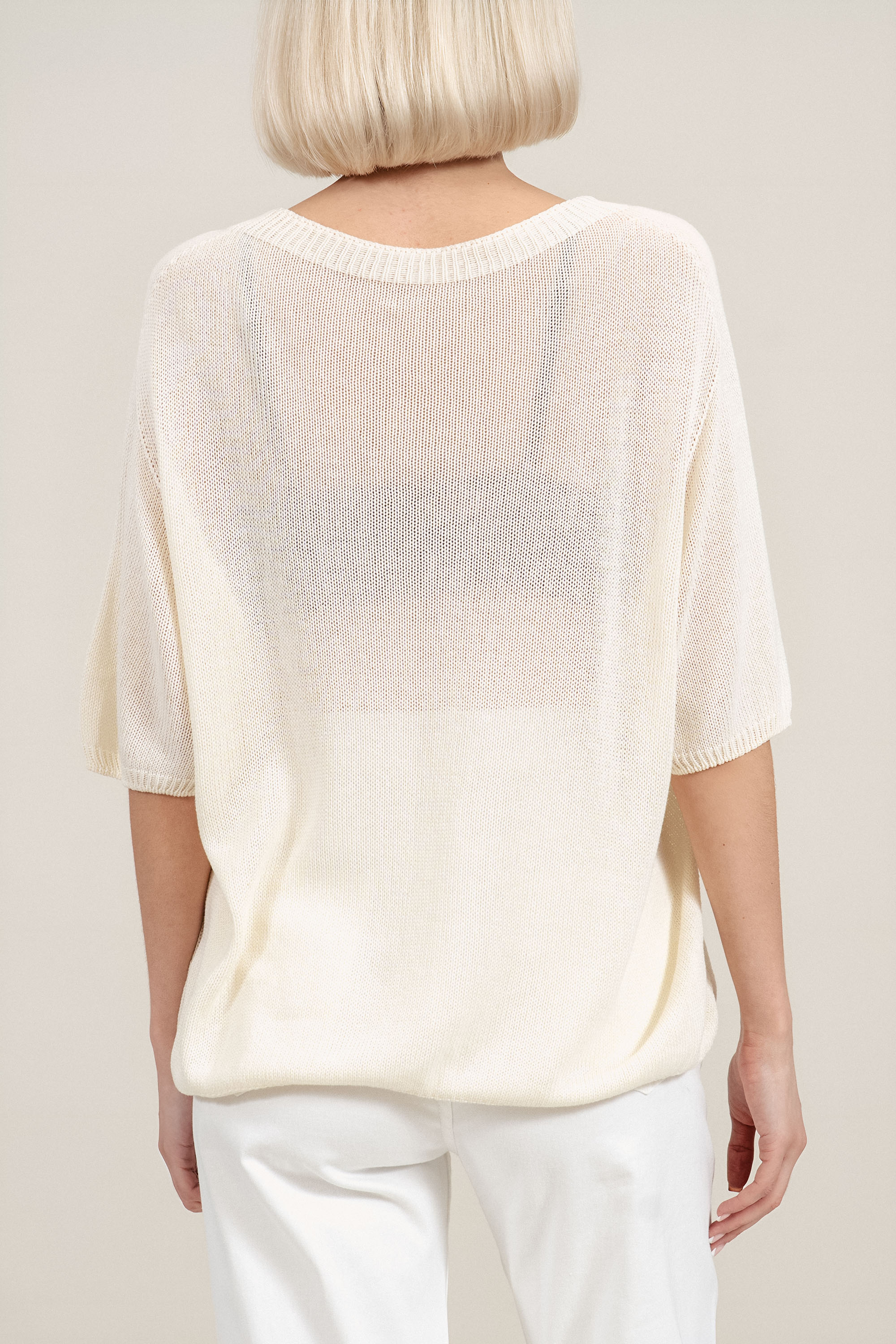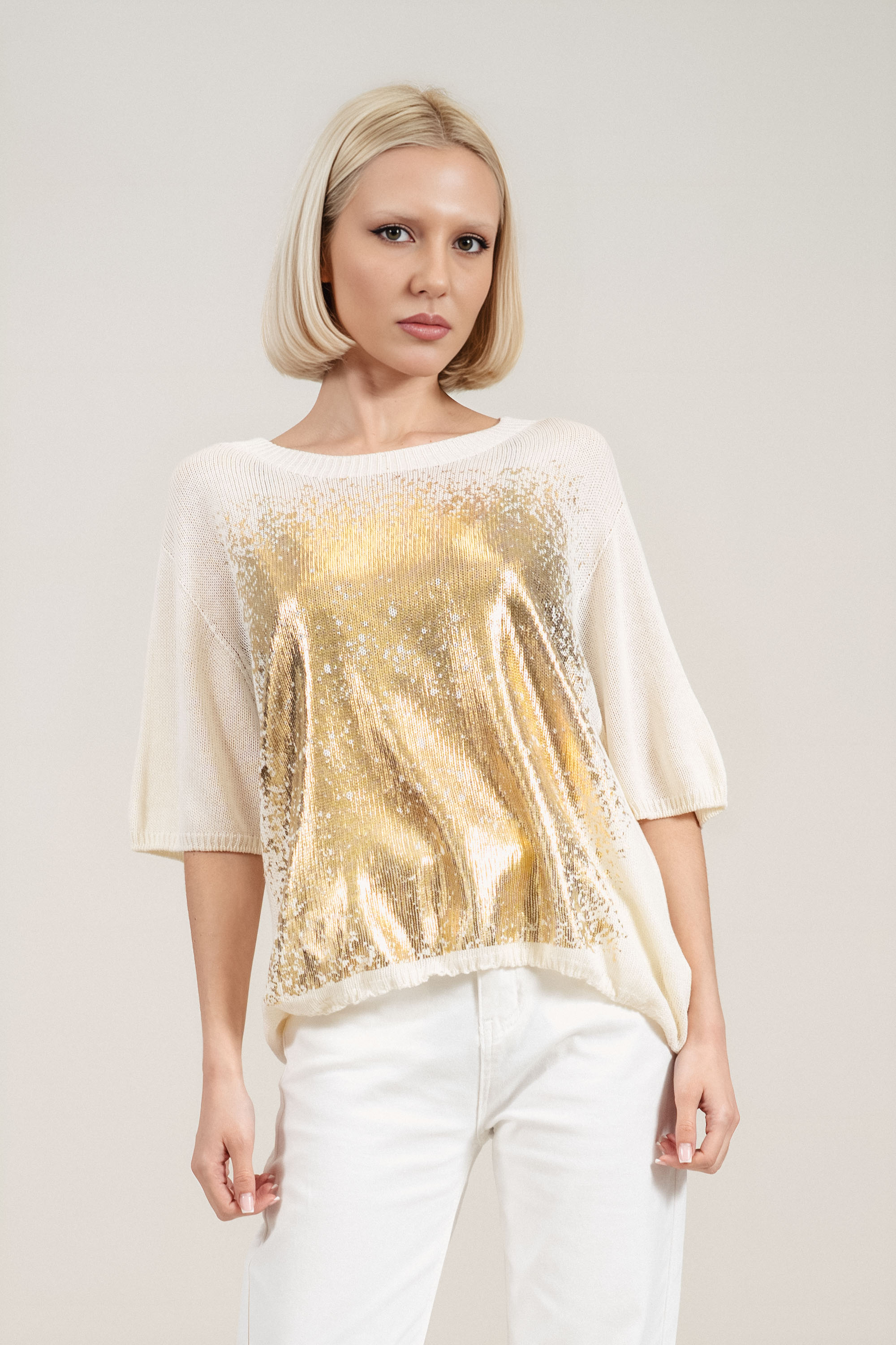 Елегантен модел от фино плетиво с деликатен златист отблясък, който придава изискан акцент на визията. Облото деколте и късите ръкави оформят балансиран силует, подходящ както за ежедневието, така и за по-елегантни поводи. Вплетените нишки със златист ефект добавят модерно излъчване. Лесно се комбинира с панталон, пола или деним за завършена градска визия.