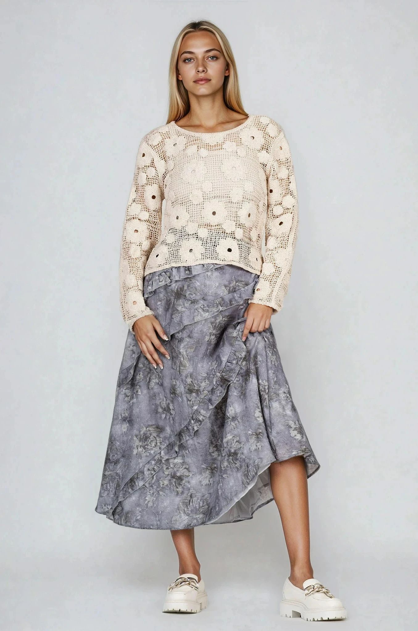 Уникална блуза от едро плетиво, създаващо мрежест ефект с декоративно бродирани цветя. Облото деколте и свободната кройка осигуряват комфорт и стил, подходящи за пролетно-летните дни. Може да се носи както самостоятелно, така и наслоено върху потник или топ.