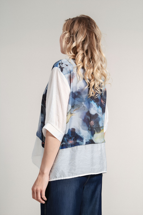 Тази ефирна блуза впечатлява с артистичен акварелен принт и плавна линия. Вискозната материя осигурява мекота и лекота при носене, а издължената задна част придава модерен силует. Идеална за ежедневни и полуофициални визии в пролетно-летния сезон.