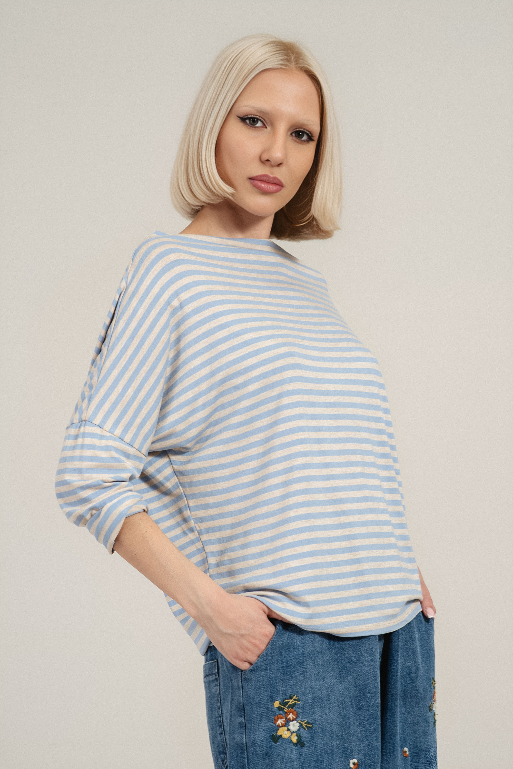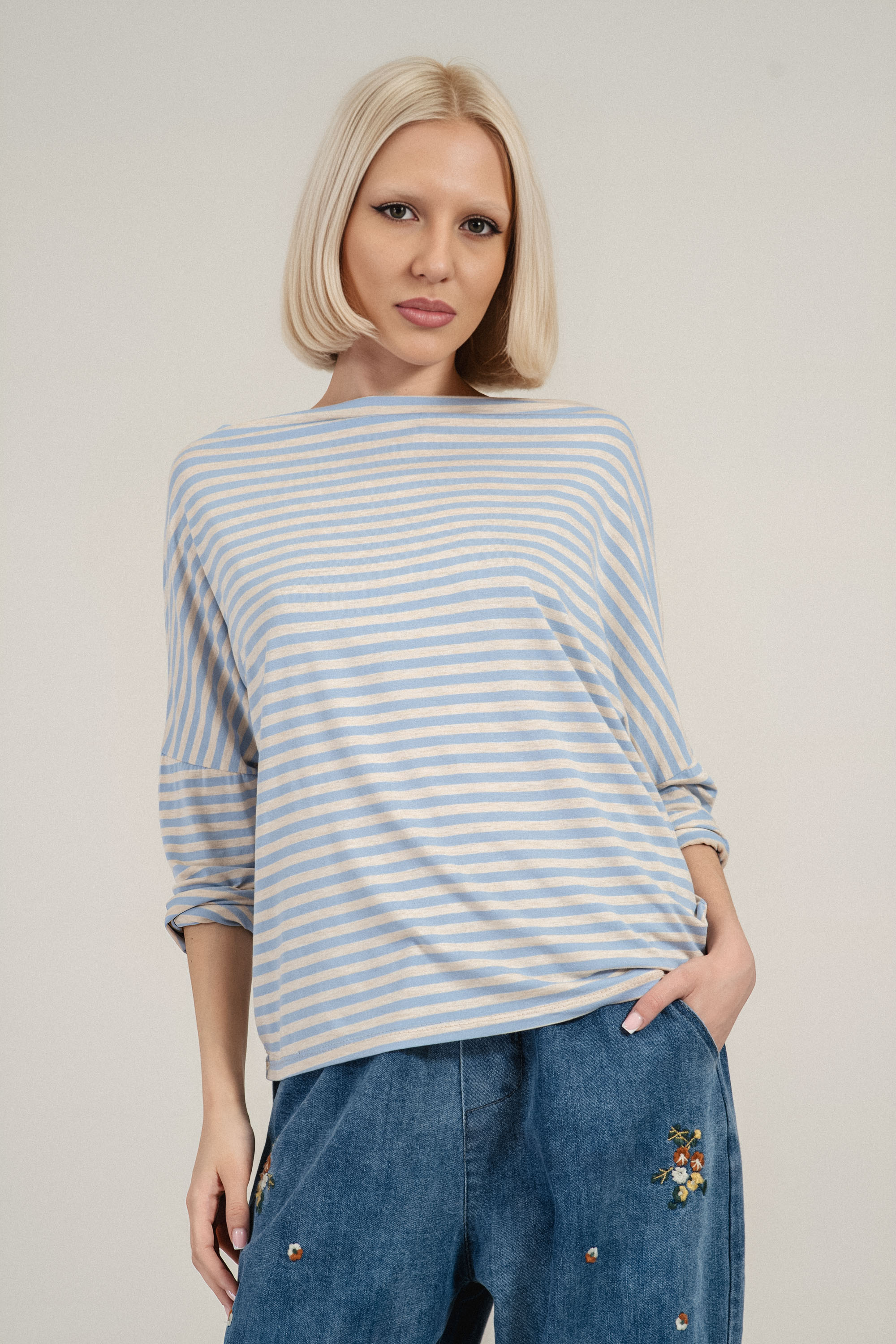 Лека и комфортна блуза от вискозно трико, създадена за ежедневен стил и удобство през целия ден. Меката материя се отличава с естествена мекота, което я прави подходяща за пролетния и летния сезон. Моделът е с обло деколте, дълги ръкави и свободен силует, който пада естествено по тялото. Финото райе в синьо и бежово добавя свеж акцент и прави модела лесен за комбиниране с различни градски визии.