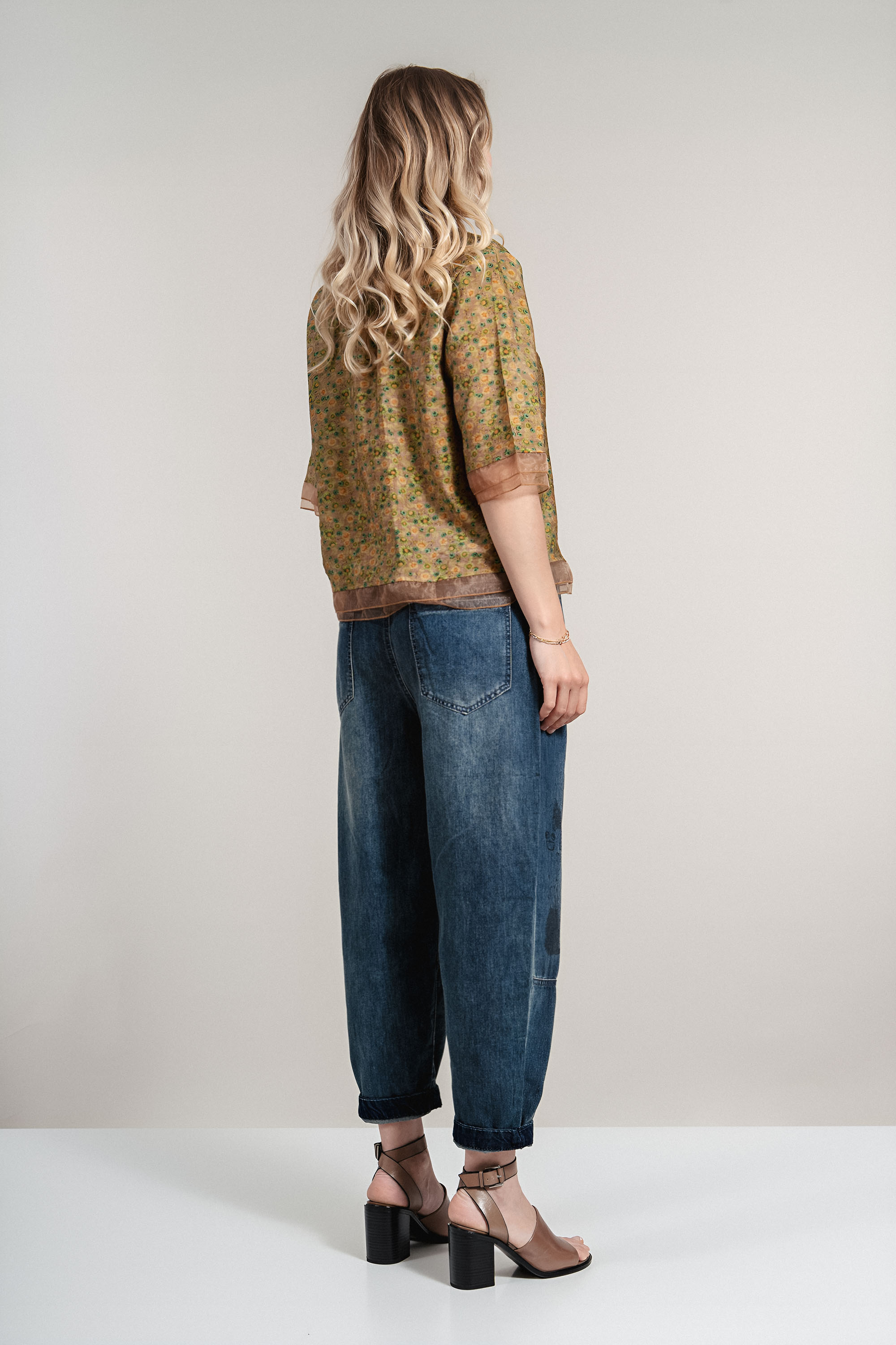 Дамска блуза с флорален бежово-зелен принт и акцент с тюл