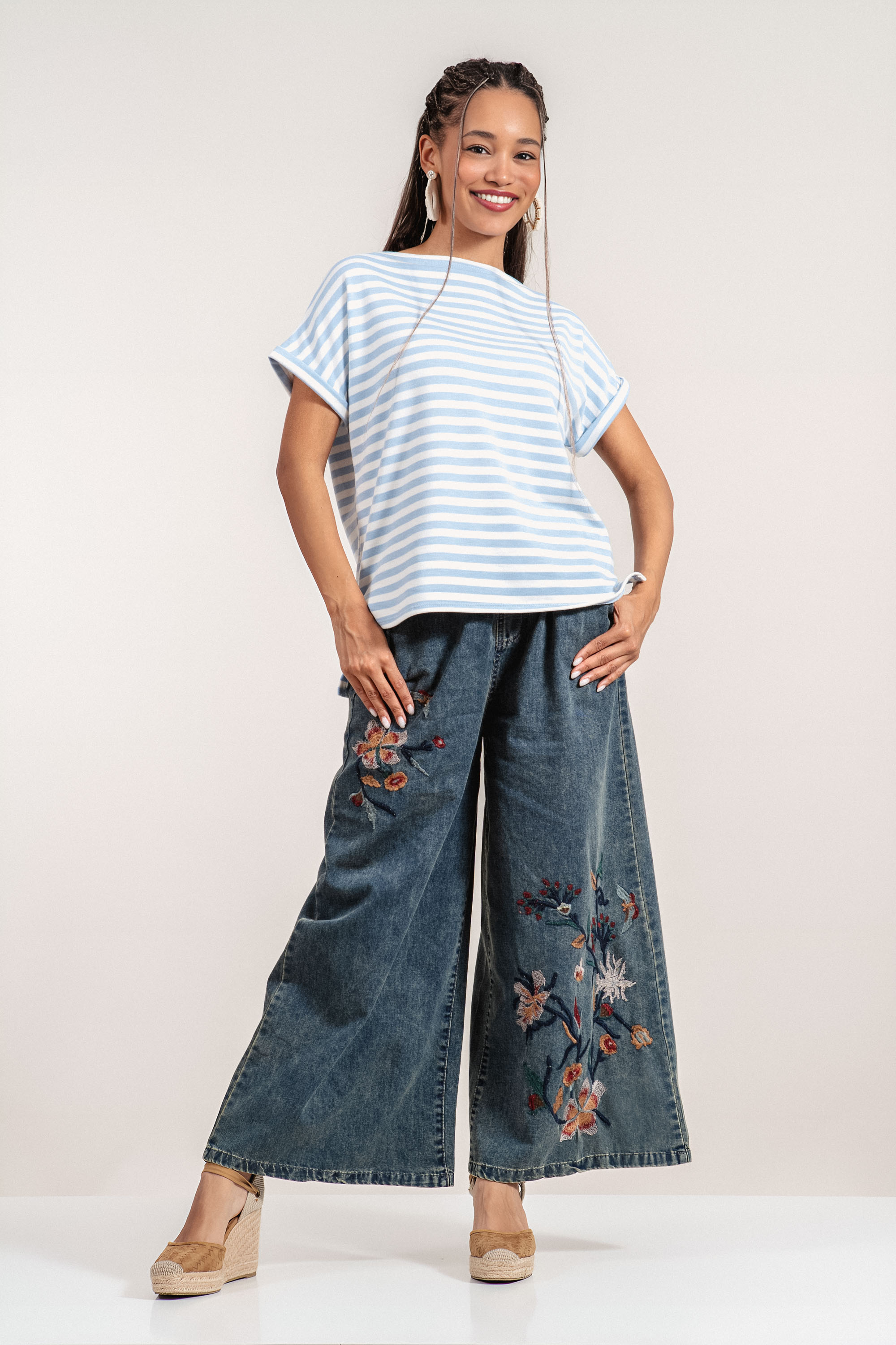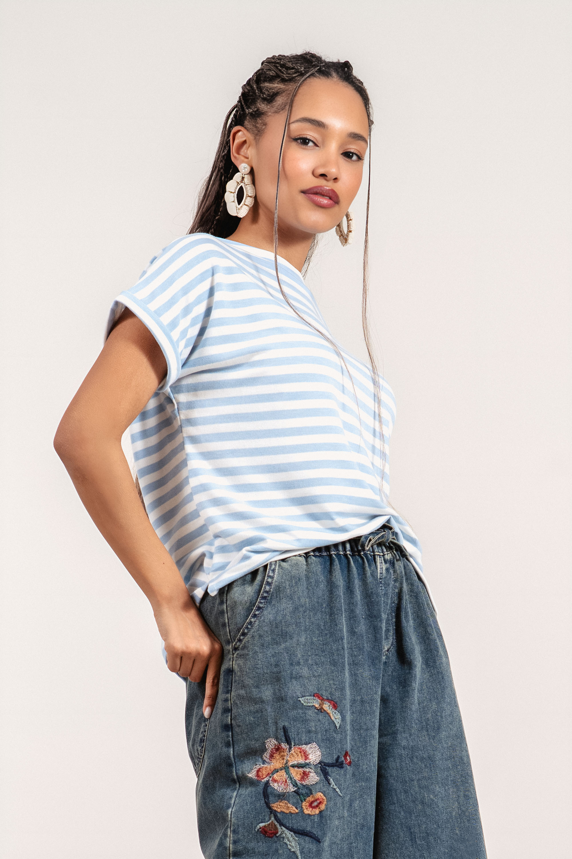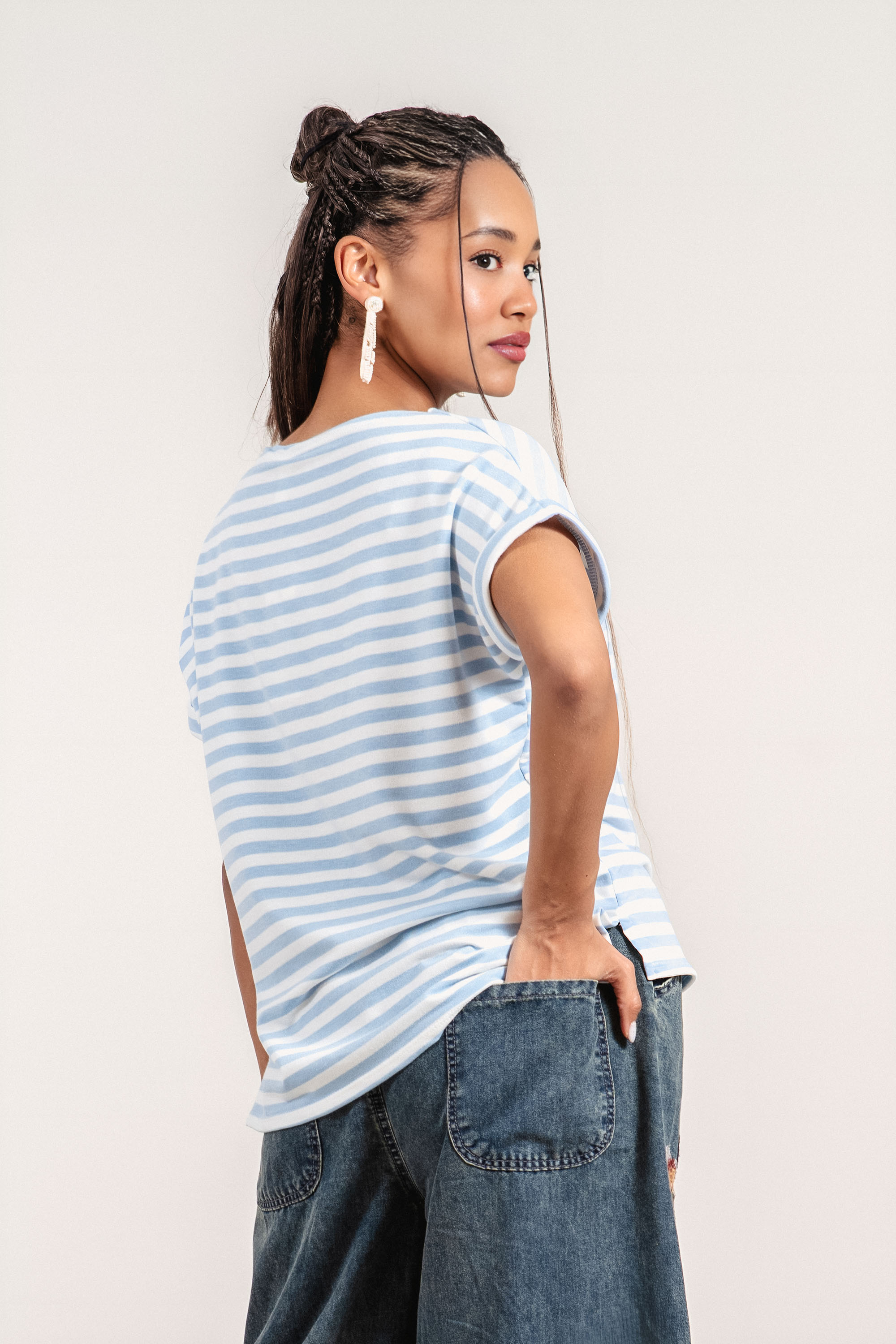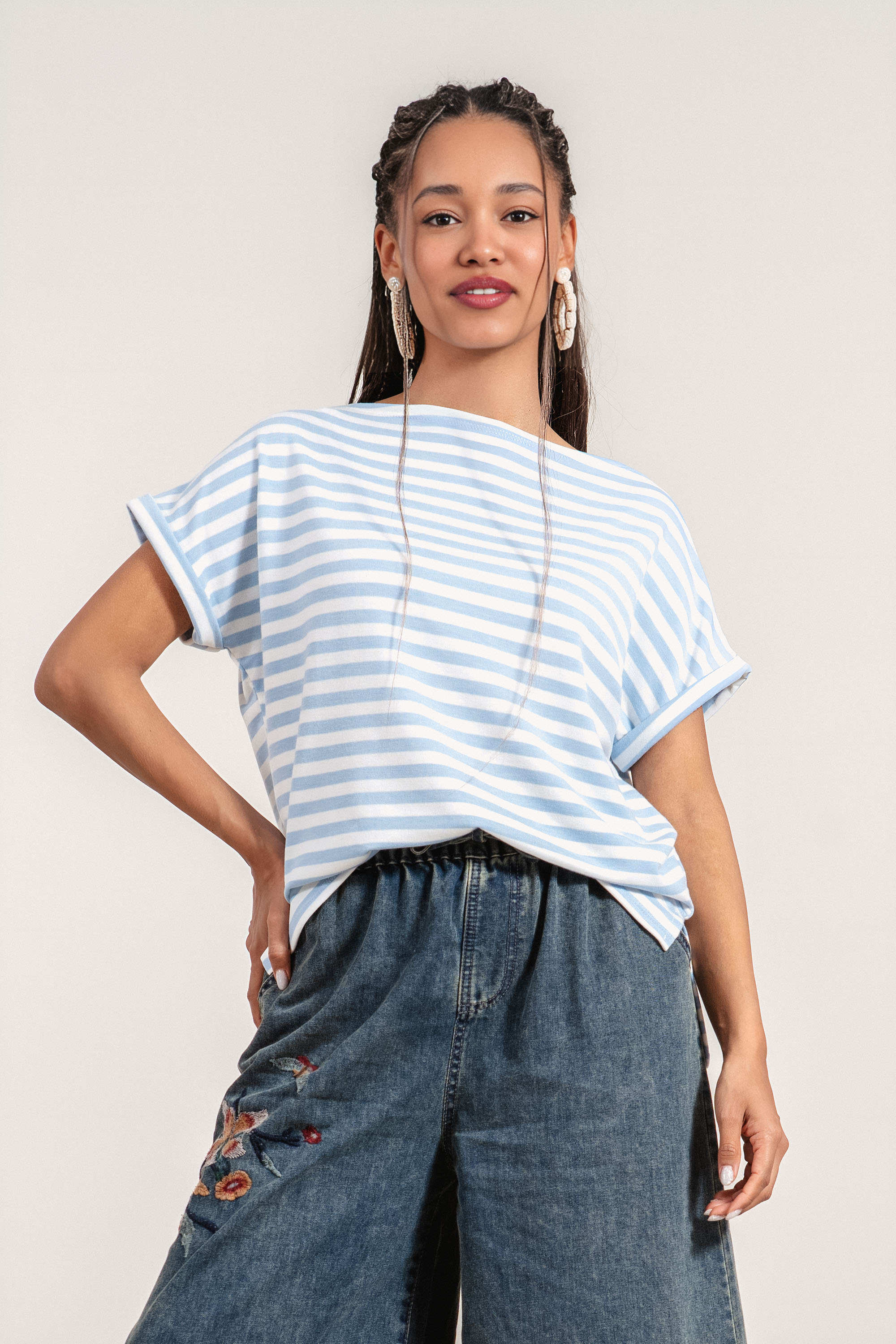 Стилна туника с изчистен дизайн и модерно излъчване, подходяща за динамичното ежедневие. Комбинацията от вискоза и еластични влакна осигурява мекота, лекота и комфорт при носене. Свободният силует и падналият ръкав създават непринудена визия, а класическото райе в синьо добавя свеж акцент. Лесен за съчетаване модел, който се вписва както в ежедневни, така и в по-елегантни комбинации.
