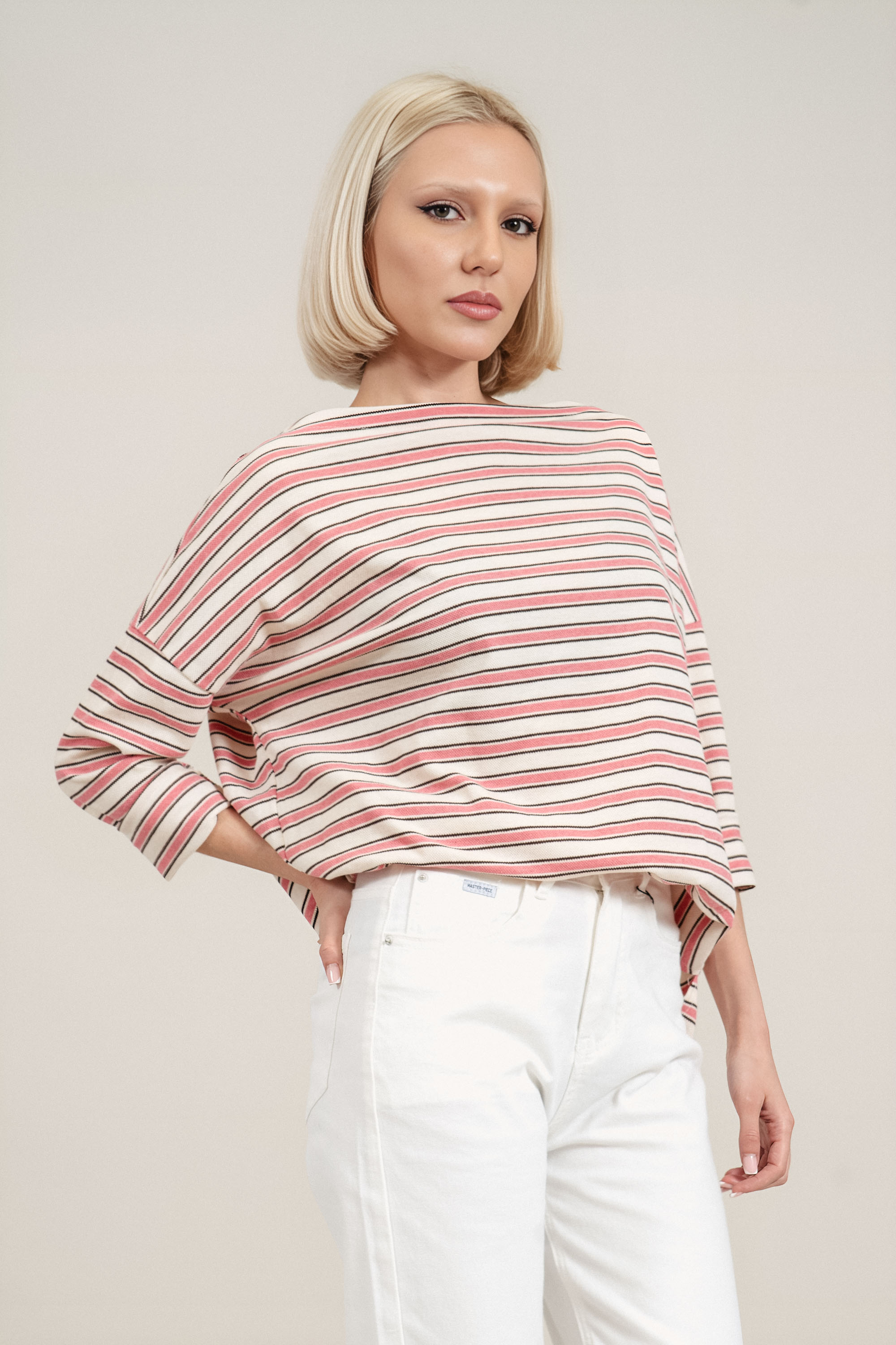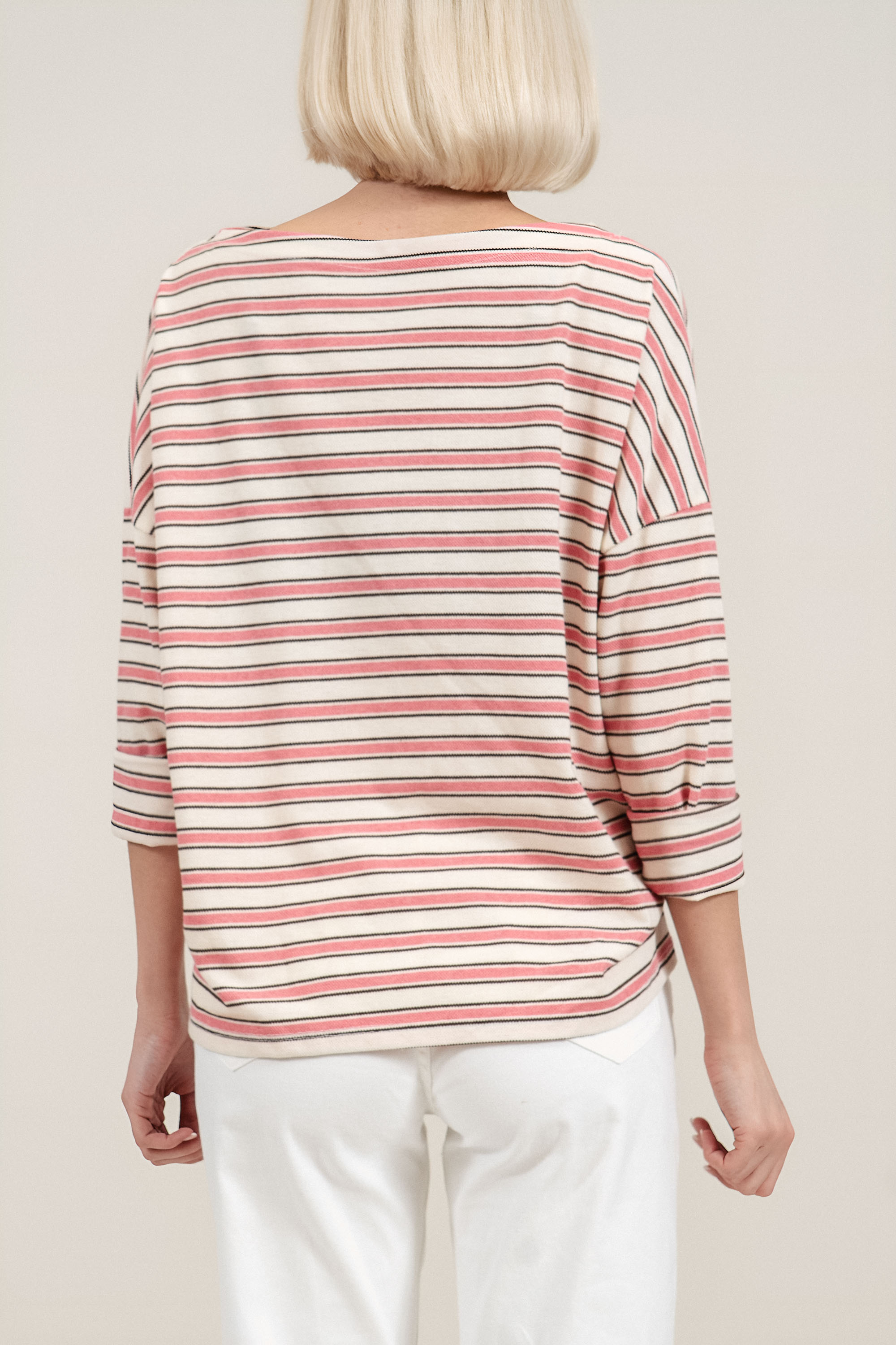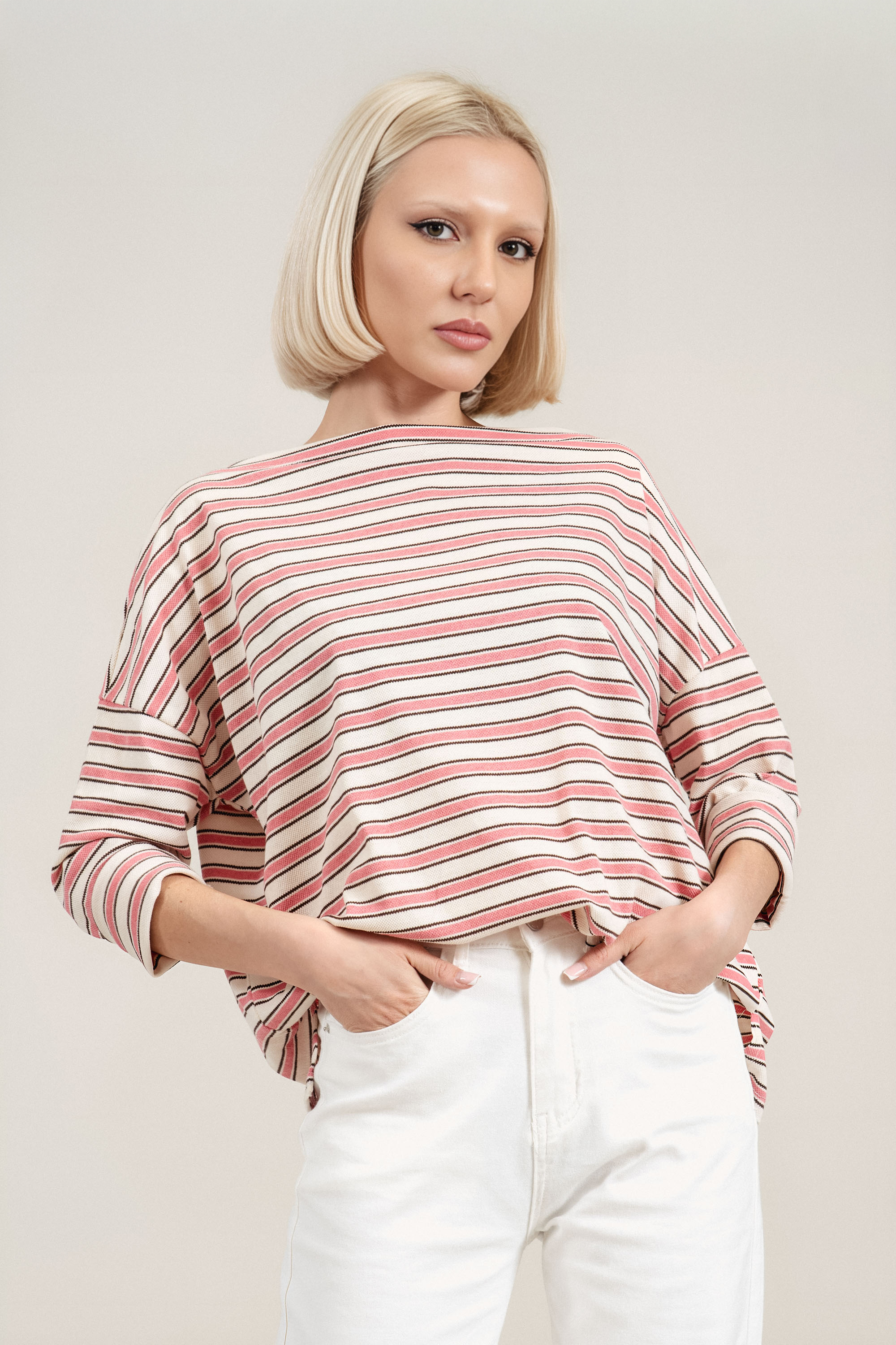 Елегантна блуза от фино плетиво. Лодка деколтето подчертава линията на раменете, а хоризонталното райе в розово и кафяво върху светъл фон придава свеж акцент. Материята е с лека еластичност, която осигурява комфорт и свобода на движение през целия ден. Подходящ избор за пролетно-летния сезон, както за ежедневна визия, така и за по-елегантни градски комбинации.