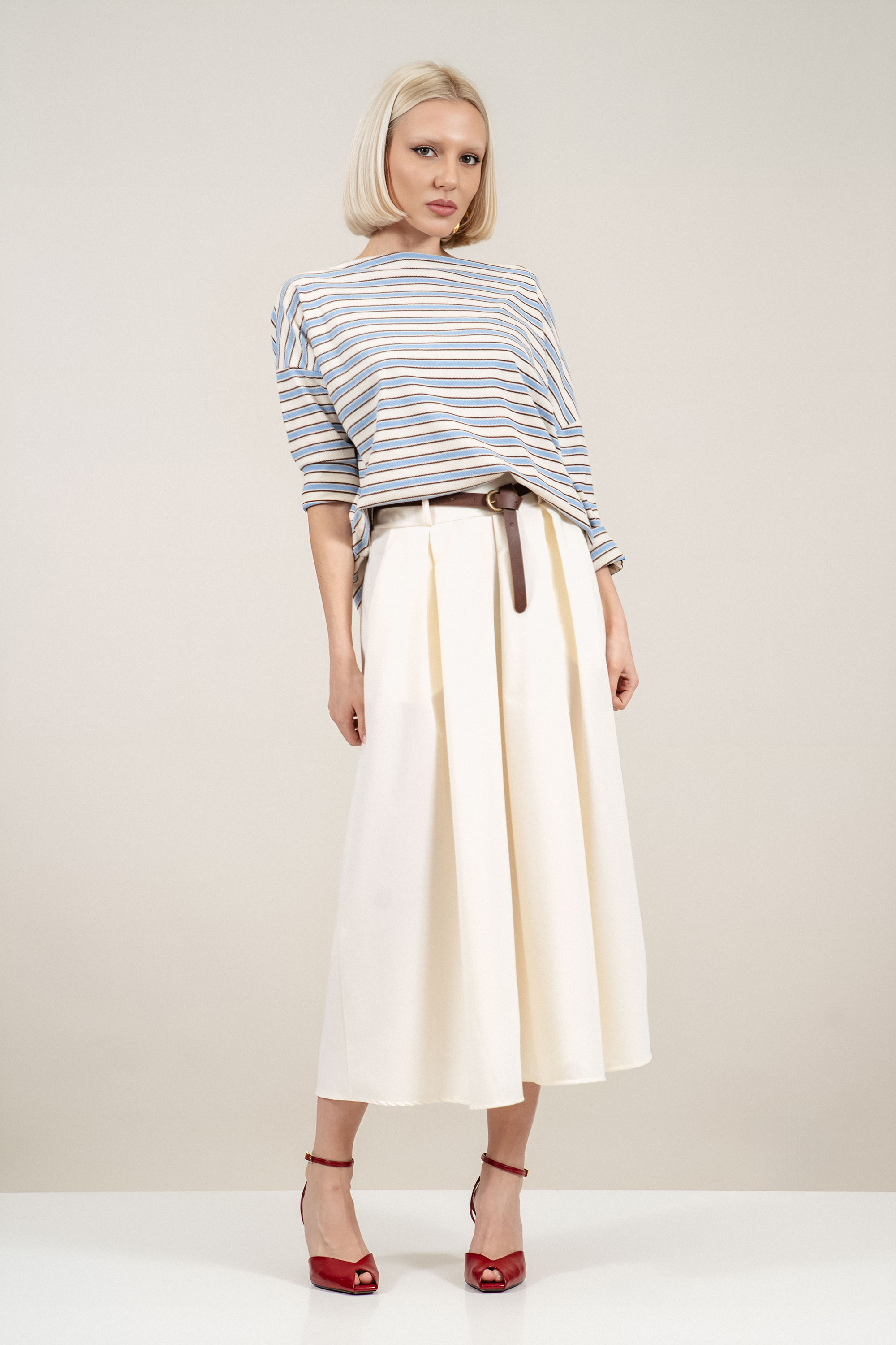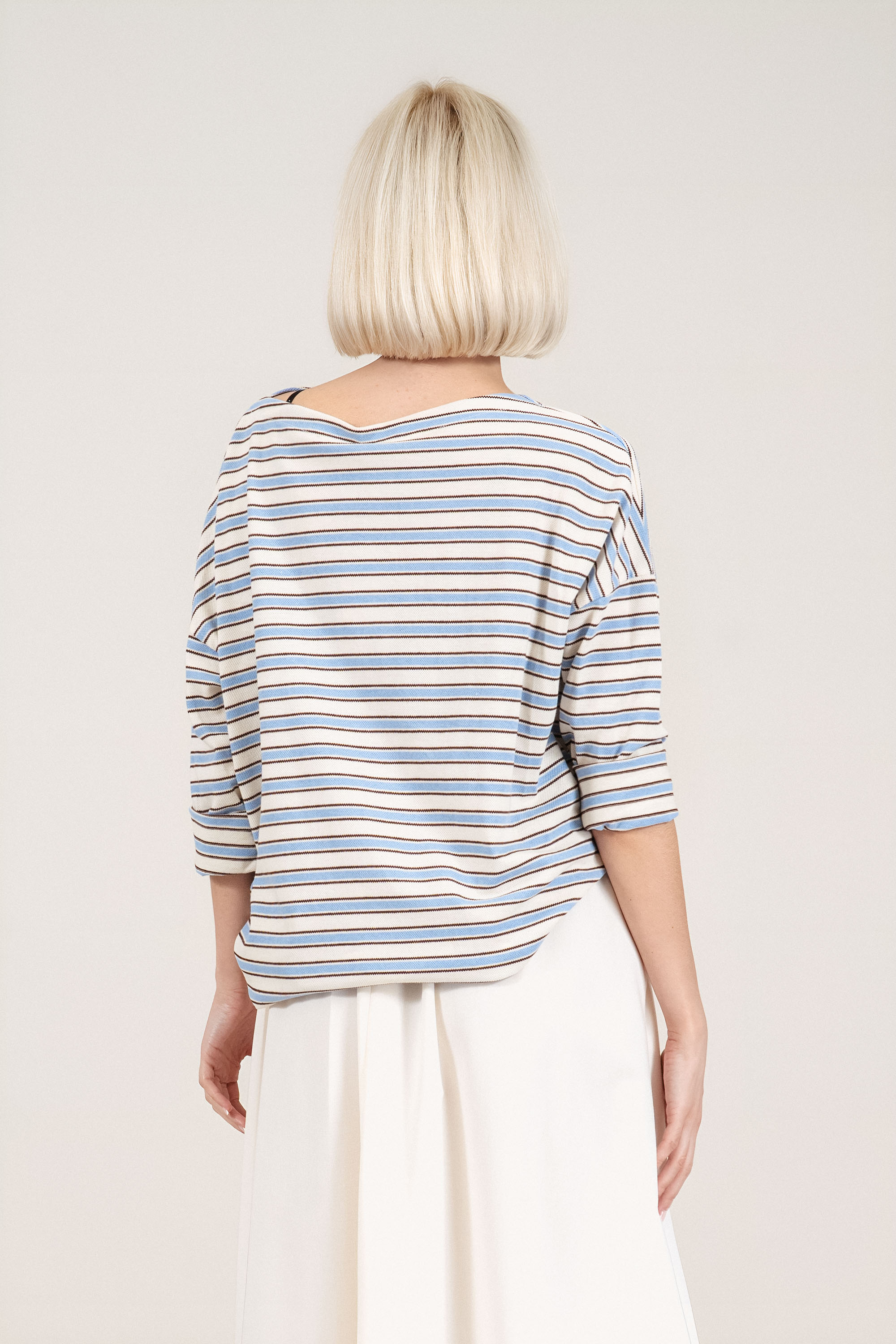 Елегантна блуза от фино плетиво. Лодка деколтето подчертава линията на раменете, а хоризонталното райе в синьо и кафяво върху светъл фон придава свеж морски акцент. Материята е с лека еластичност, която осигурява комфорт и свобода на движение през целия ден. Подходящ избор за пролетно-летния сезон, както за ежедневна визия, така и за по-елегантни градски комбинации.