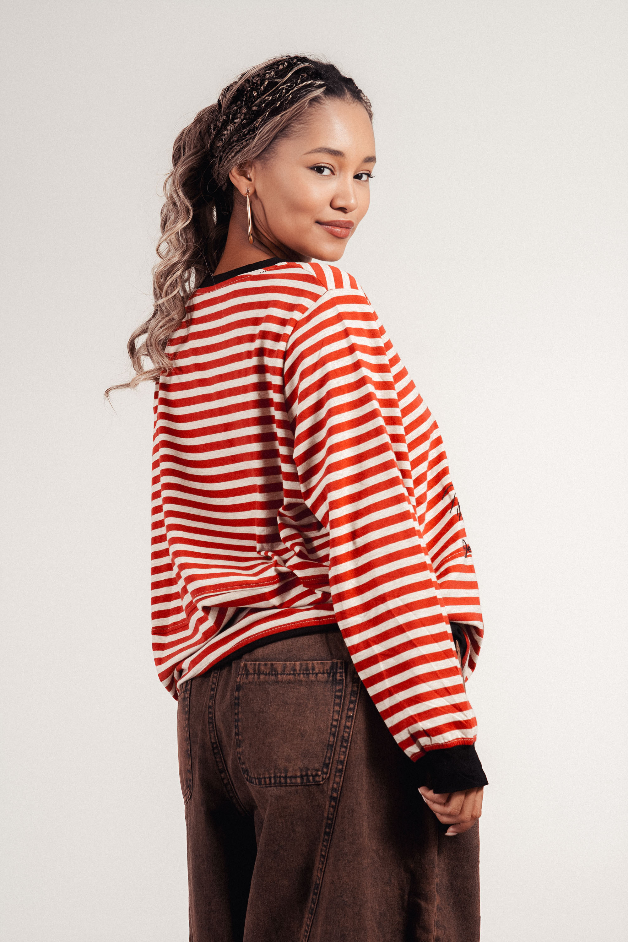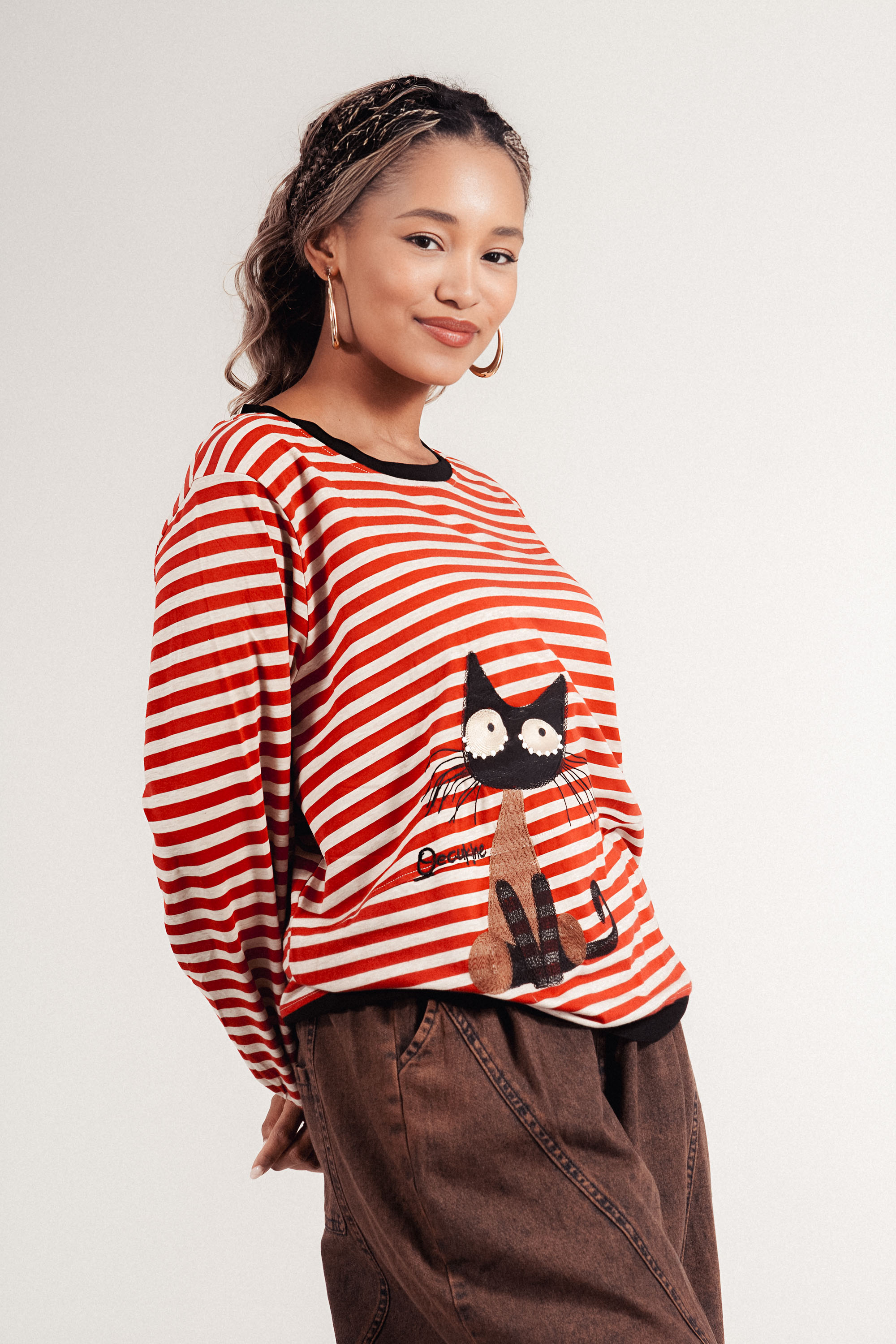 Дамска блуза с раиран принт в червено и бежово и бродирана котка