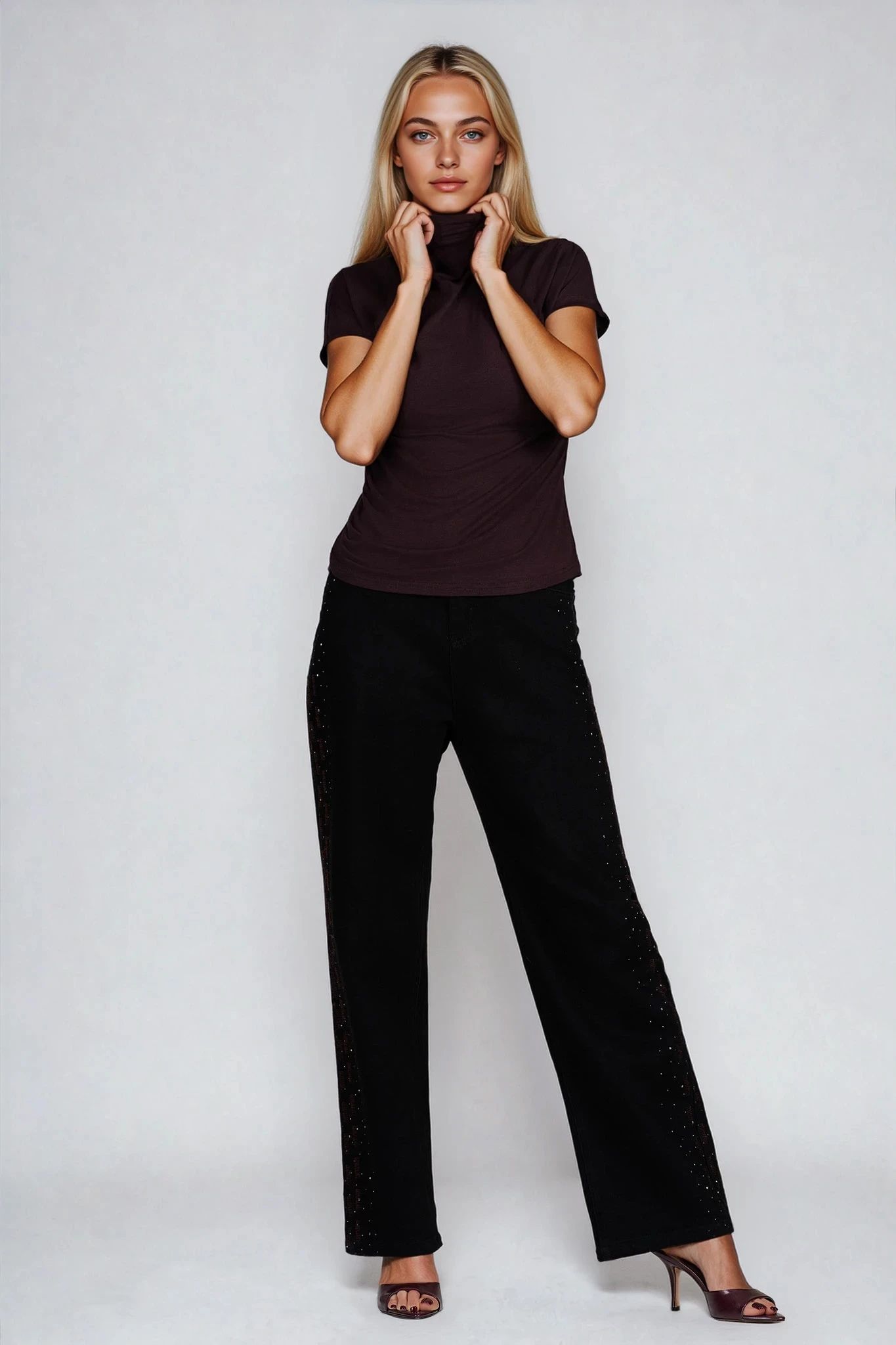 Тази блуза от меко трико съчетава минимализъм и модерна елегантност. Моделът е с висока яка, която подчертава фигурата. Материята е с високо съдържание на вискоза и еластичност, което осигурява комфорт и прилягане. Отличен избор за градски стил, офис или ежедневно носене.