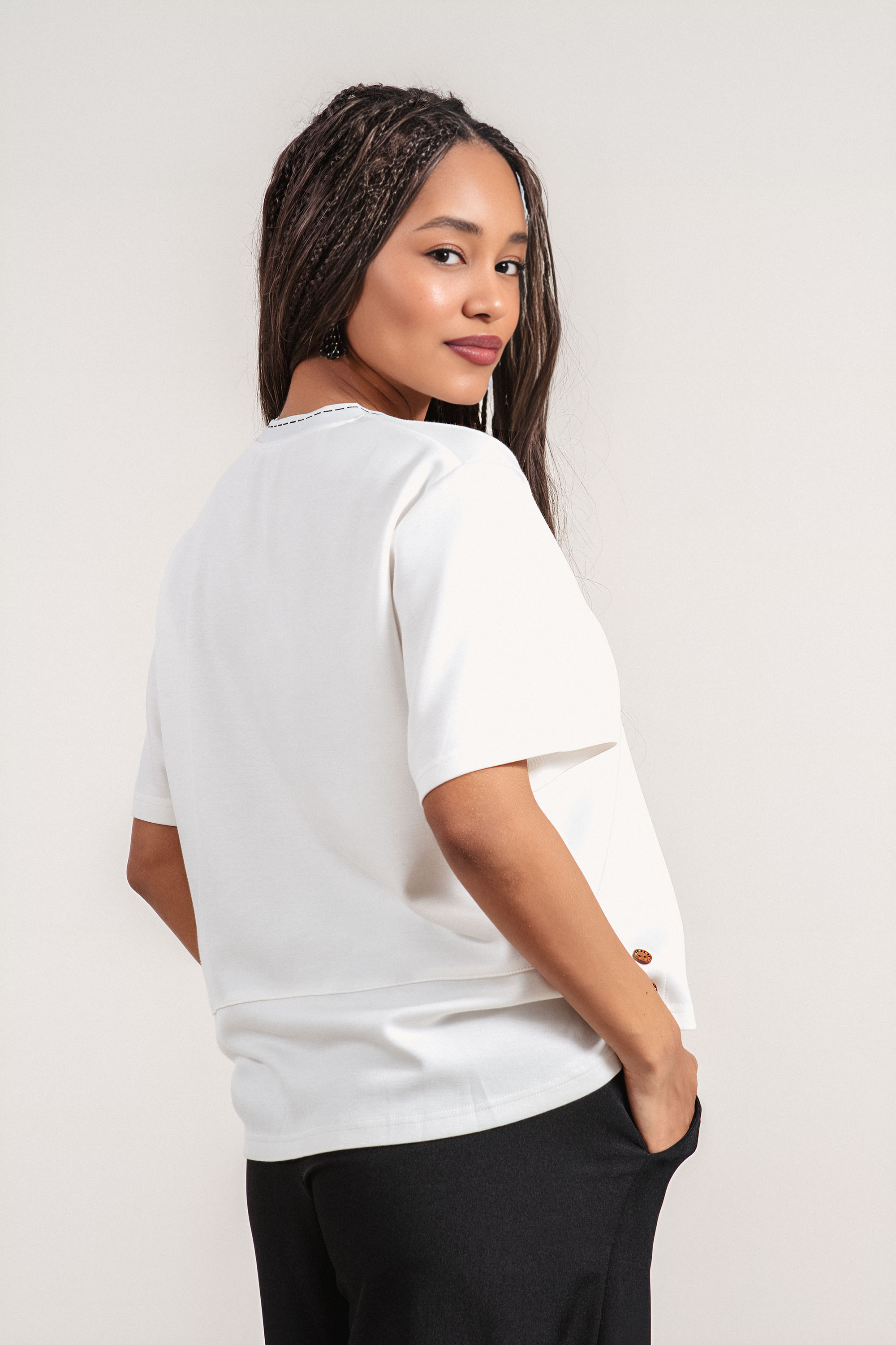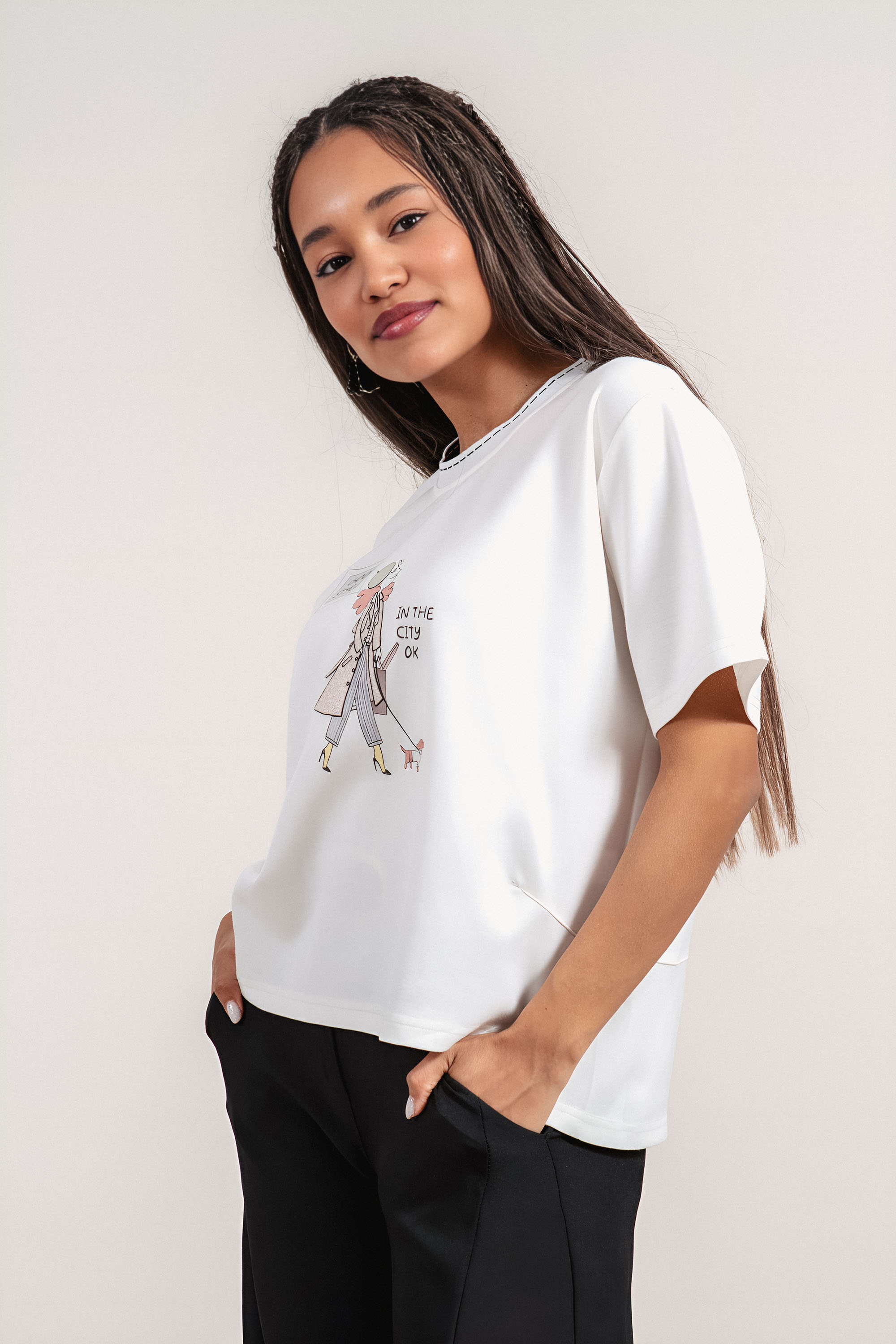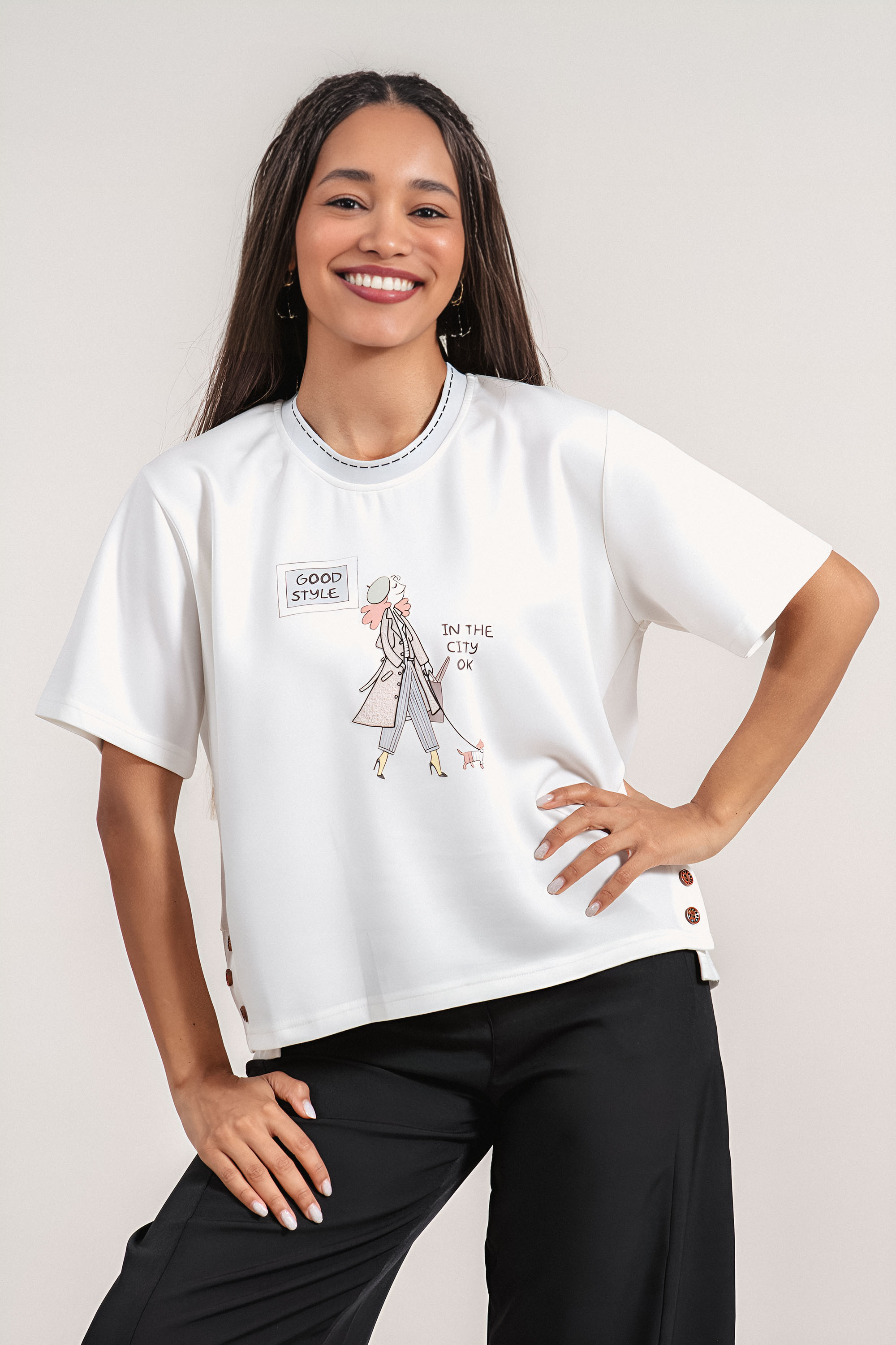 Модерна блуза с комфортна кройка, създадена за динамичното ежедневие. Материята с високо съдържание на район осигурява мекота и лекота, а добавената еластичност допринася за удобно прилягане. Акцент е артистичната щампа с женска фигура, която придава характер и индивидуалност на визията. Декоративните копчета от двете страни завършват дизайна с фин детайл и позволяват лесно комбиниране с панталони или дънки.