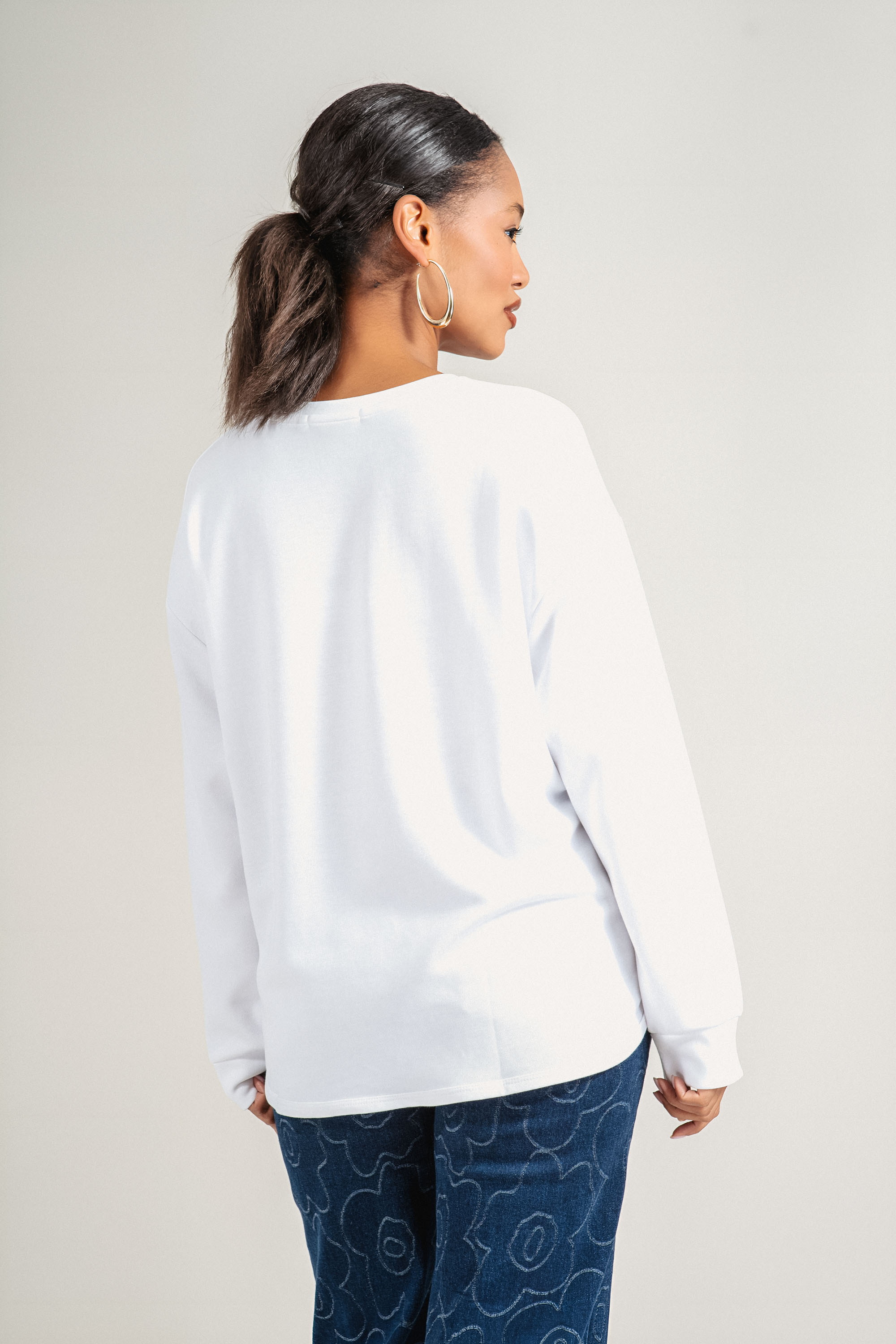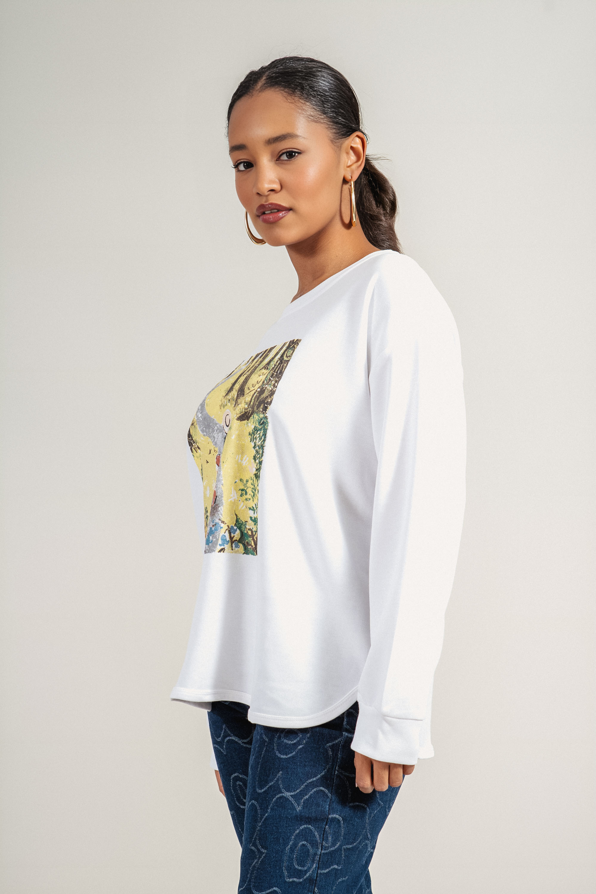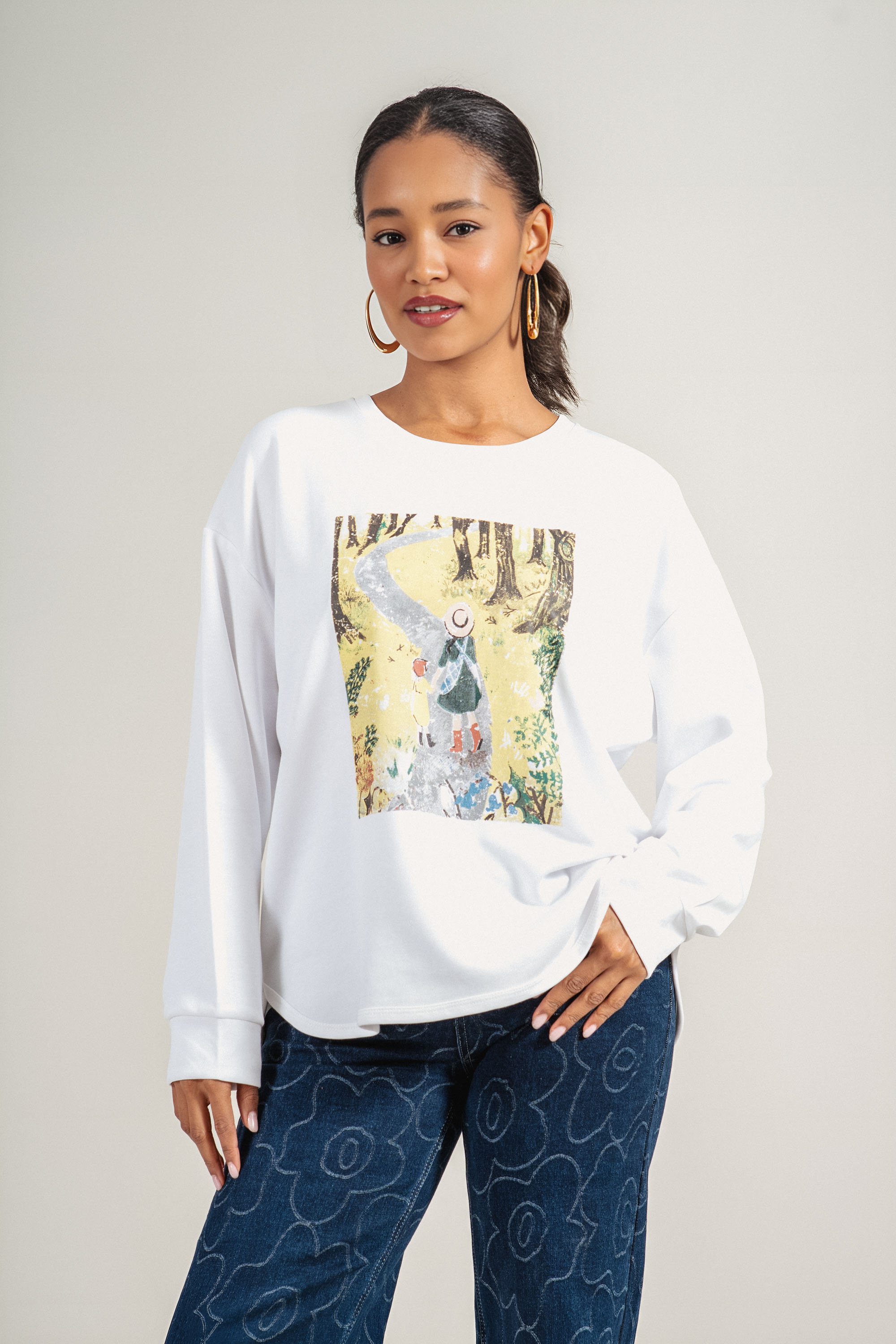 Блуза с оригинален принт - жена и дете на горска пътека съчетаваща артистичен почерк и комфорт. Mатерията е приятна на допир, а свободната кройка и заобленият долен край придават женствен силует. Подходяща за ежедневието и по-креативна визия.