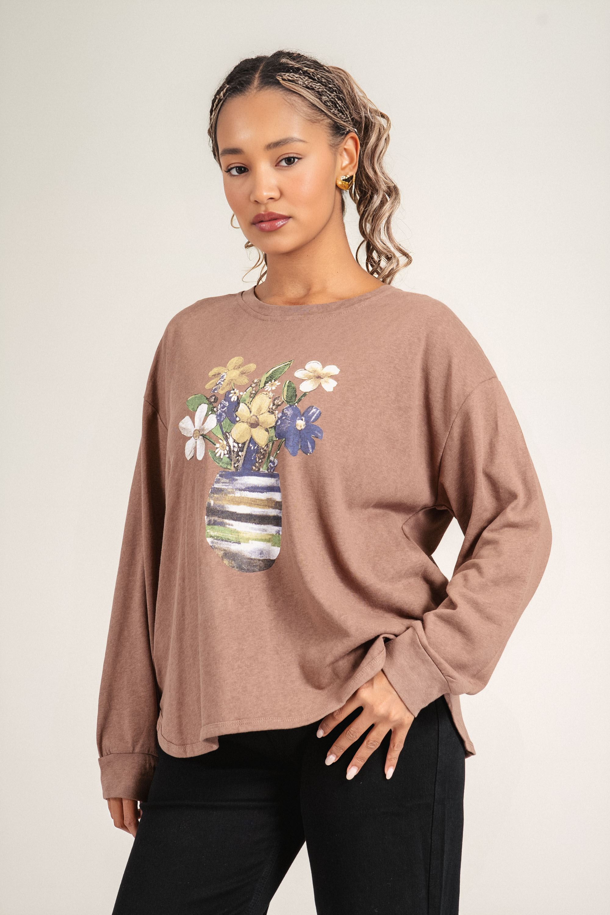 Дамска блуза в кафяв цвят с щампа цветя във ваза