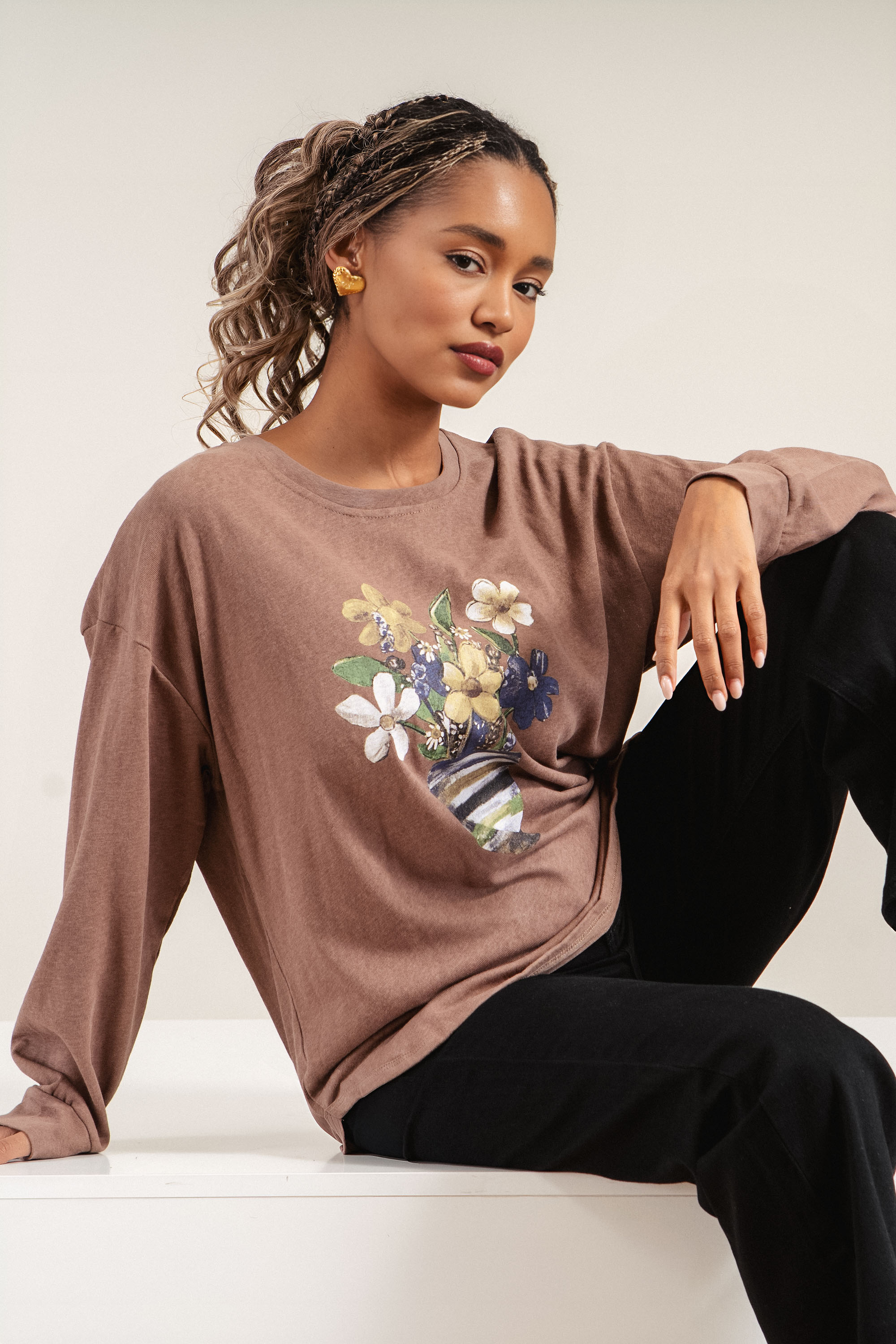 Блуза с оригинален принт – ваза с цветя, съчетаваща артистичен почерк и комфорт. Mатерията е приятна на допир, а свободната кройка и заобленият долен край придават женствен силует. Подходяща за ежедневието и по-креативна визия.
