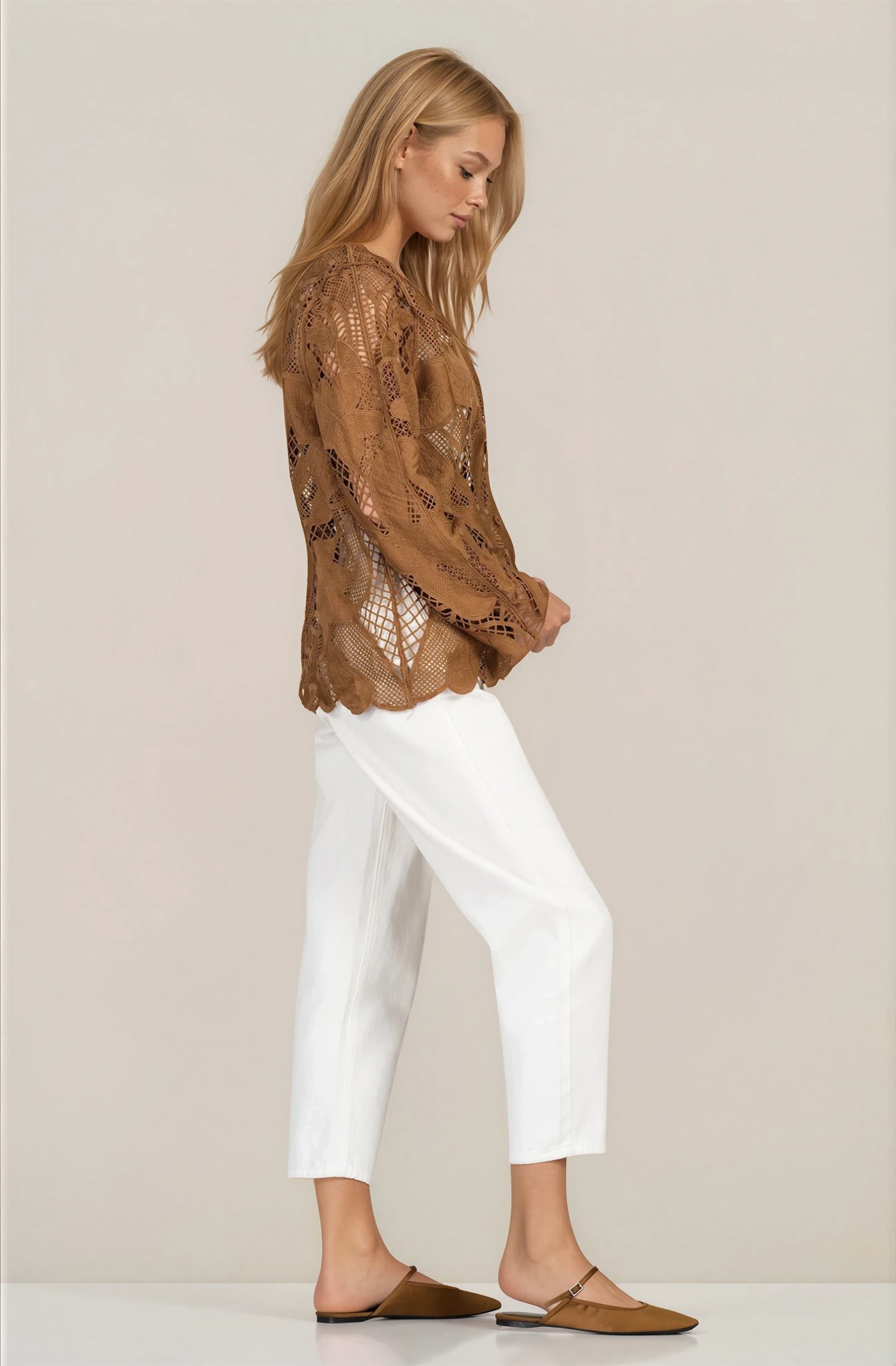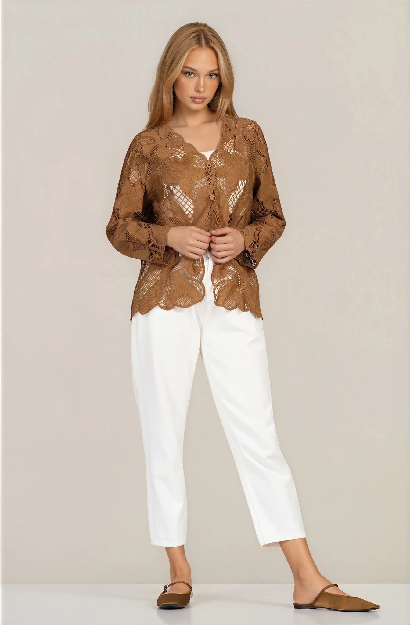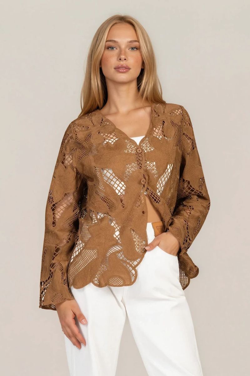 Дамска блуза в кафяво с рязана бродерия и копчета