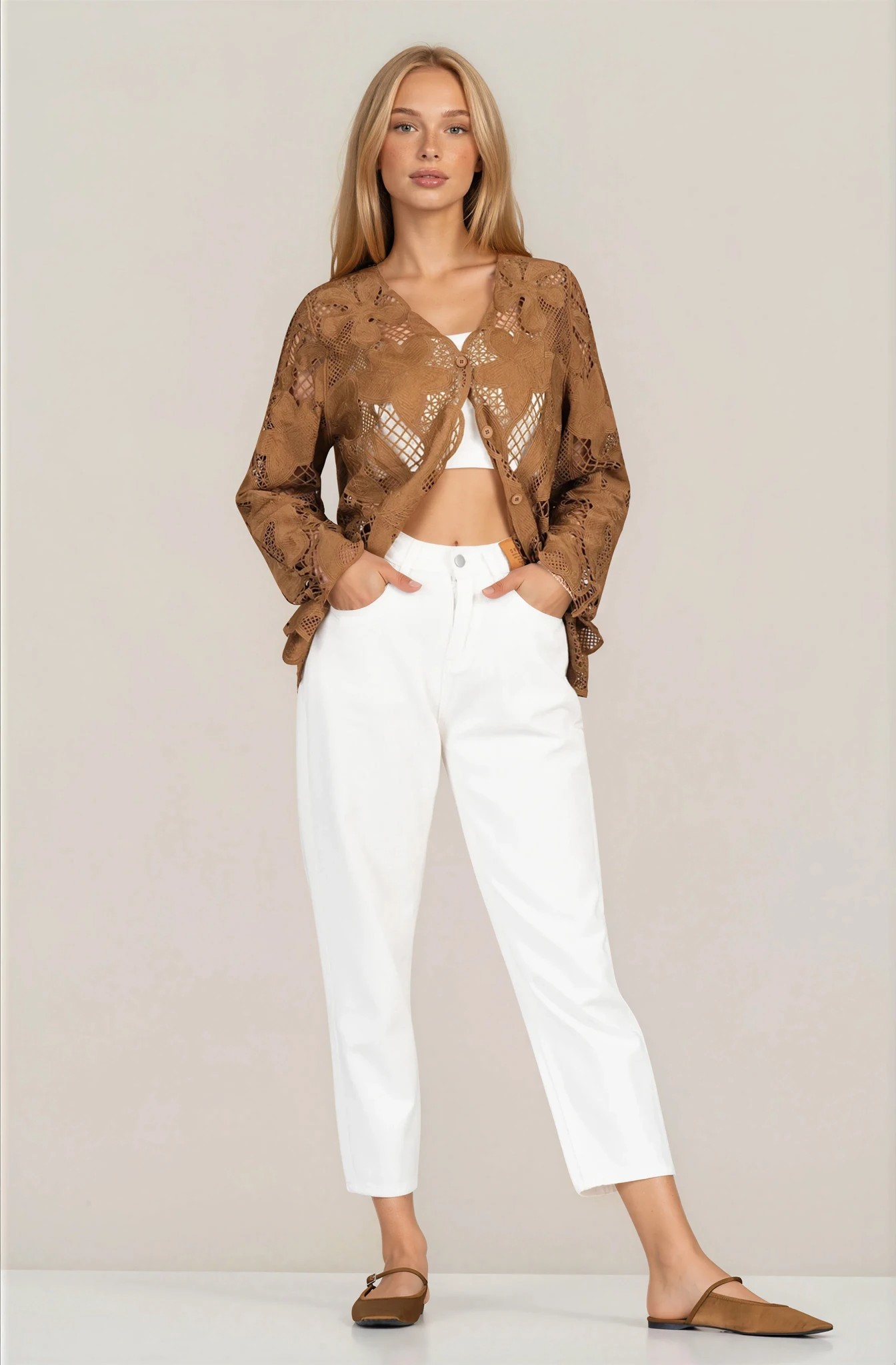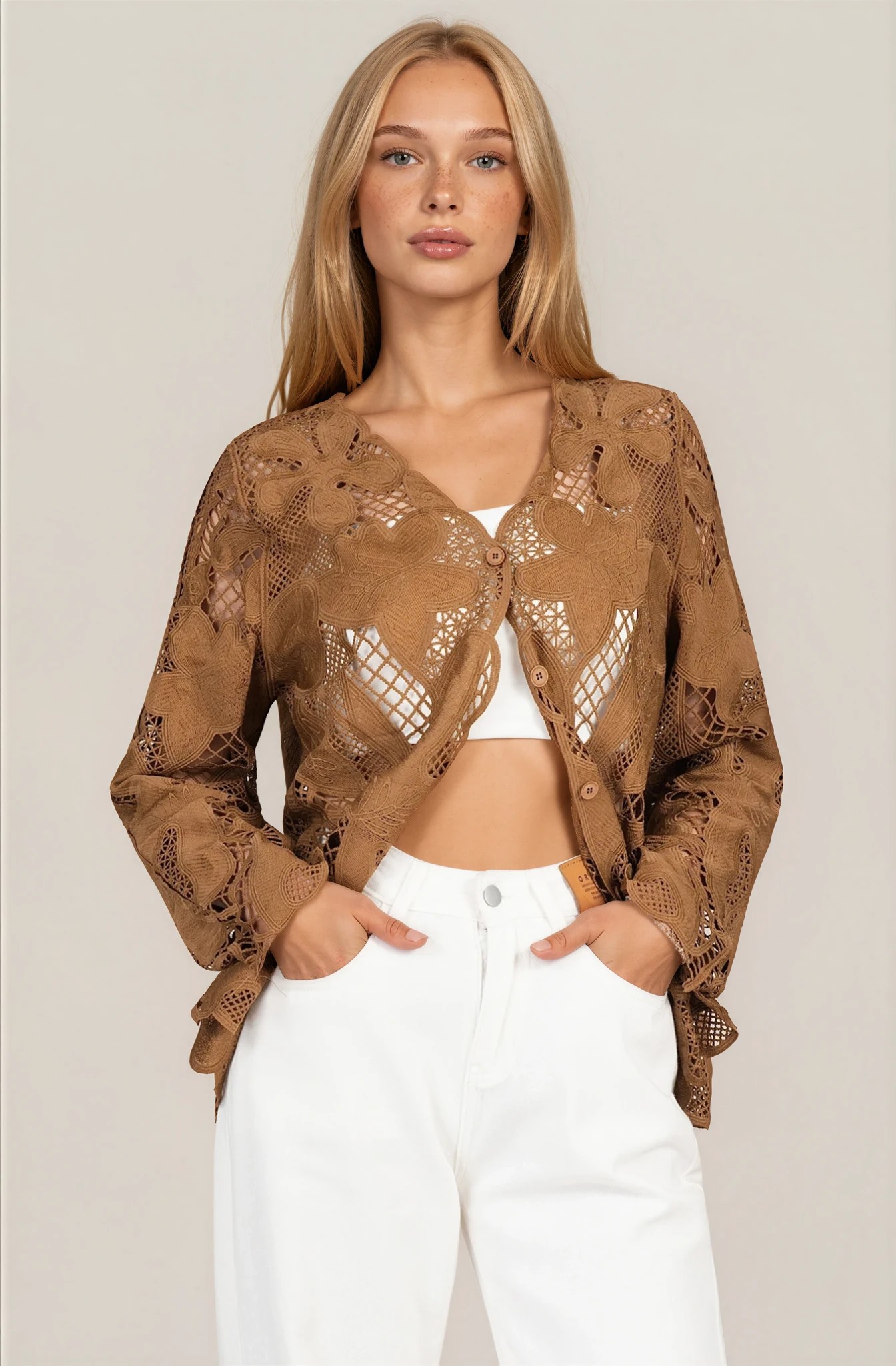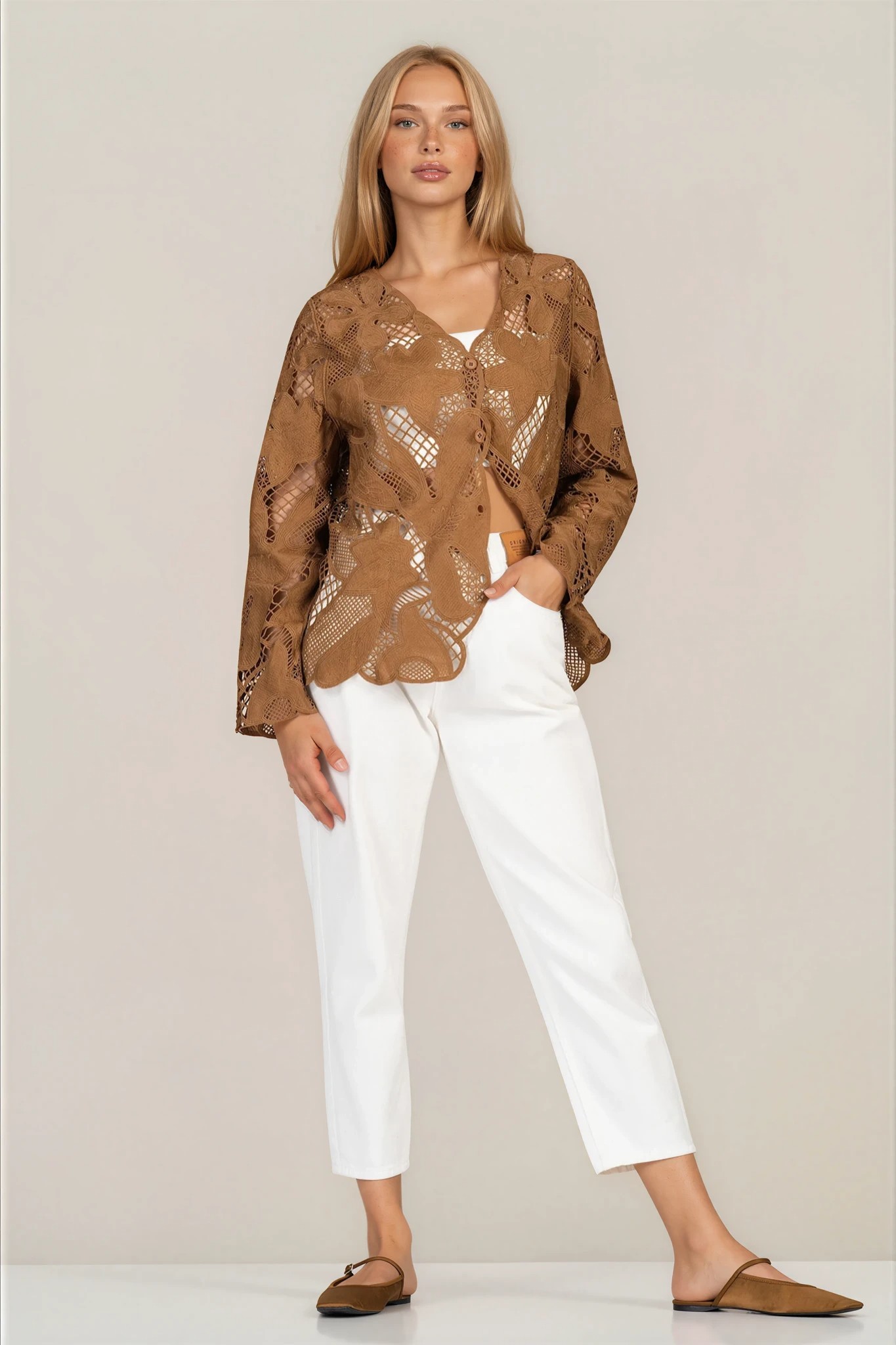 Дамска блуза в кафяво с рязана бродерия и копчета
