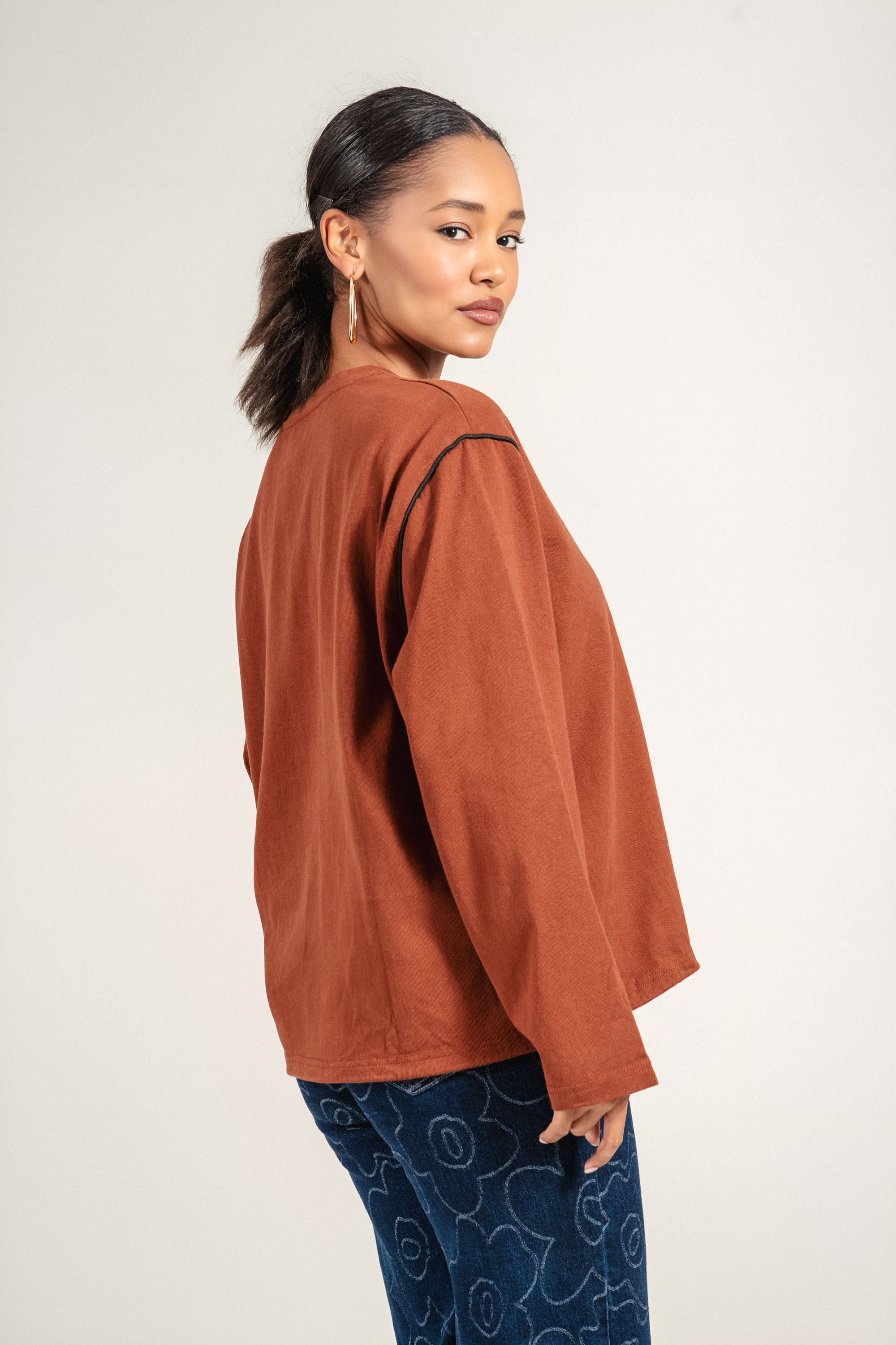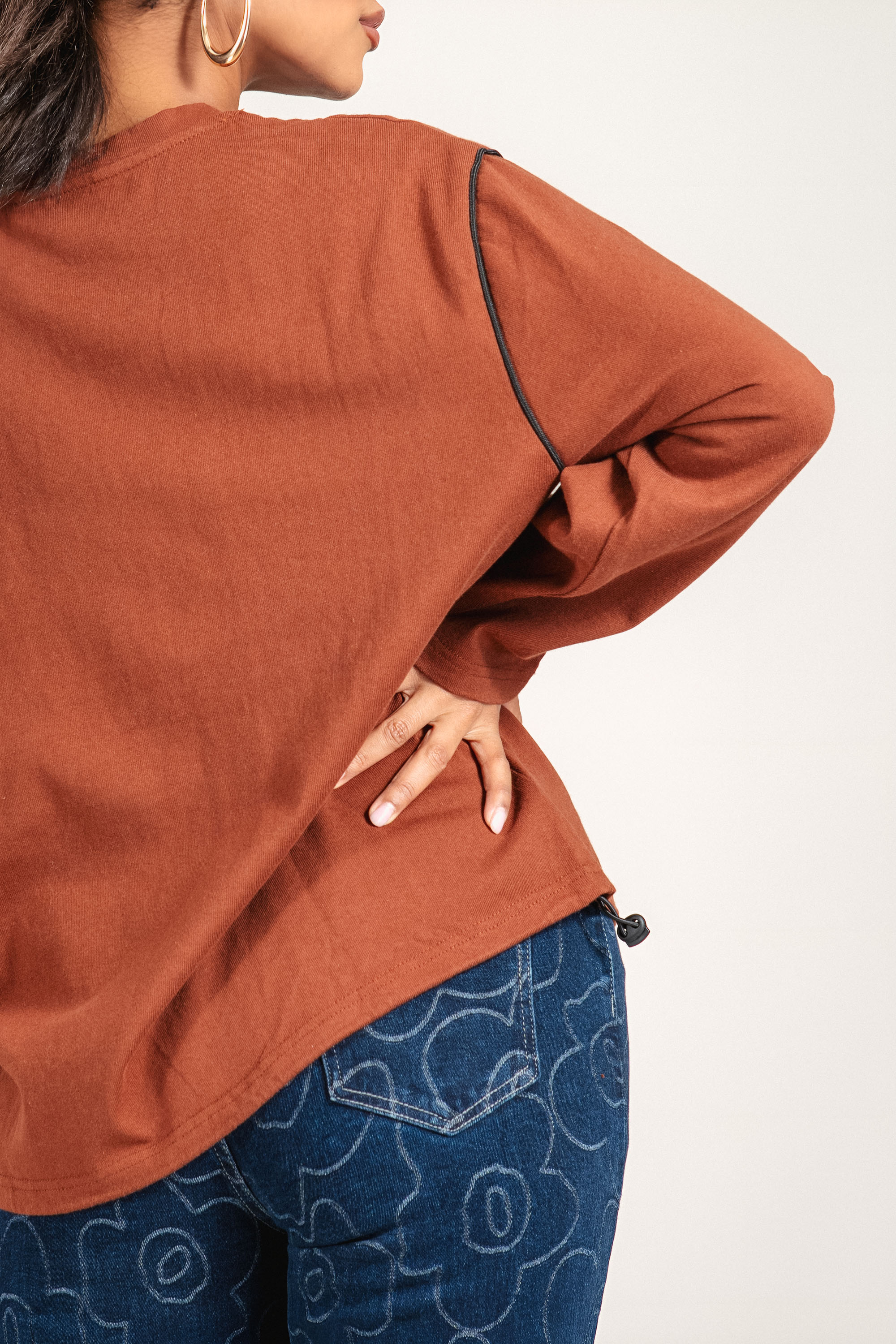 Дамска блуза в керемидено кафяво с бродирано момиче с шапка